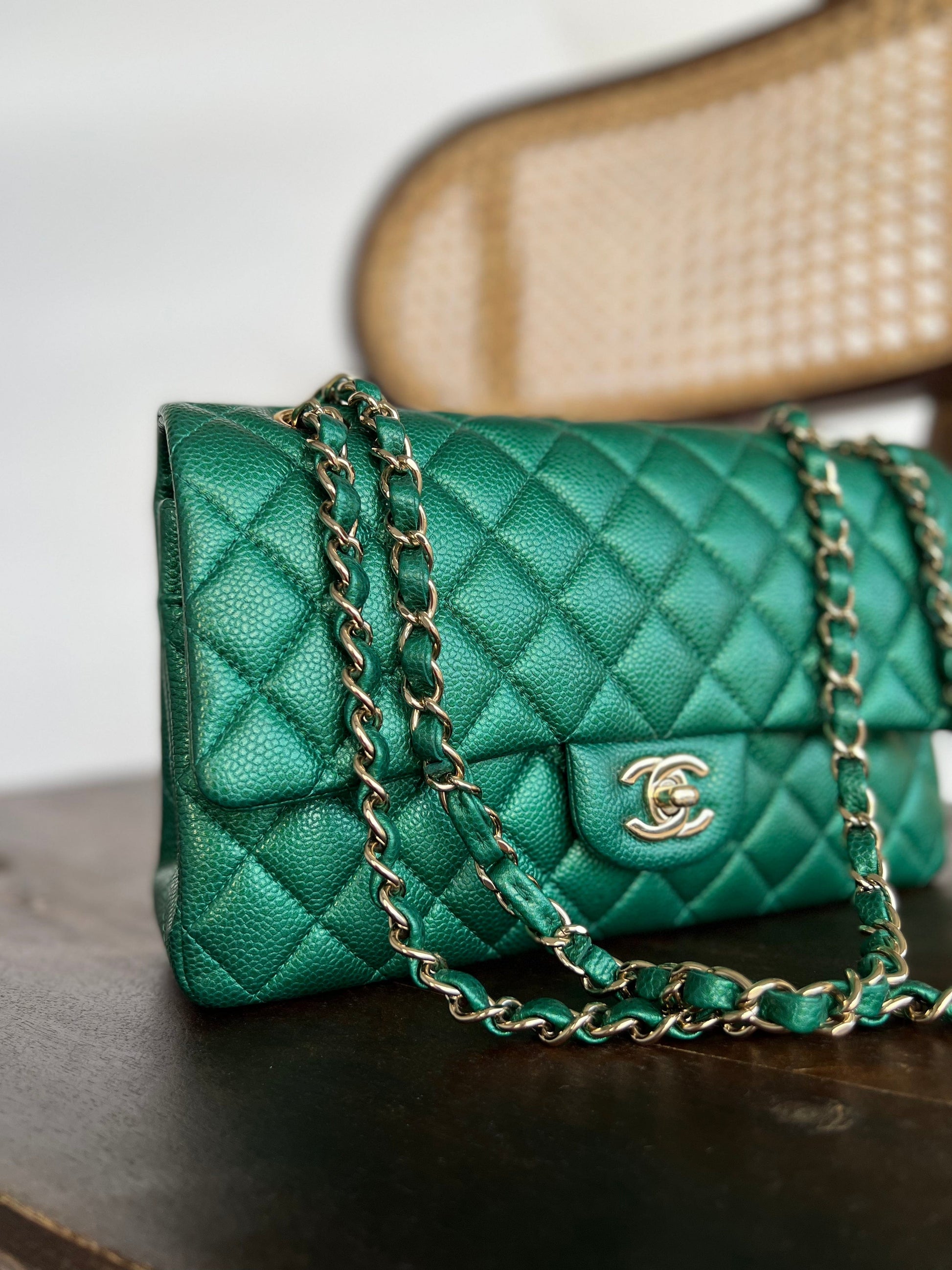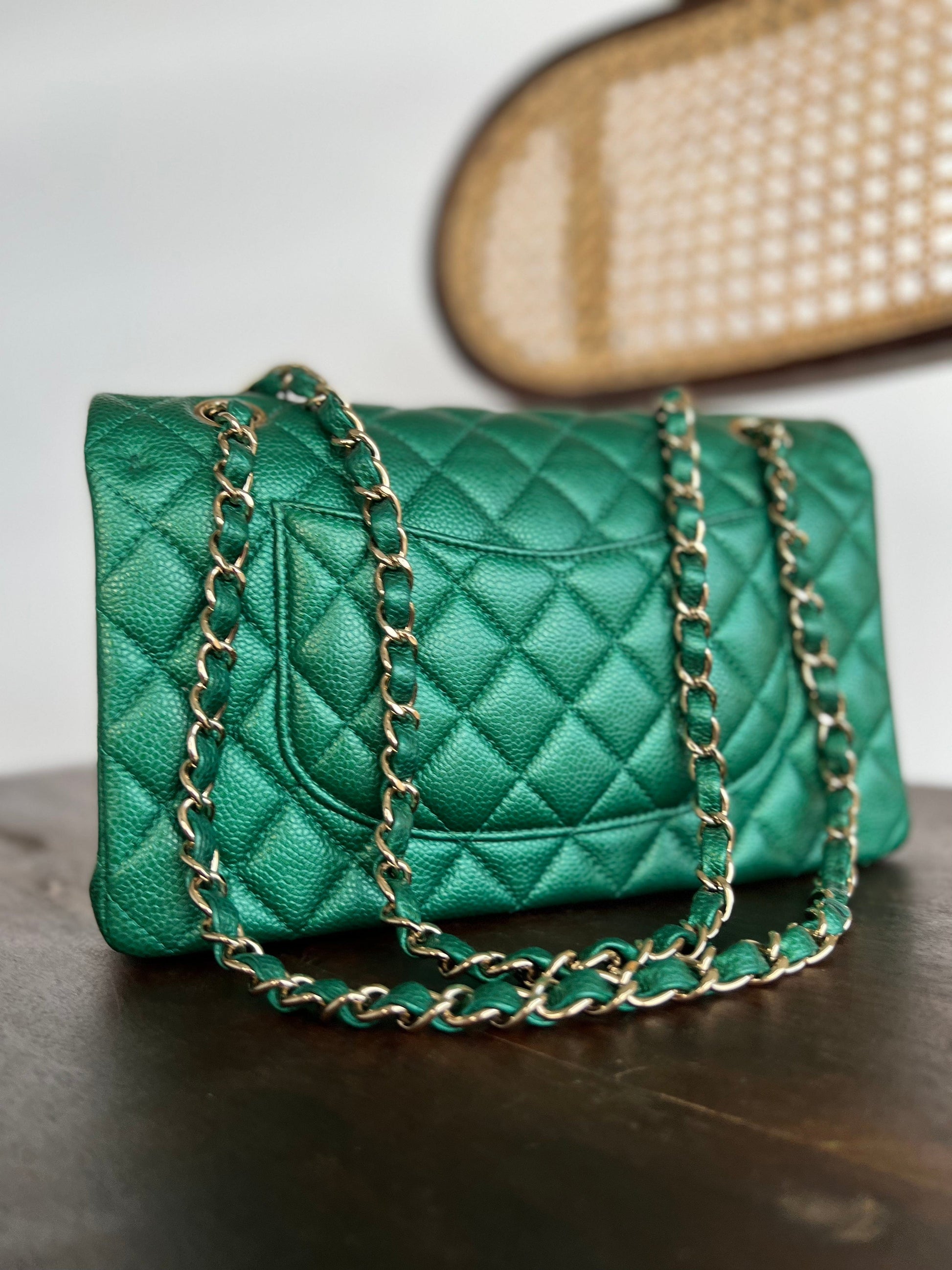 18S Emerald Green Caviar Quilted Classic Flap Medium Light Gold Hardware