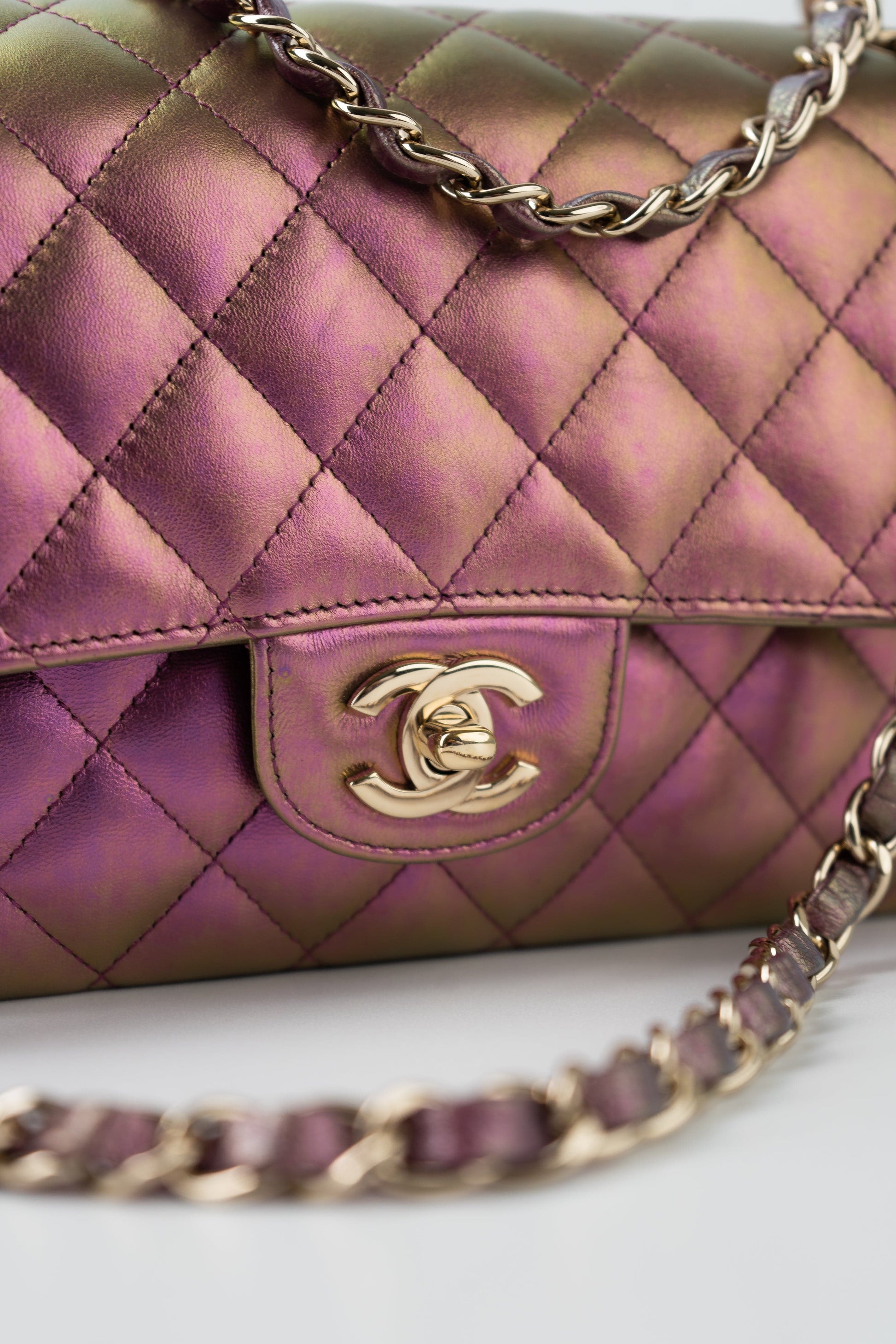 20B Purple Iridescent Lambskin Quilted Classic Flap Medium w/ Edge Stitching