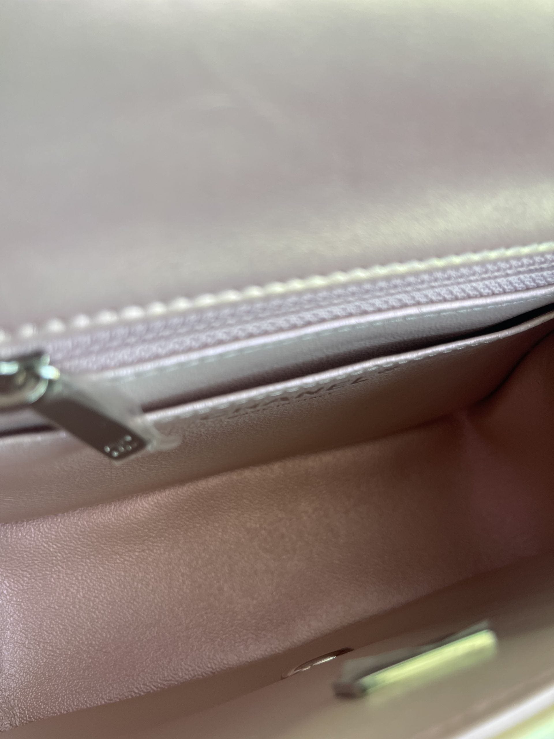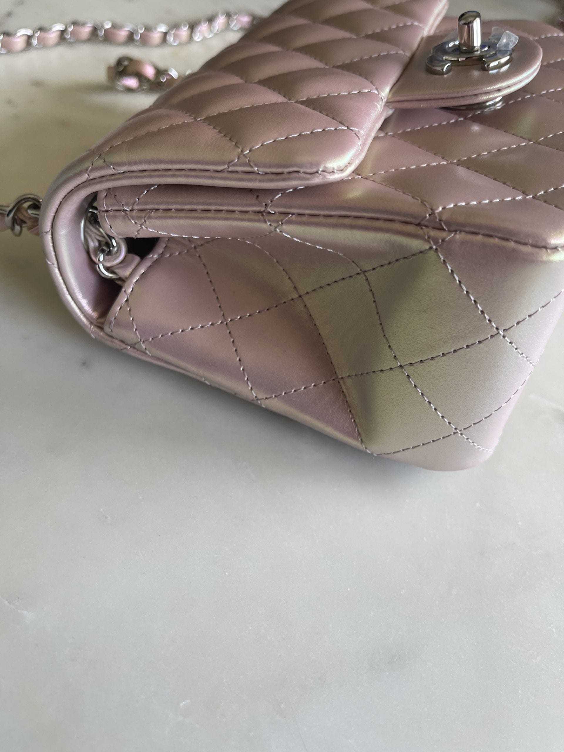 21K Mini Pink Iridescent Square Lambskin Quilted Classic Flap SHW