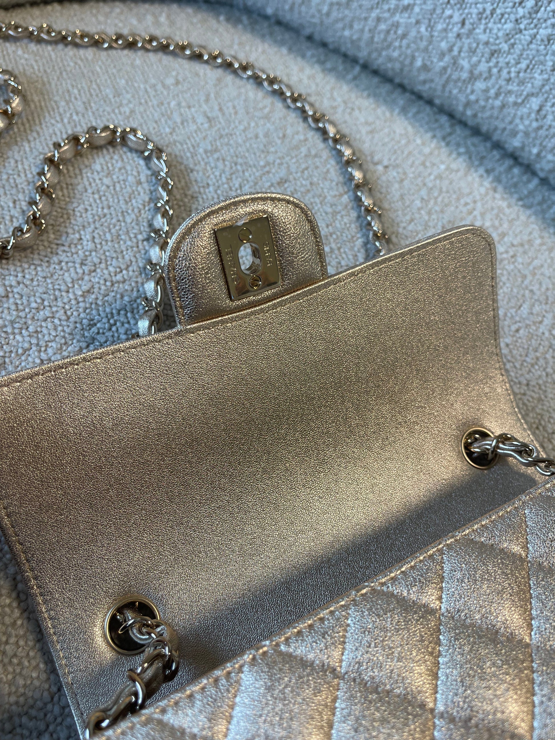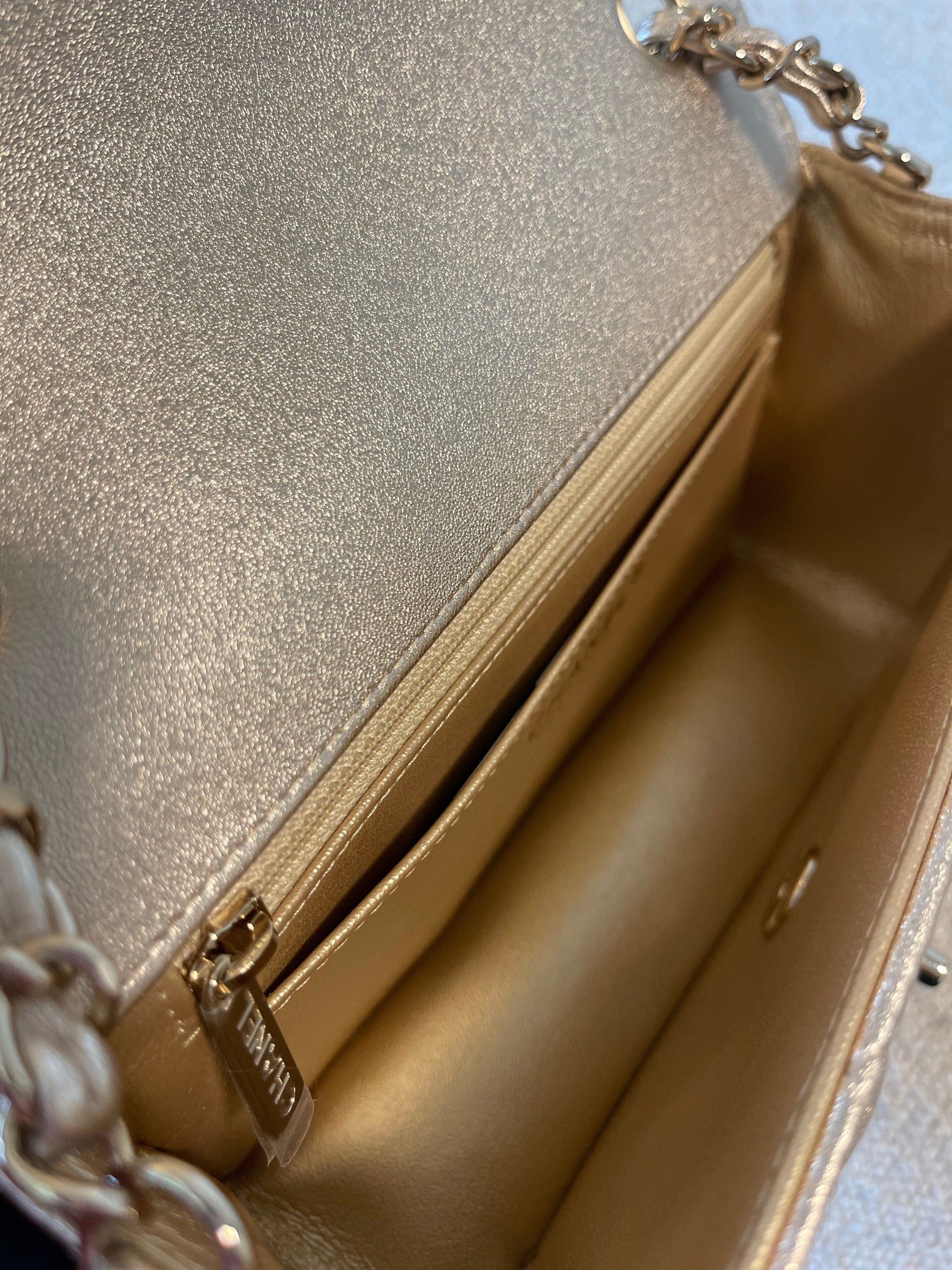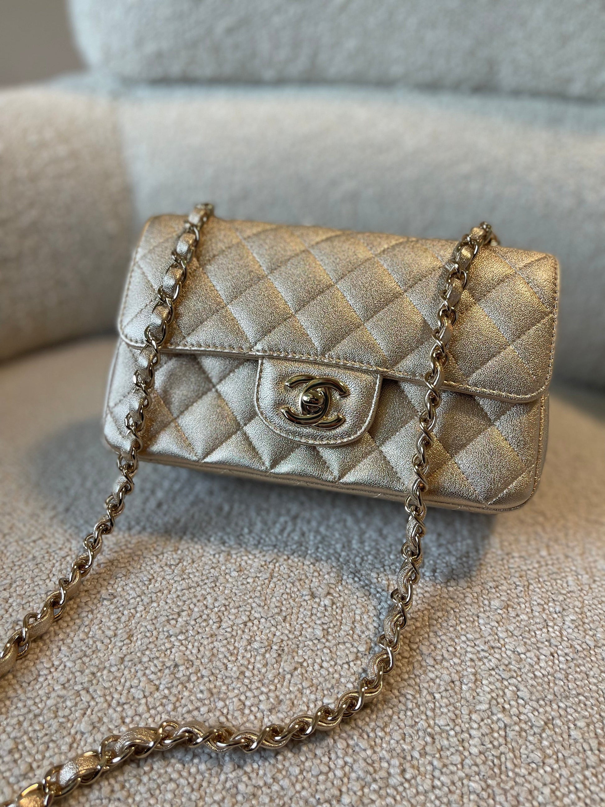 21P GOLD METALLIC CAVIAR QUILTED MINI RECTANGULAR SINGLE FLAP LIGHT GOLD HARDWARE