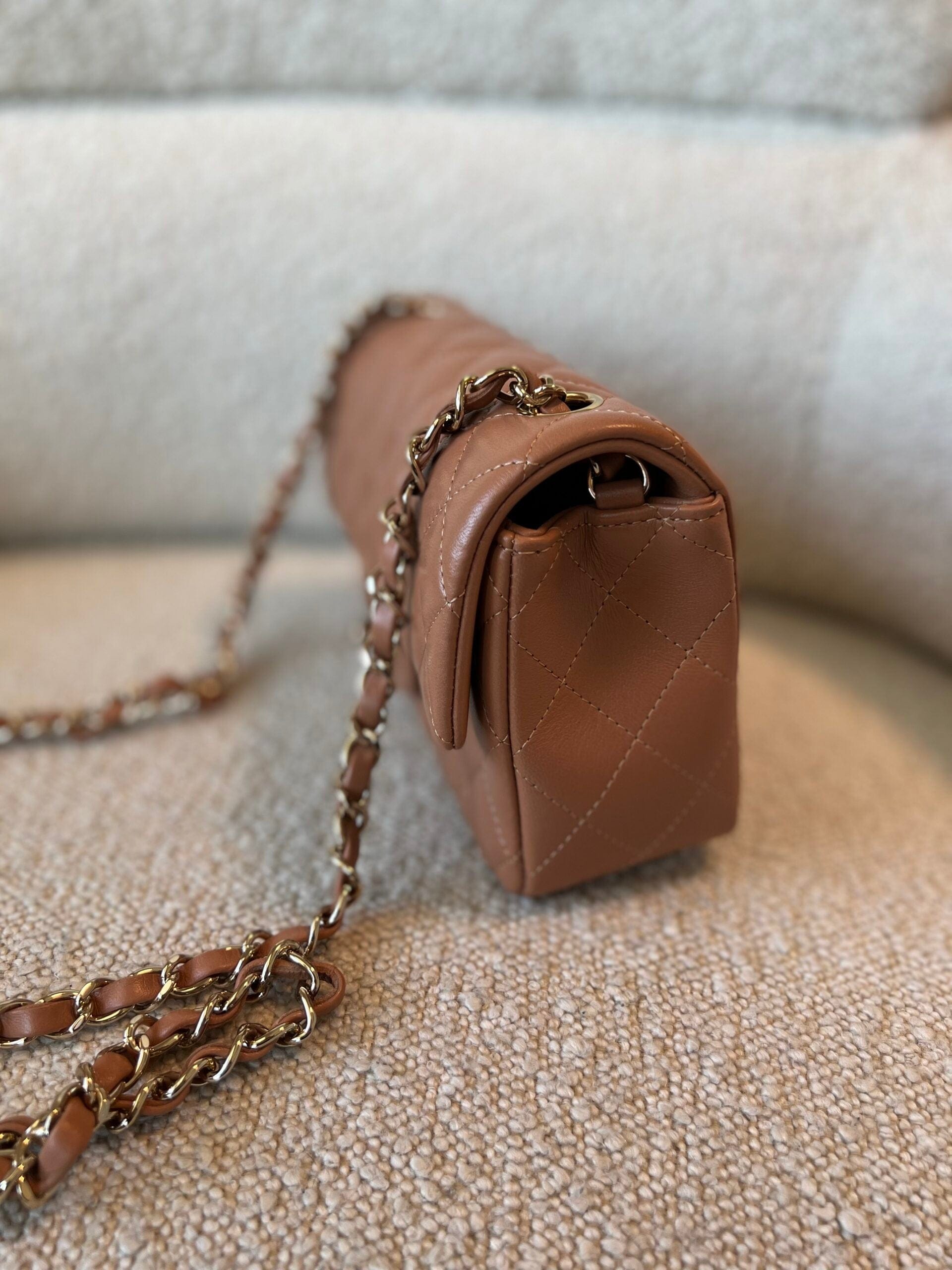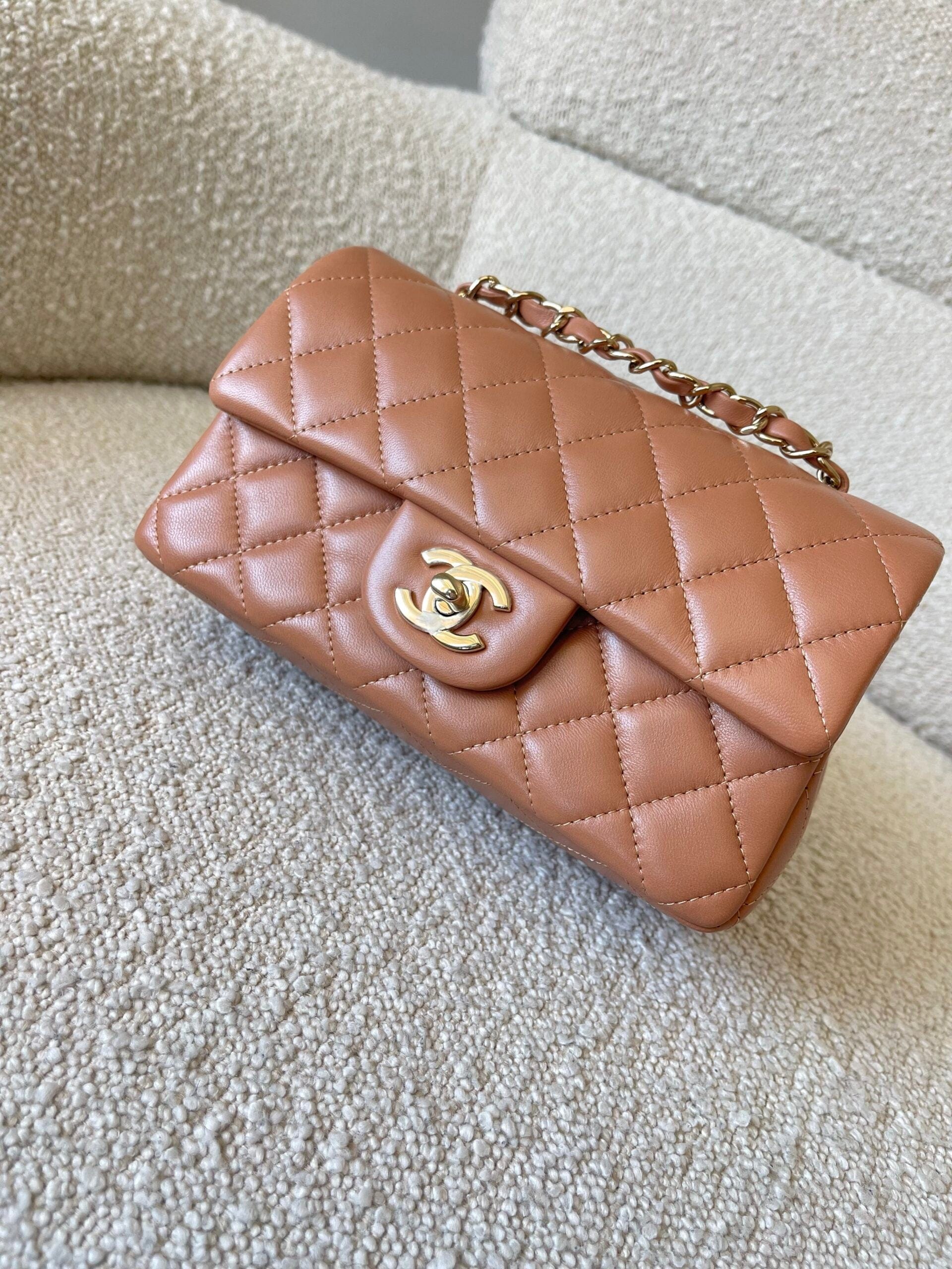 21P Mini Rectangular Caramel Lambskin Quilted Flap Light Gold Hardware