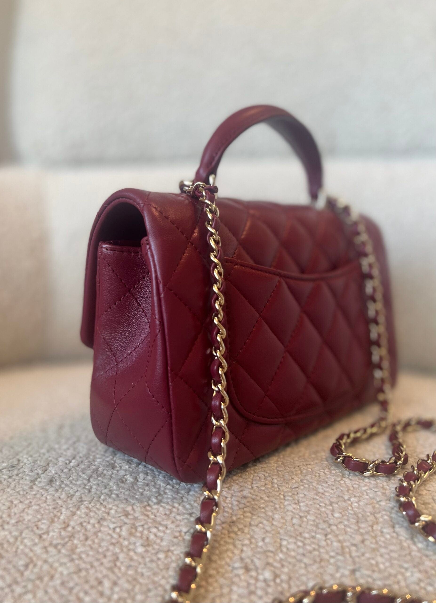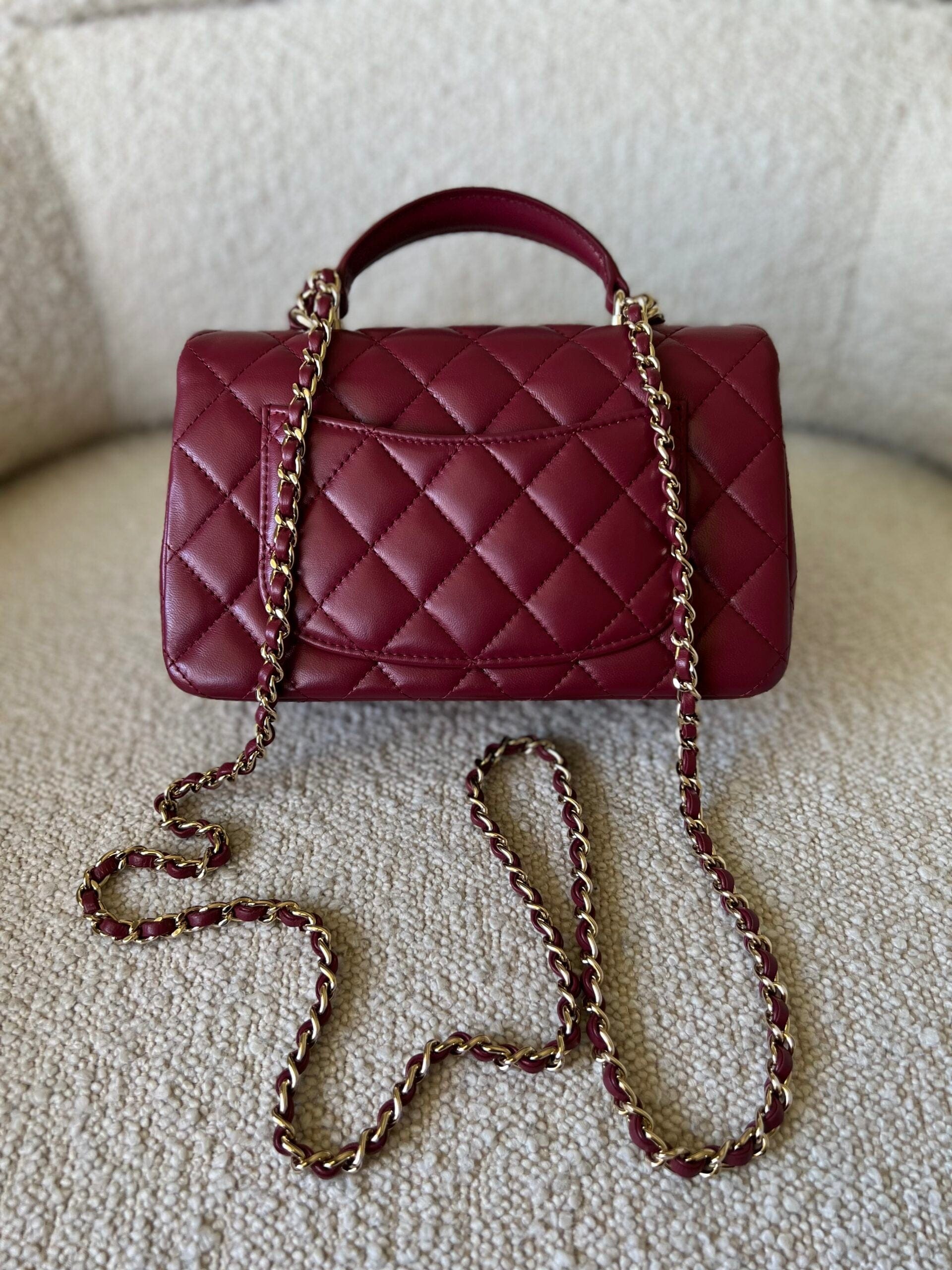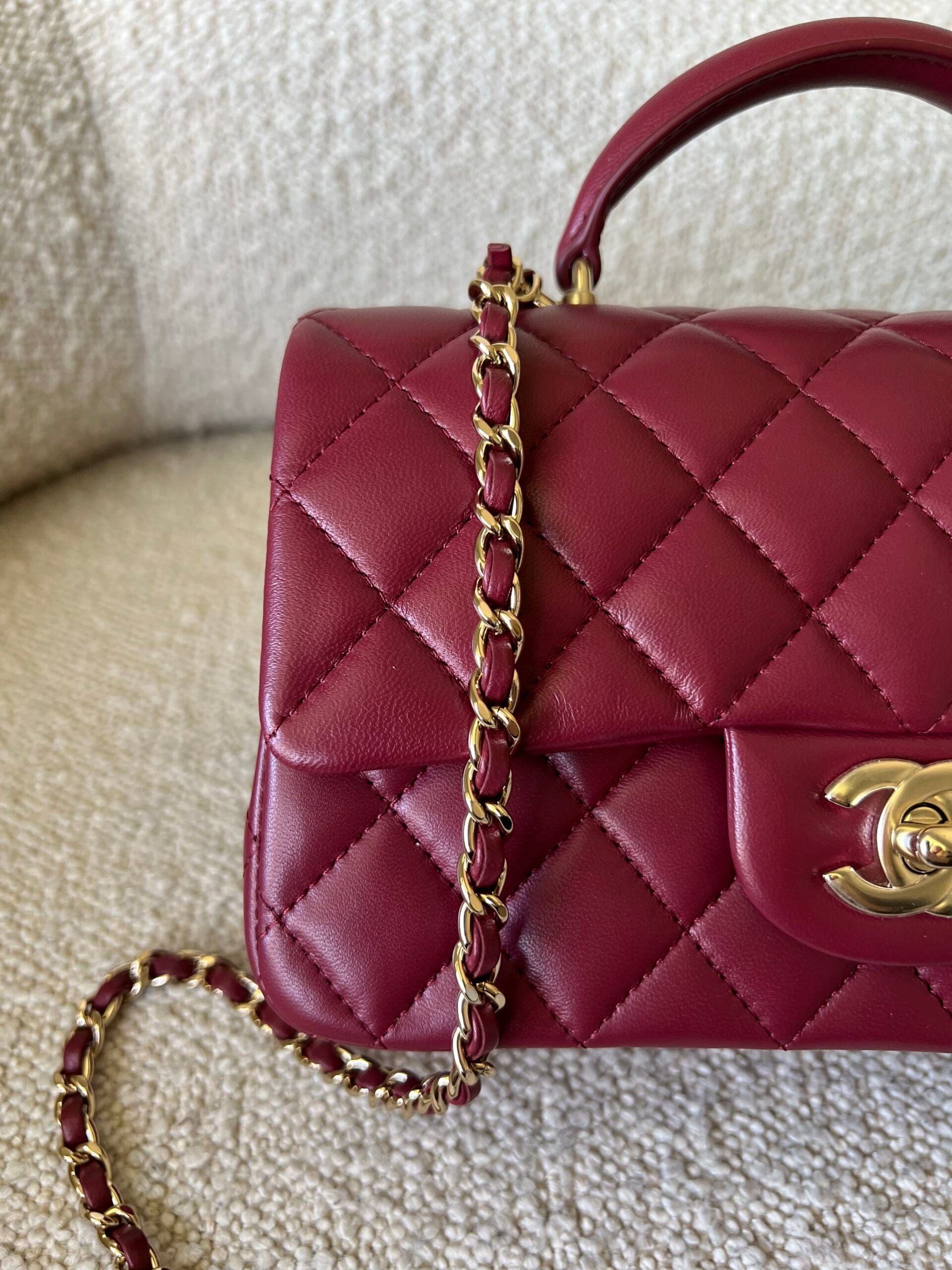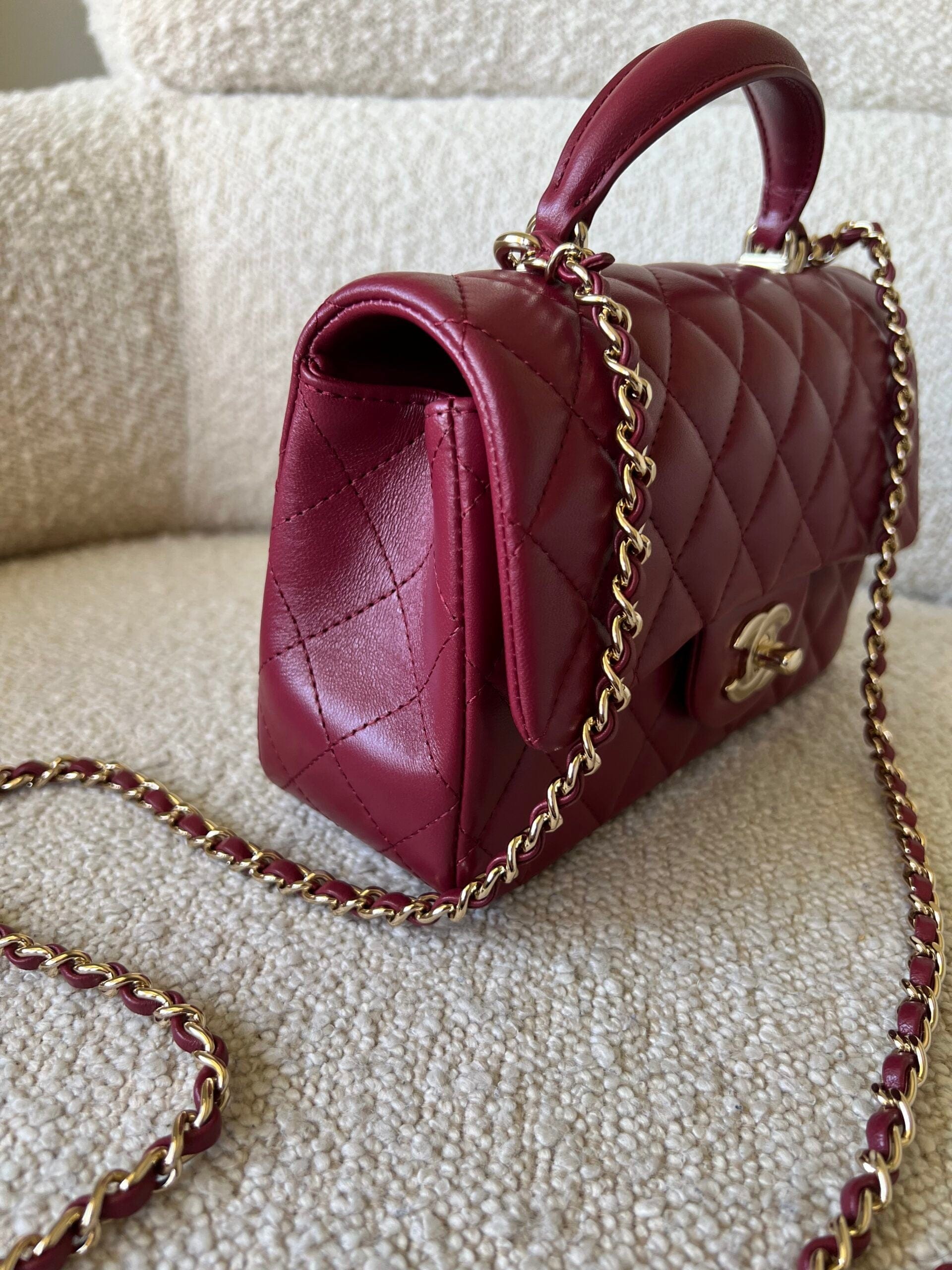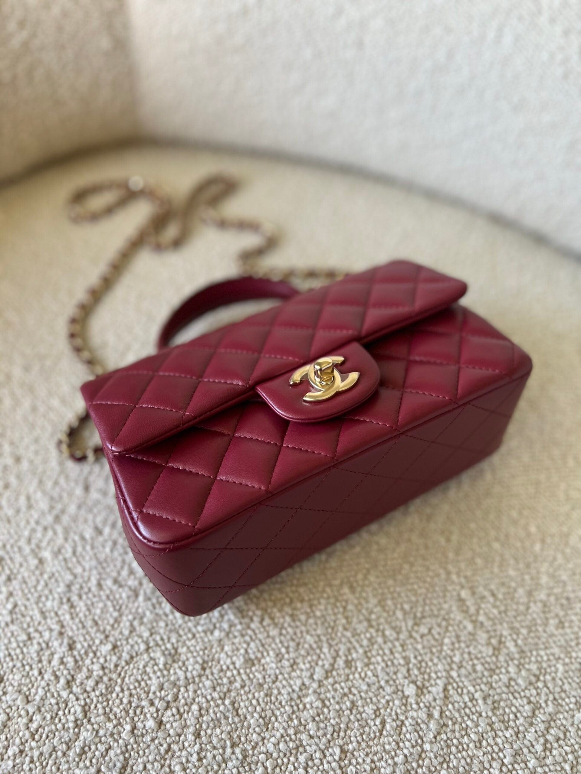 22A Mini Burgundy Lambskin Quilted Single Flap with Top handle Light Gold Hardware