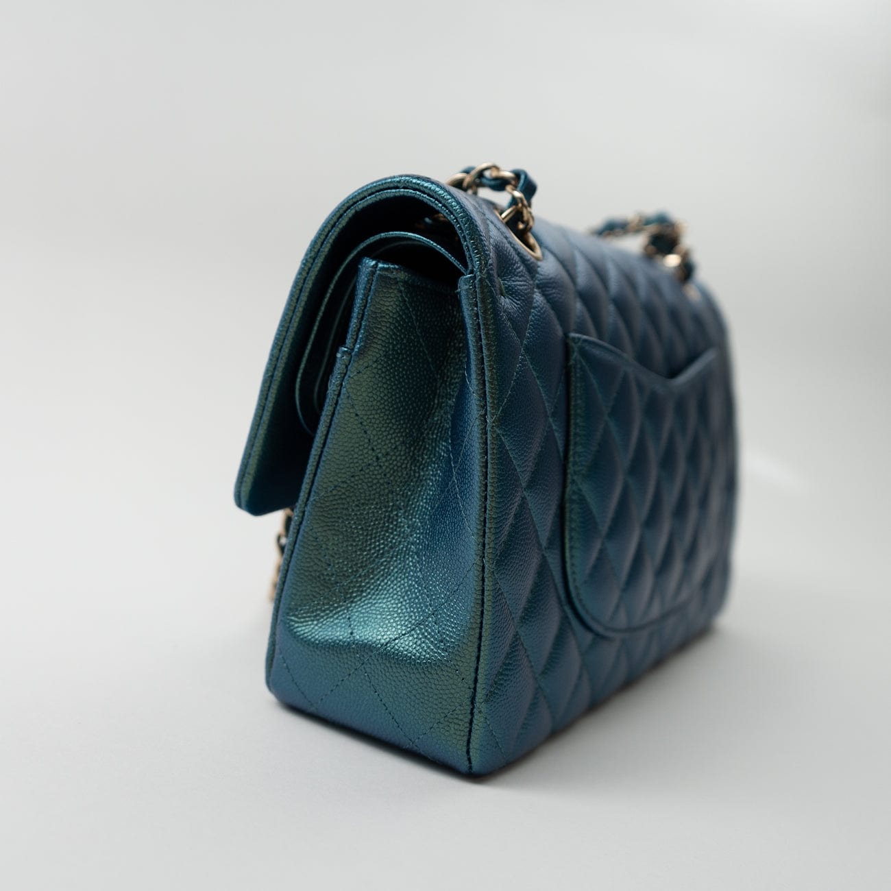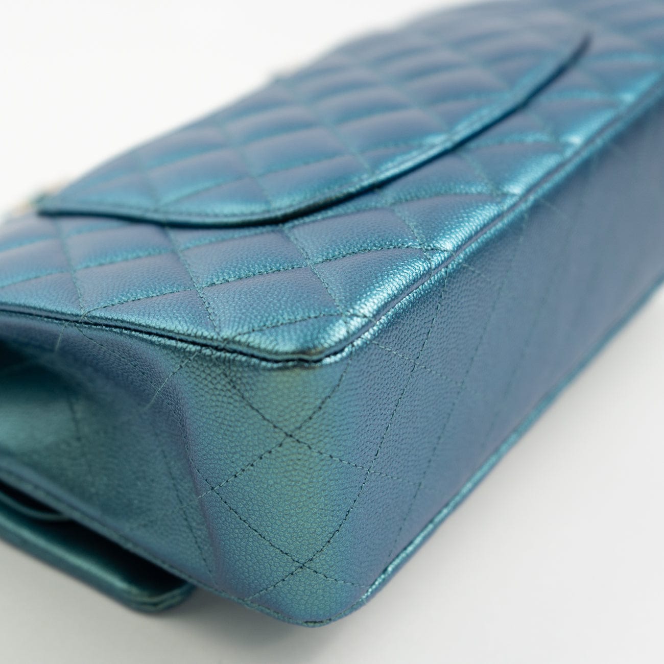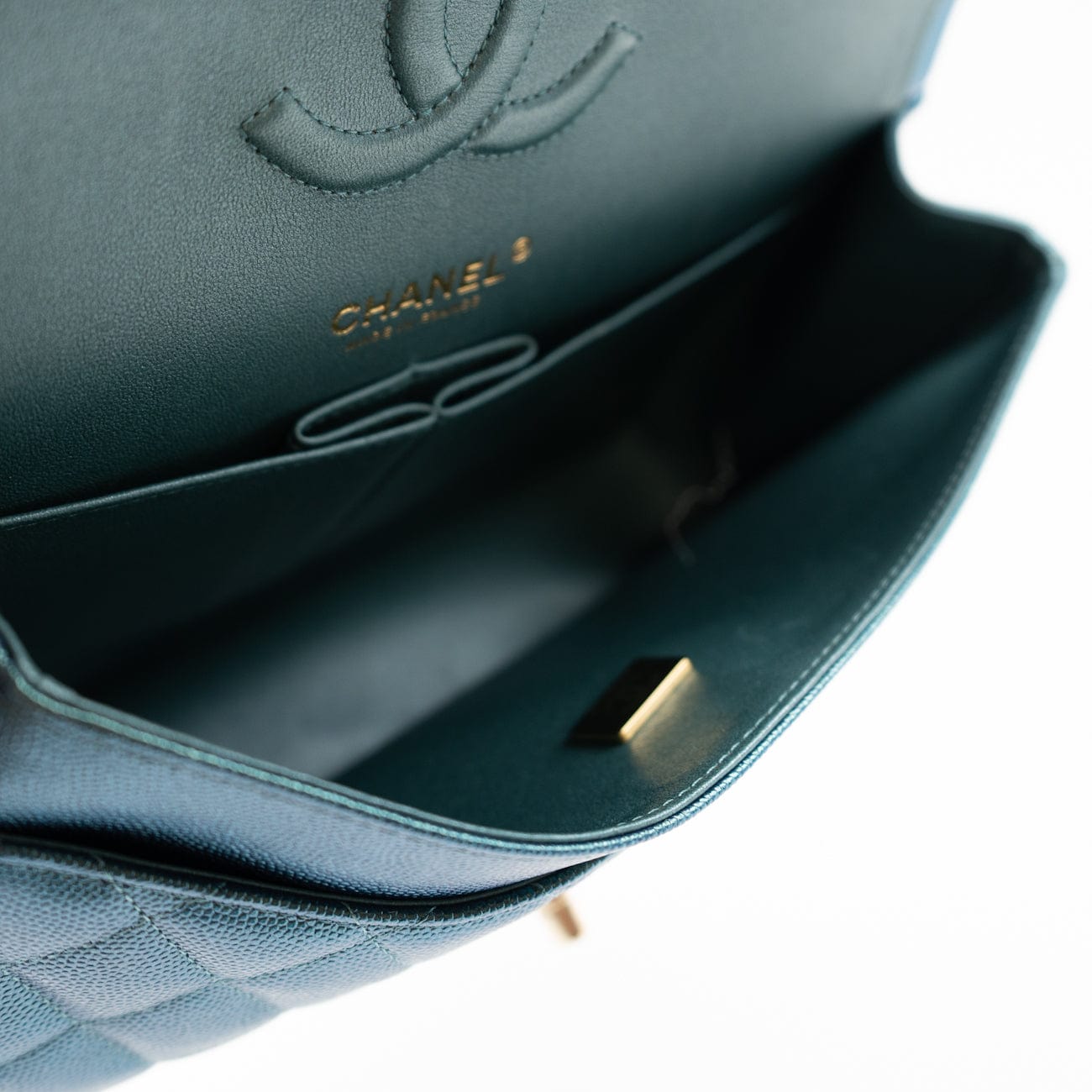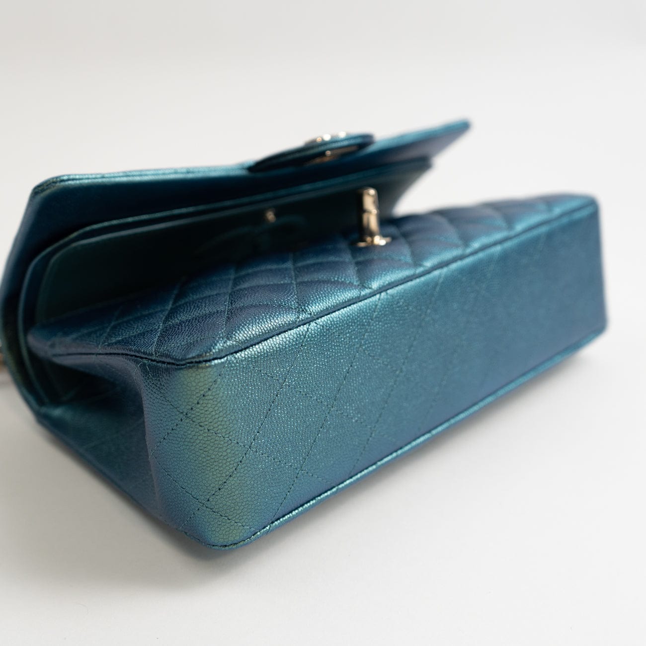 22P Iridescent Green Caviar Quilted Classic Flap Medium Light Gold Hardware