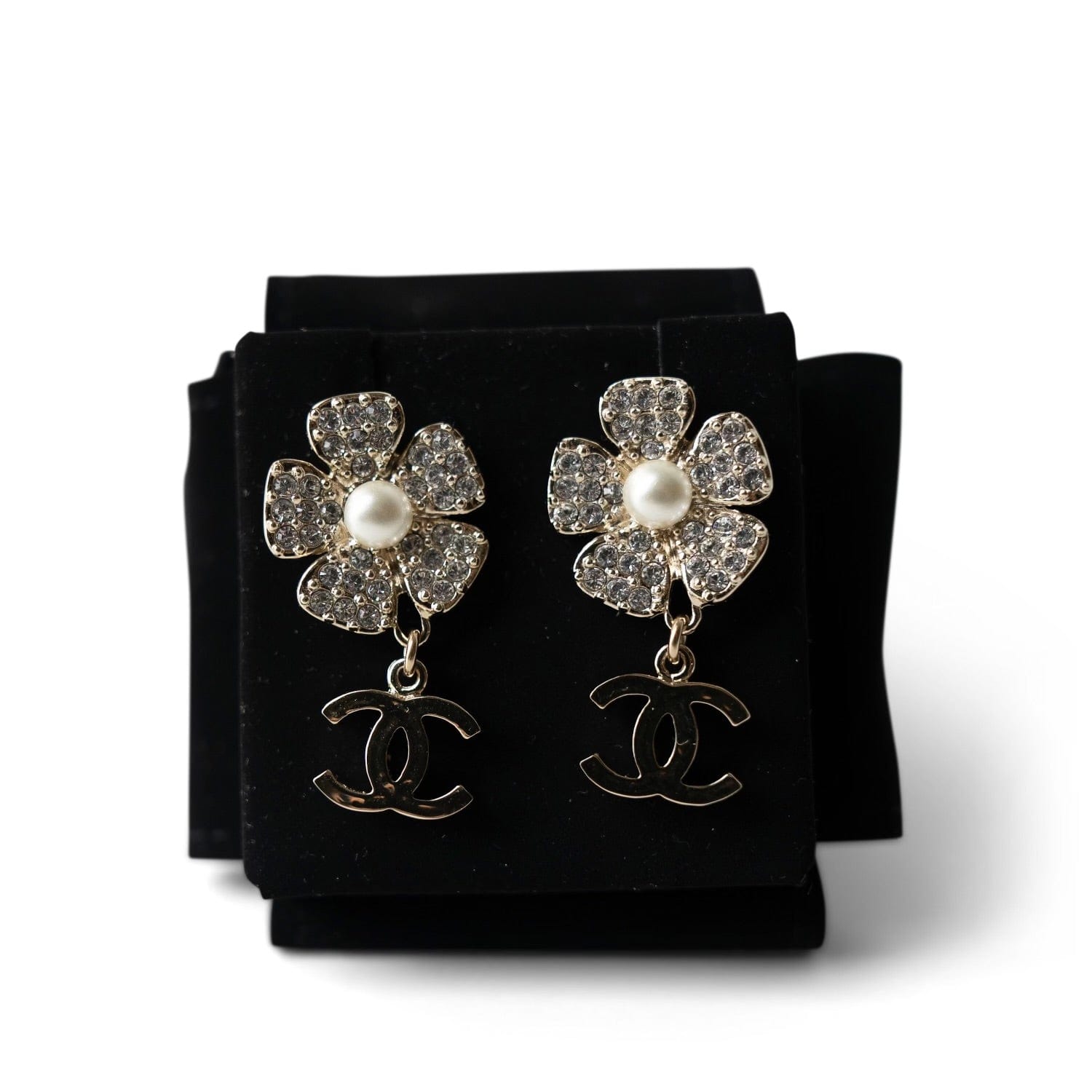 23S Gold Pearl Crystal Flower Drop CC Earrings