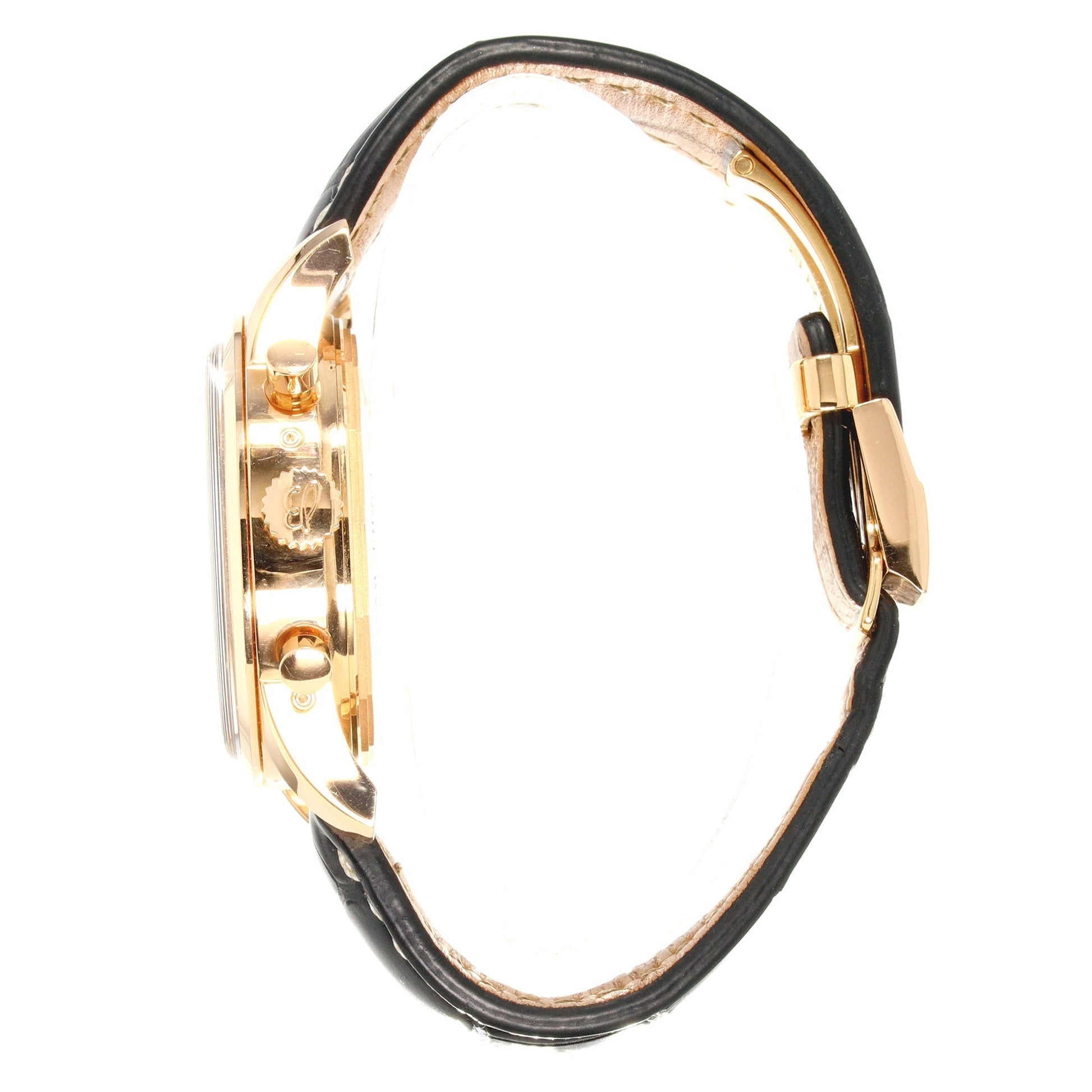 The black alligator strap is equipped with a matching red gold deployment clasp.