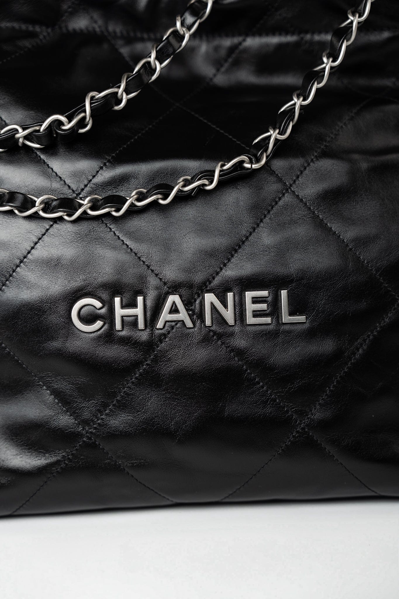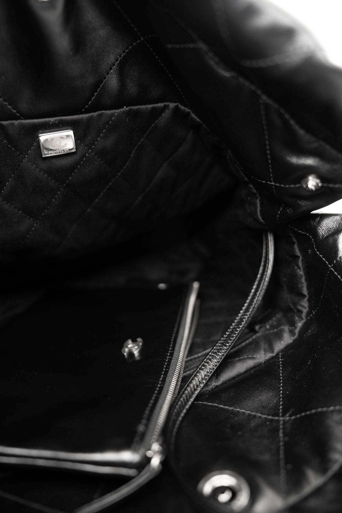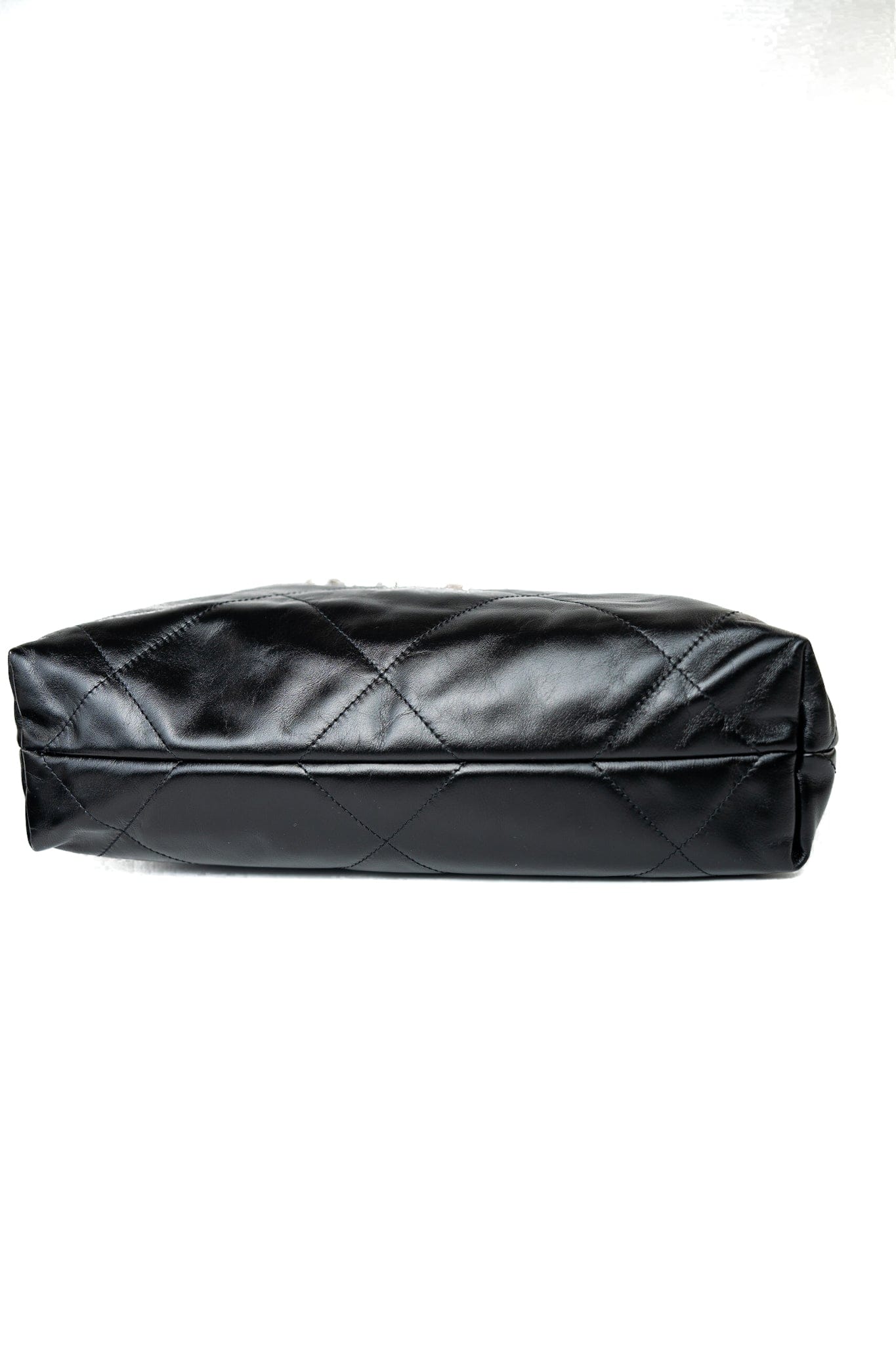 Black Calfskin Quilted Drawstring 22 Bag Small Antique Silver Hardware