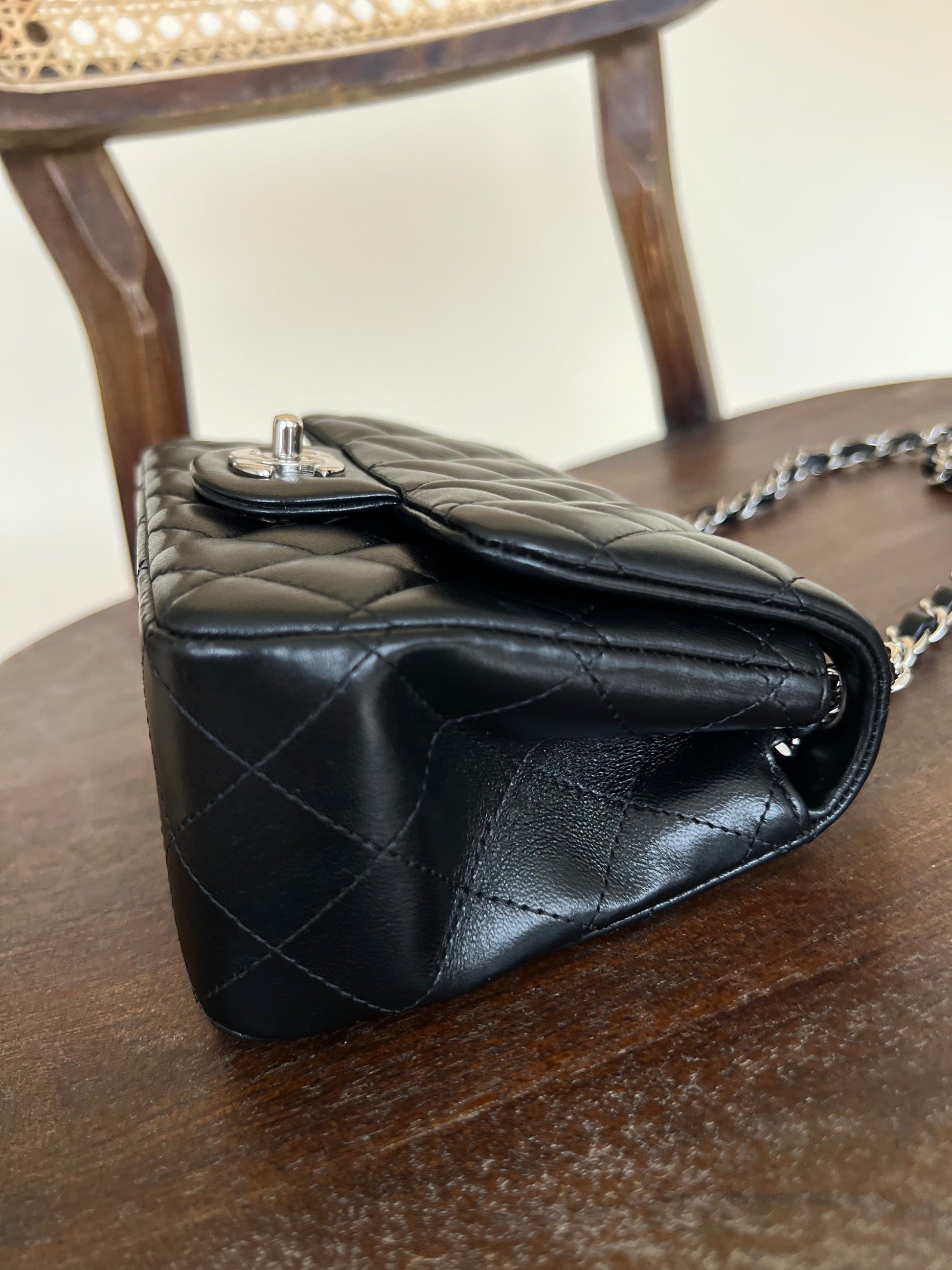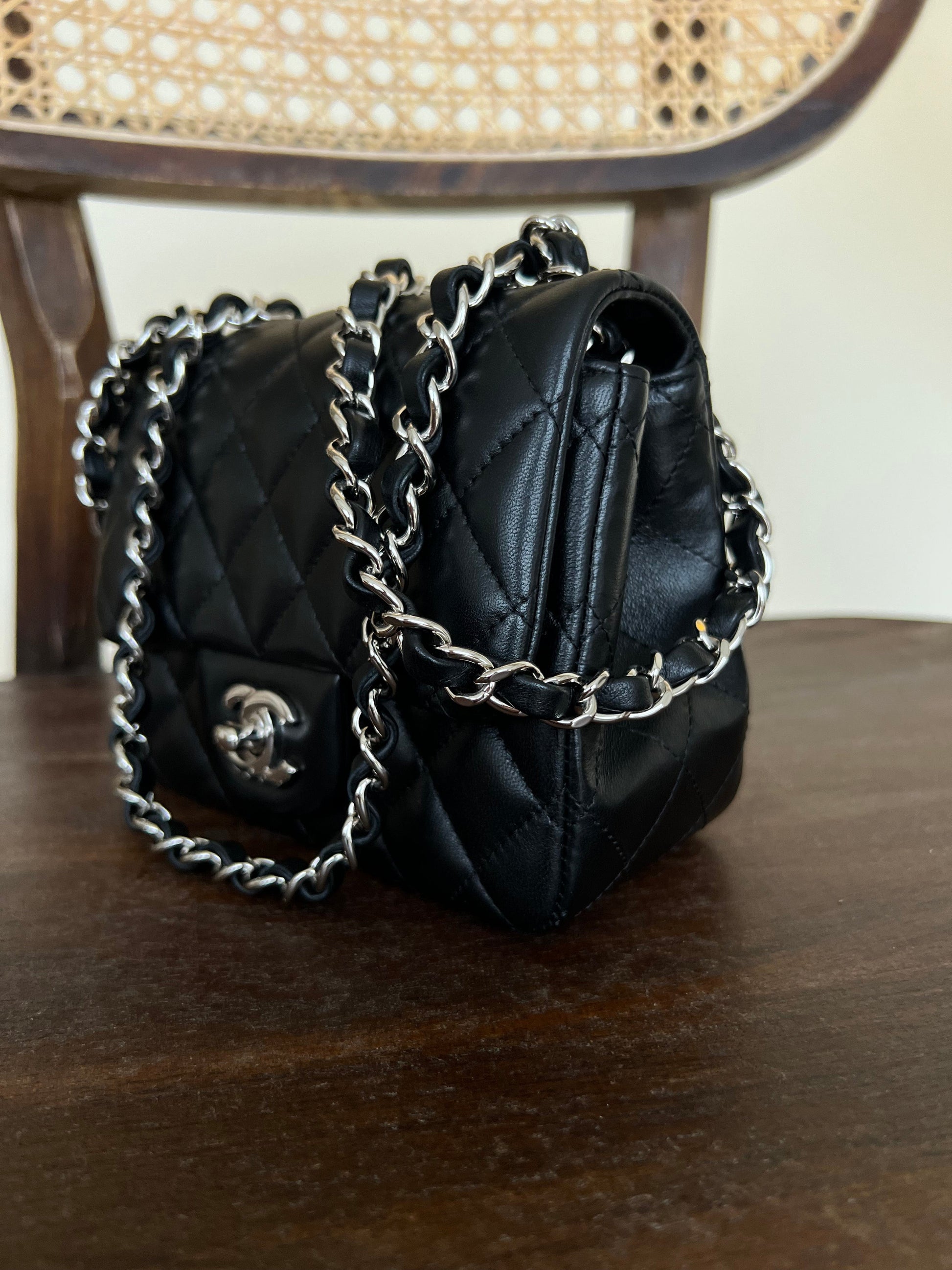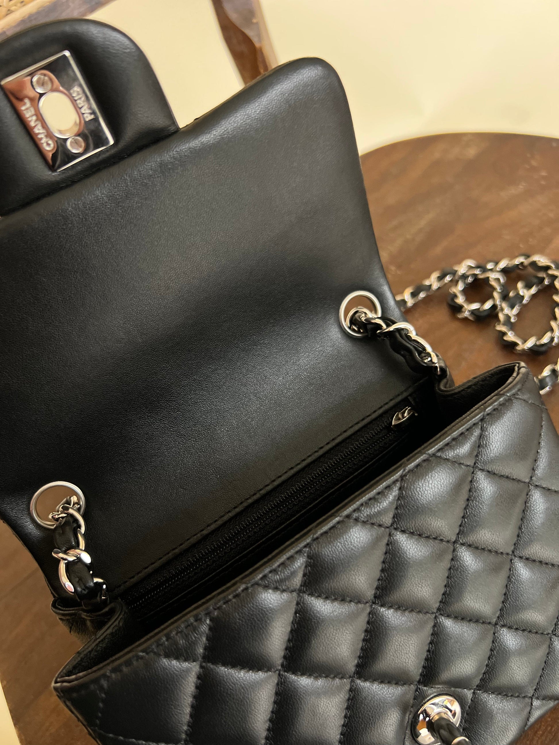 CHANEL BLACK MINI SQUARE LAMBSKIN QUILTED FLAP SILVER HARDWARE