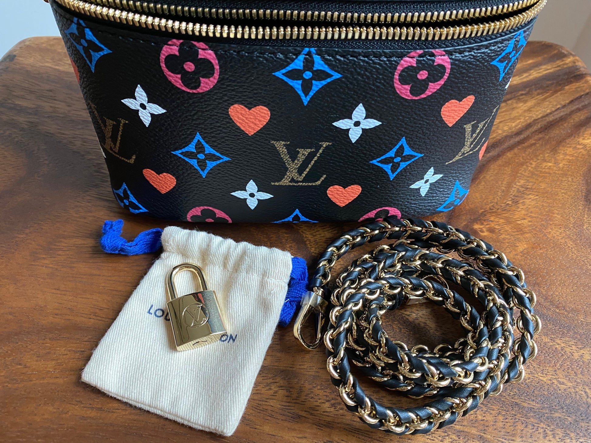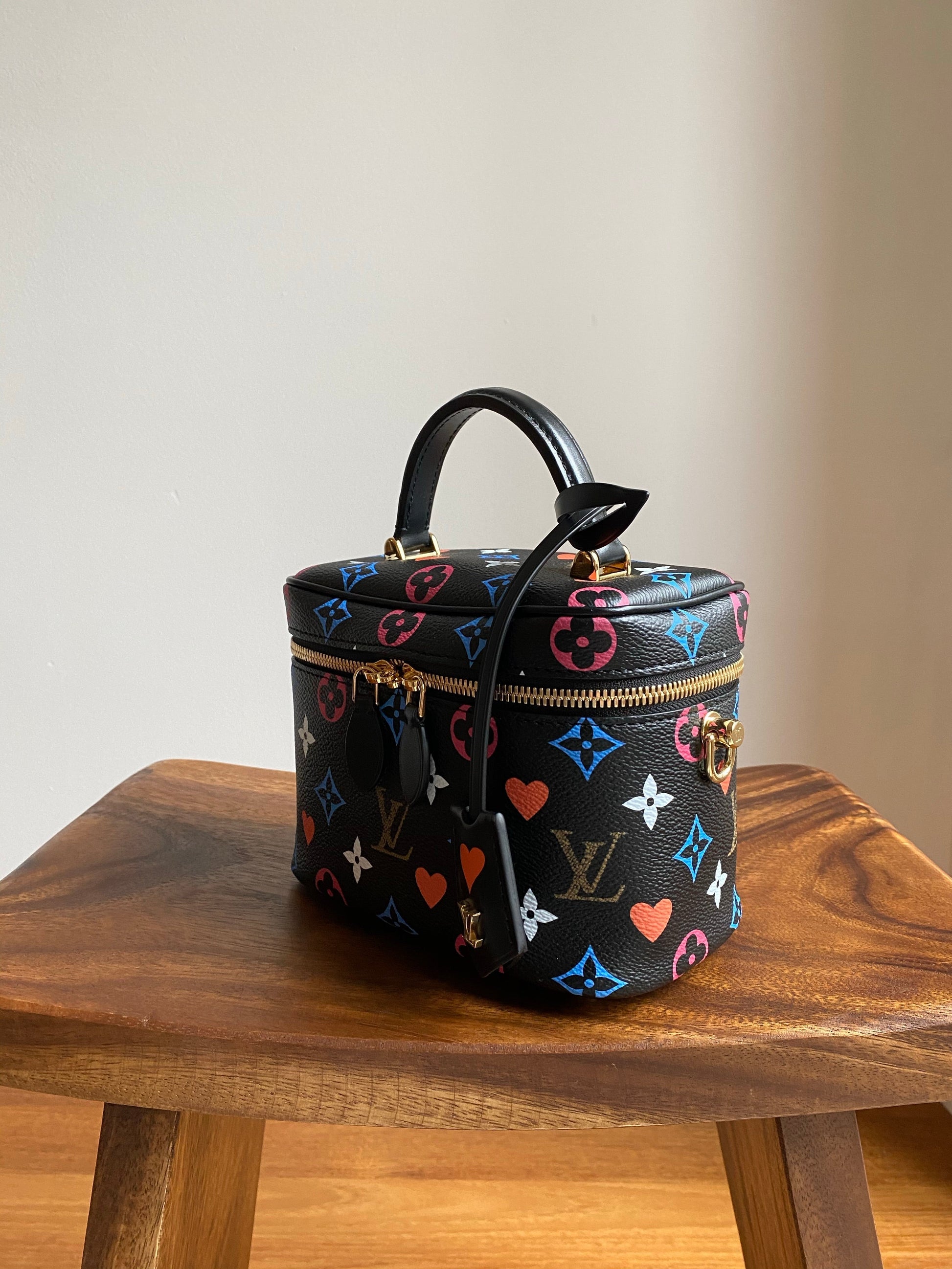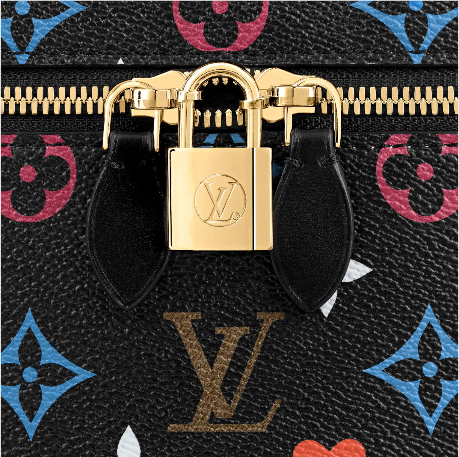 The Vanity PM city bag is fashioned from new Game On Monogram canvas. The bag takes on a striking aspect in a Game On pattern transformed by Nicolas Ghesquière, rendered with colored Monogram Flowers in bright blue and red. Compact and supple, it can be carried by hand, on the shoulder, or cross-body.