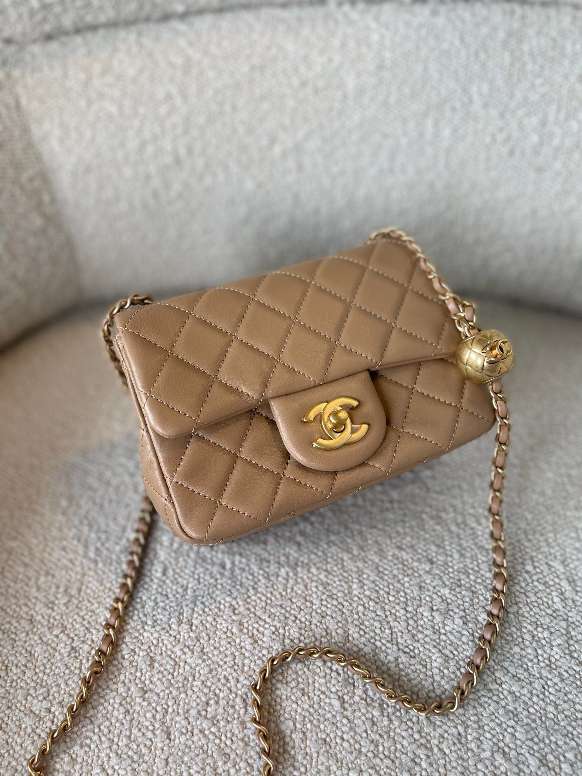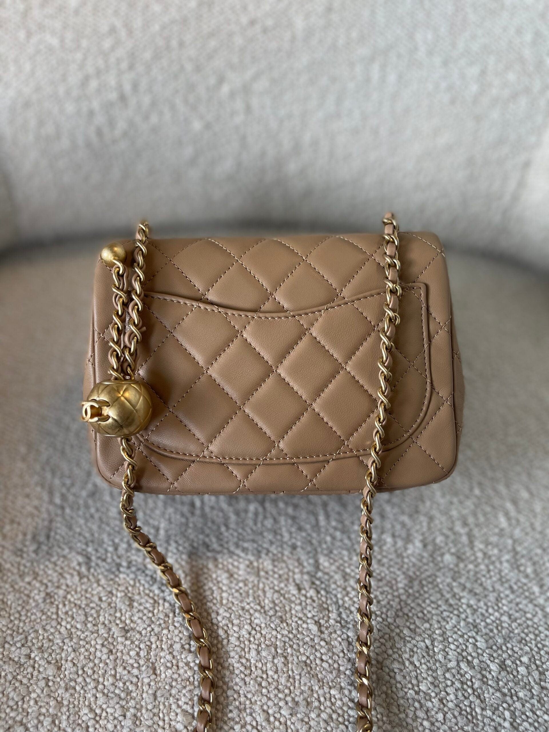 Dark Beige Lambskin Quilted Pearl Crush Mini Aged Hardware