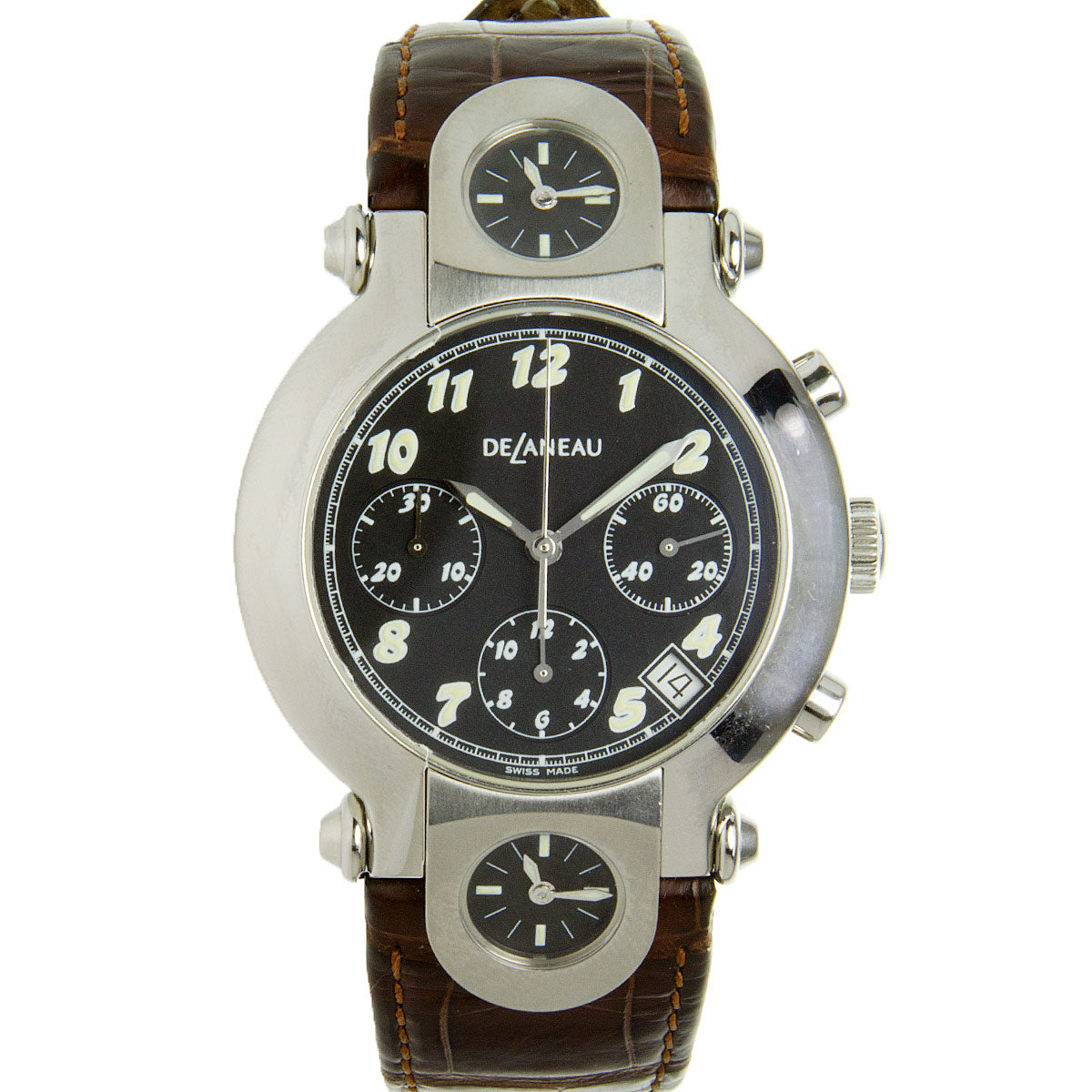 A distinctive design from DeLaneau, the 38mm stainless steel case features a 2nd and 3rd time zone display above and below. The main display has a black dial with black subdials and luminous hour markers. It has an automatic winding Swiss chronograph movement and comes on its original brown leather strap.