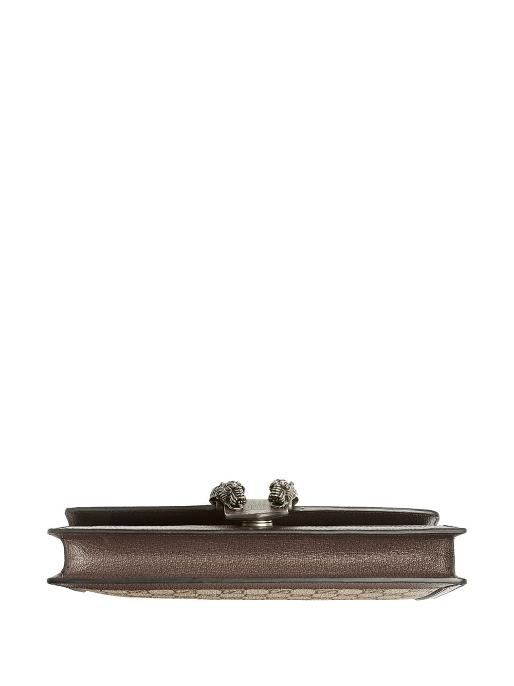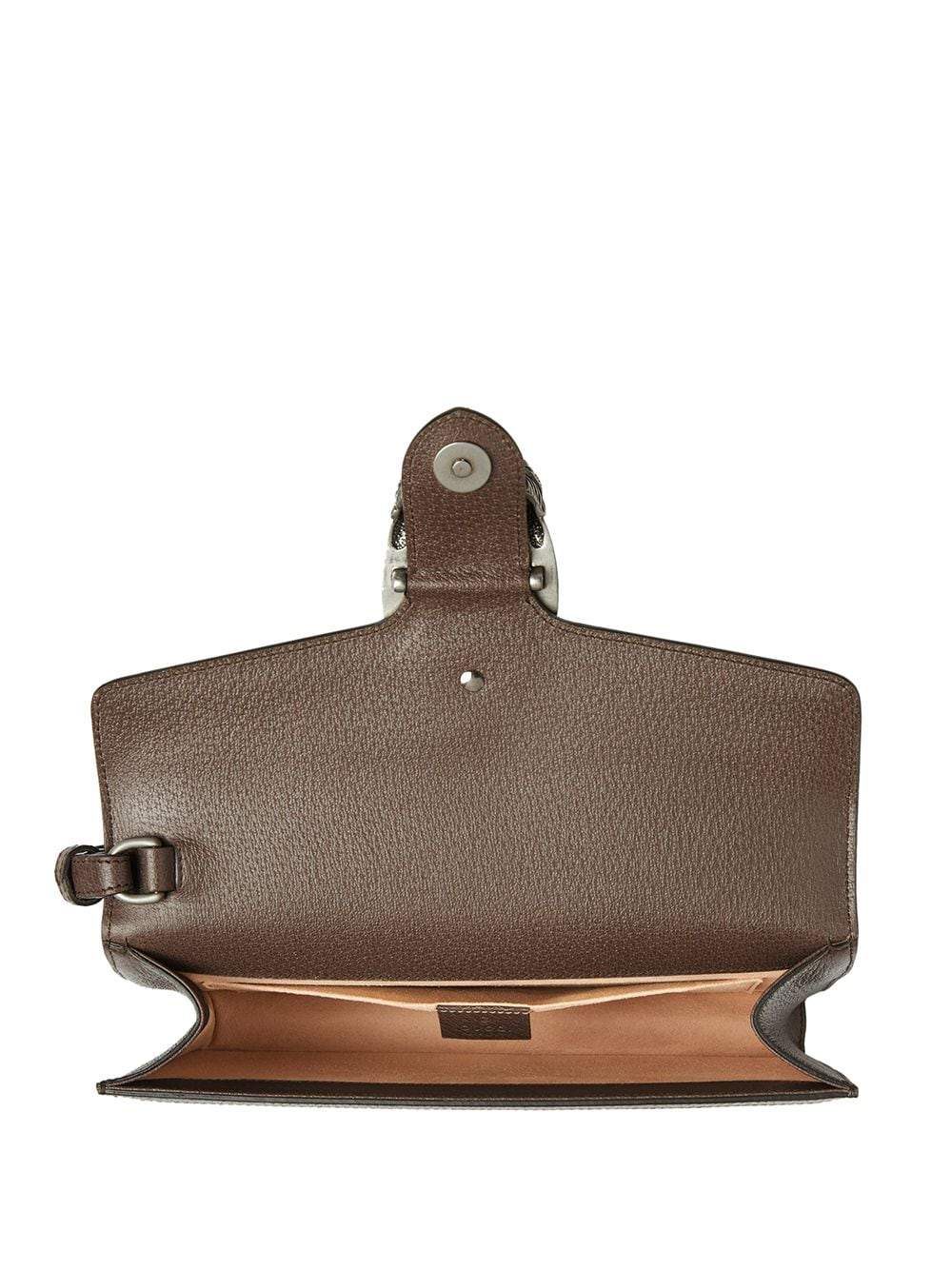 This Gucci Dionysus Bag is complimented with a wrist strap, a foldover top with magnetic closure, a main internal compartment, an internal slip pocket, an internal logo patch, a GG logo print all-over, a Tiger head detail to the front and palladium-toned hardware. This Gucci Dionysus GG Supreme Bag is perfect for an evening bag, its brown colour along with the GG canvas print is sure to have eyes on you. Subtle and stylish.