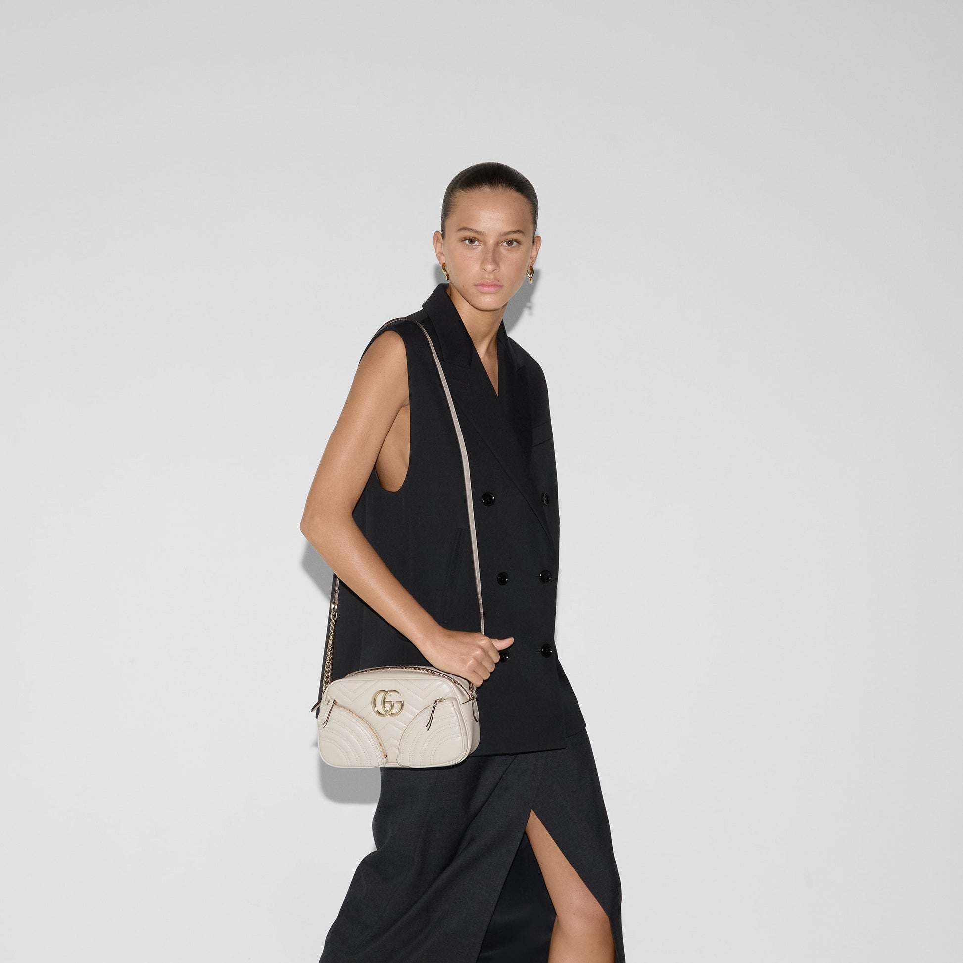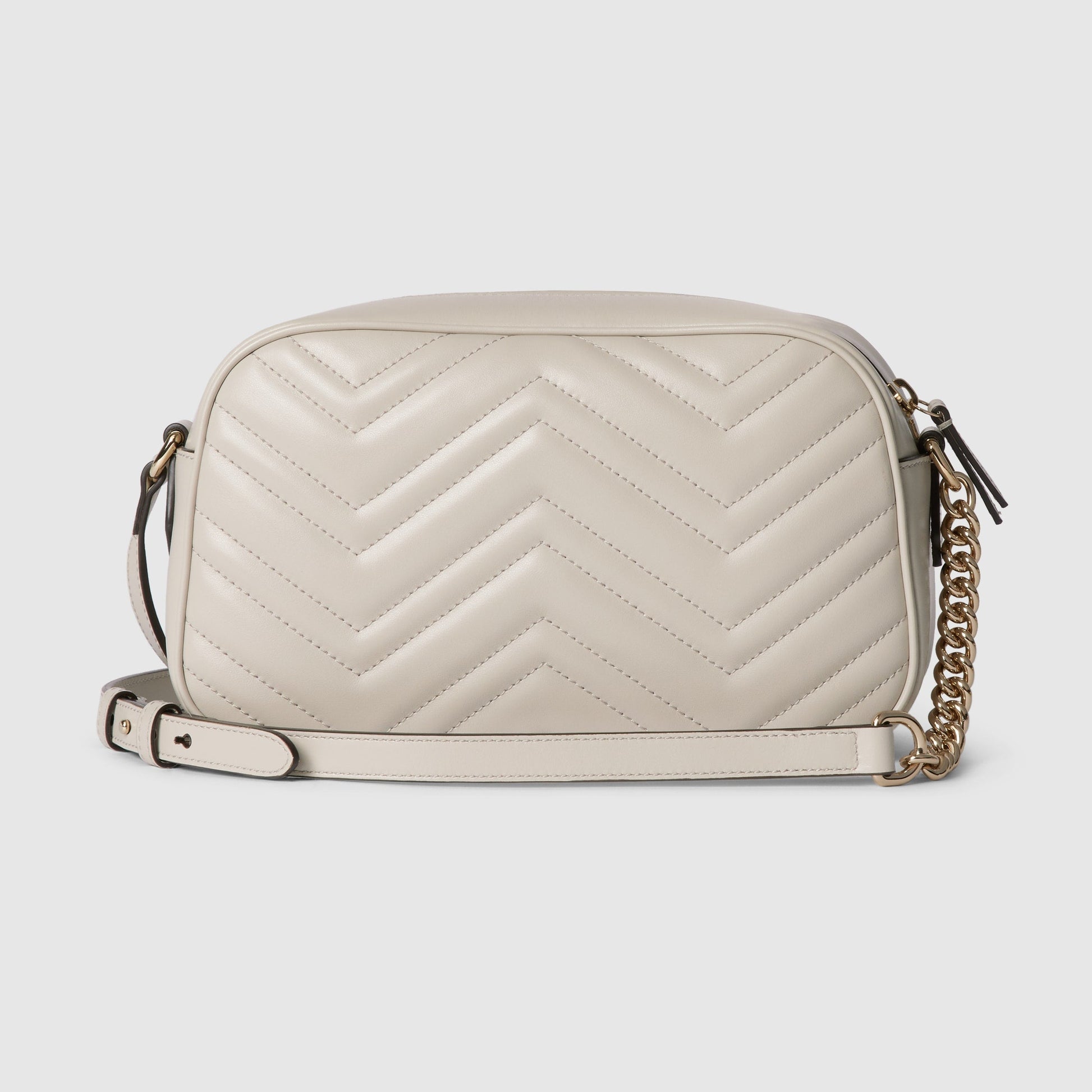 Presenting the House's red hue Gucci Rosso Ancora on the GG Marmont, this super mini shoulder bag presents the iconic style in a signature color for Pre-Fall, complete with light gold toned hardware and ivory leather lining.