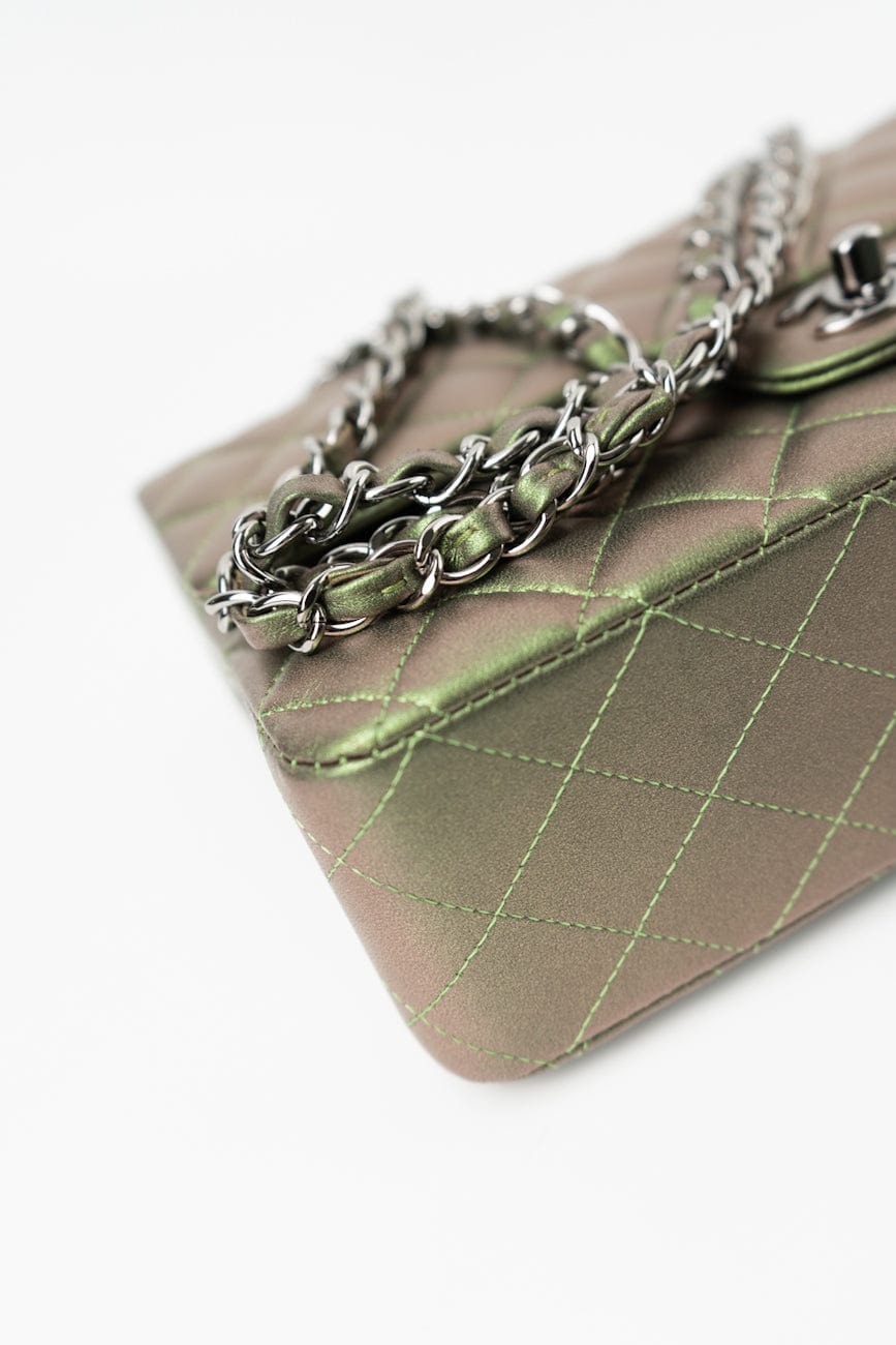 17S Green Iridescent Lambskin Quilted Classic Flap Medium RHW