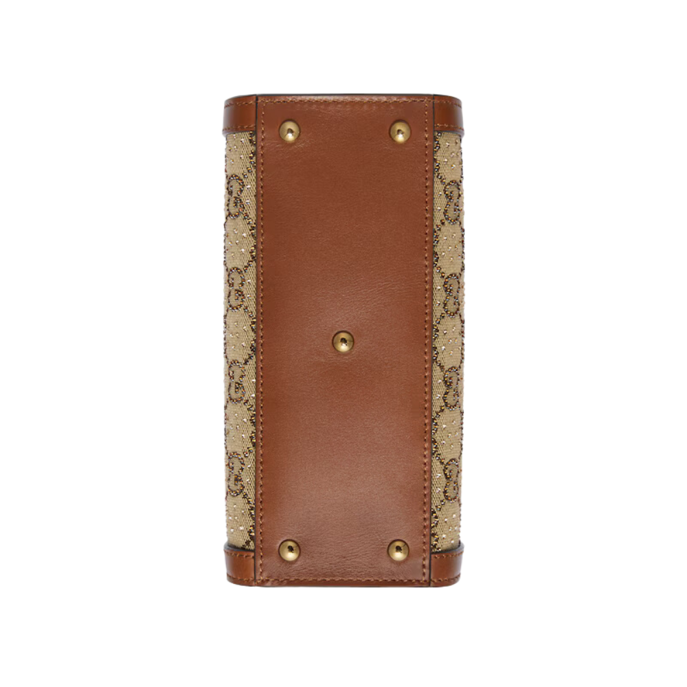 Marking Gucci's first in-person fashion show since February 2020, the Gucci Love Parade unfolded along Los Angeles' Walk of Fame. Inspired by old-Hollywood glamour, this collection presents contemporary takes on traditional pieces. This Gucci Diana mini tote bag, presented in camel and ebony GG canvas with crystals, adds a refined touch to the emblematic silhouette.