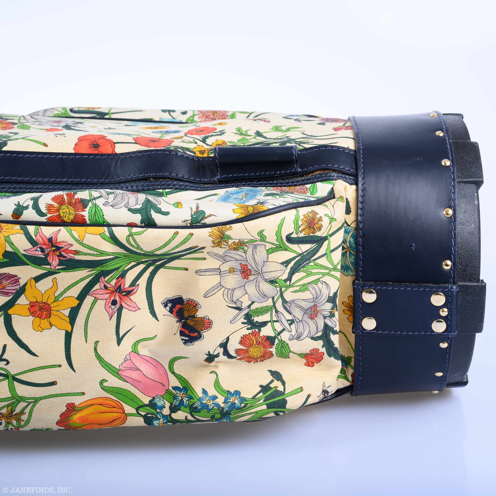 The Flora canvas has been a colorful staple in the Gucci repertoire for decades. This unique custom made gold bag features this fun pattern throughout the body, along with navy leather trim and gold studs. Gucci only makes gold bags by special order, and this spectacular vintage piece could likely be the only of its kind.