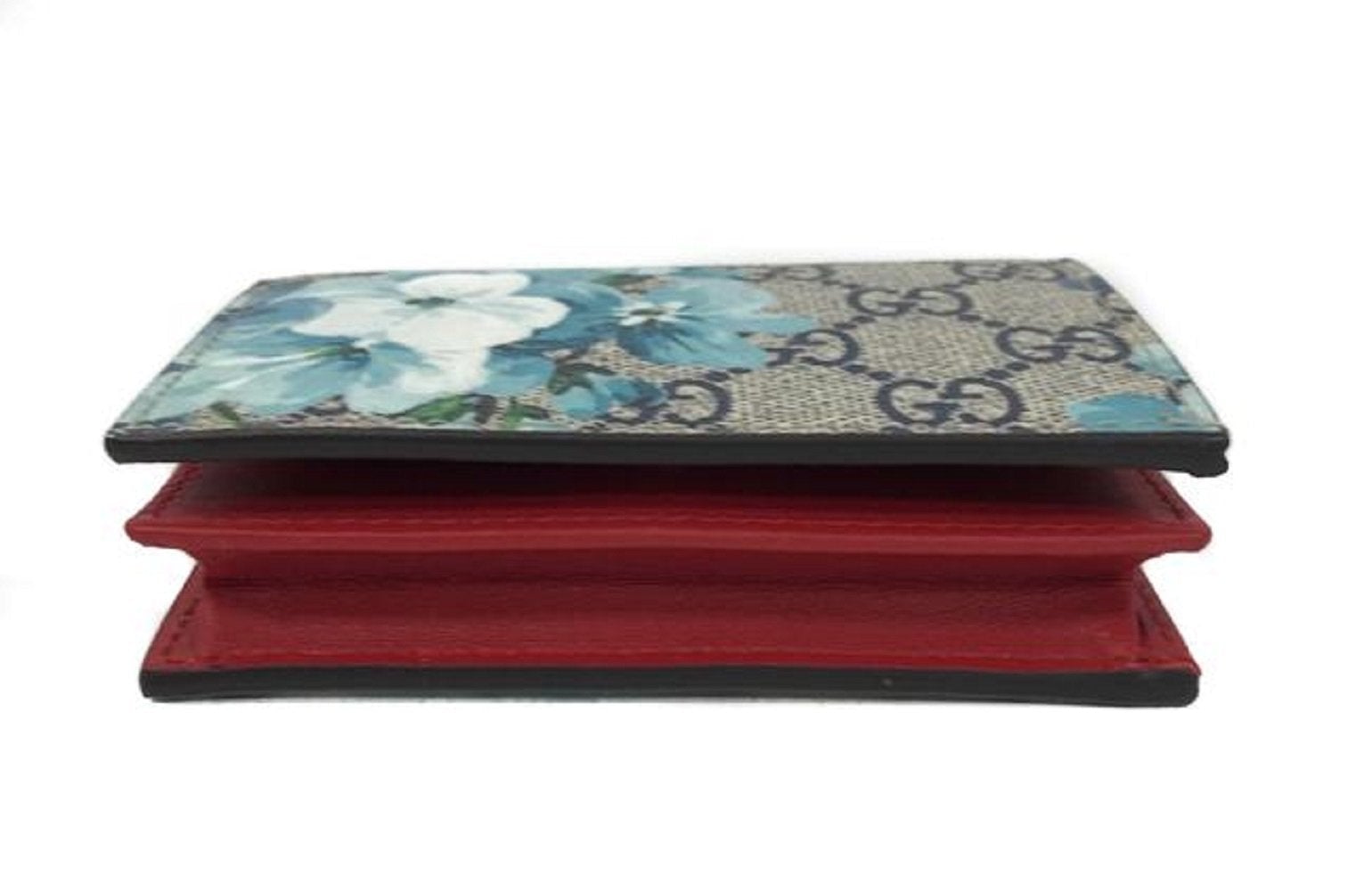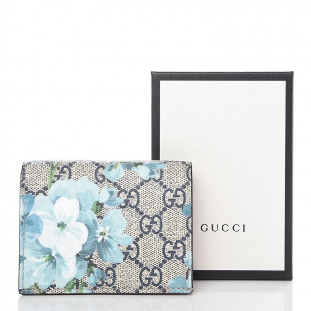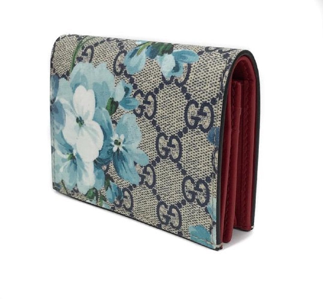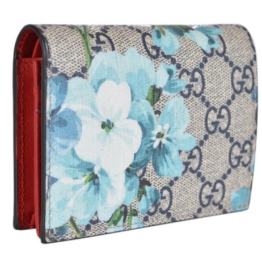 This petite, yet stylish case is crafted of blue floral printed coated canvas. The case features a beautiful print of various types of flowers throughout, in shades of blues and whites. This wallet opens to a compact red leather interior with six card slots, patch pocket, and a built in bill flap. This is a perfect card holder with a chic twist of style from Gucci!