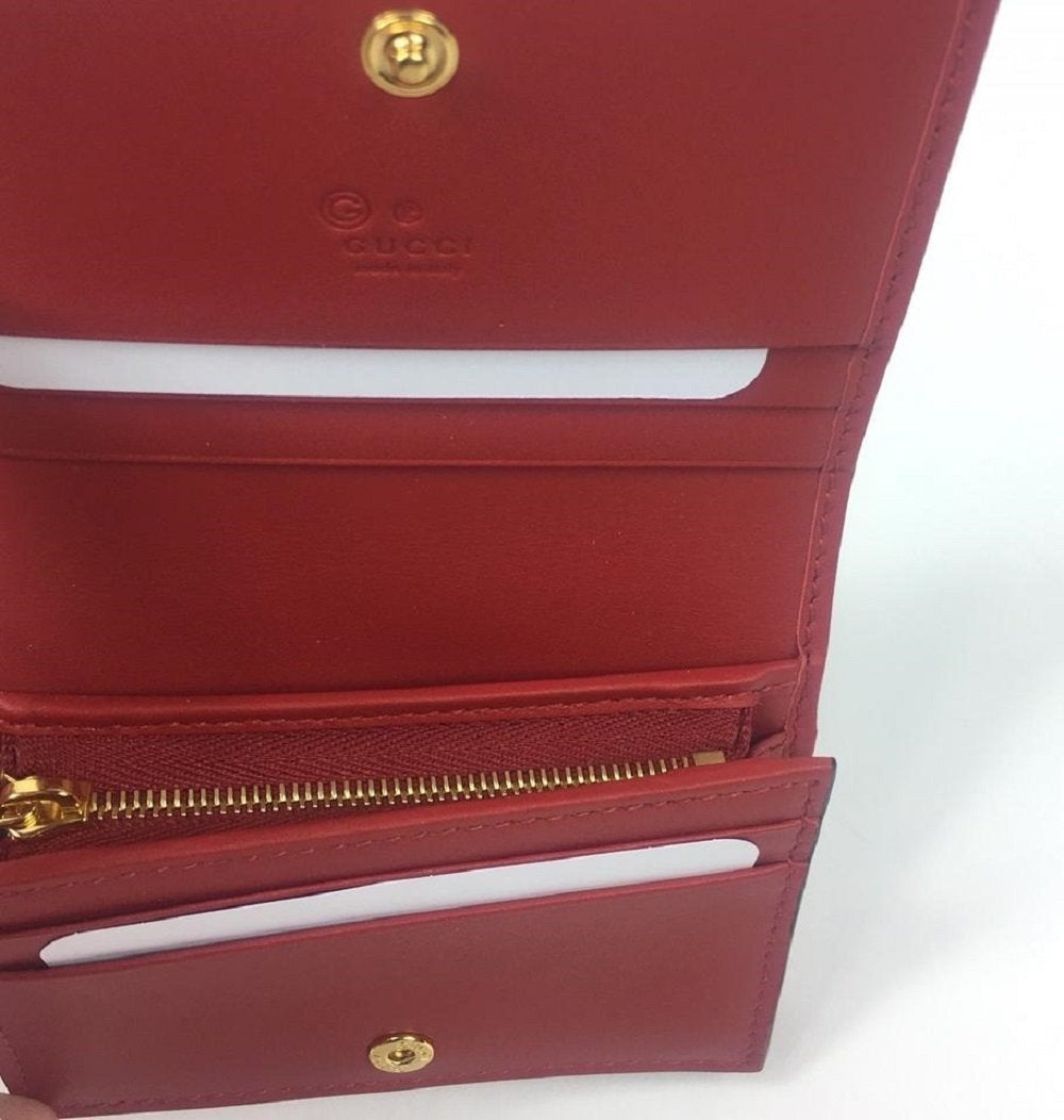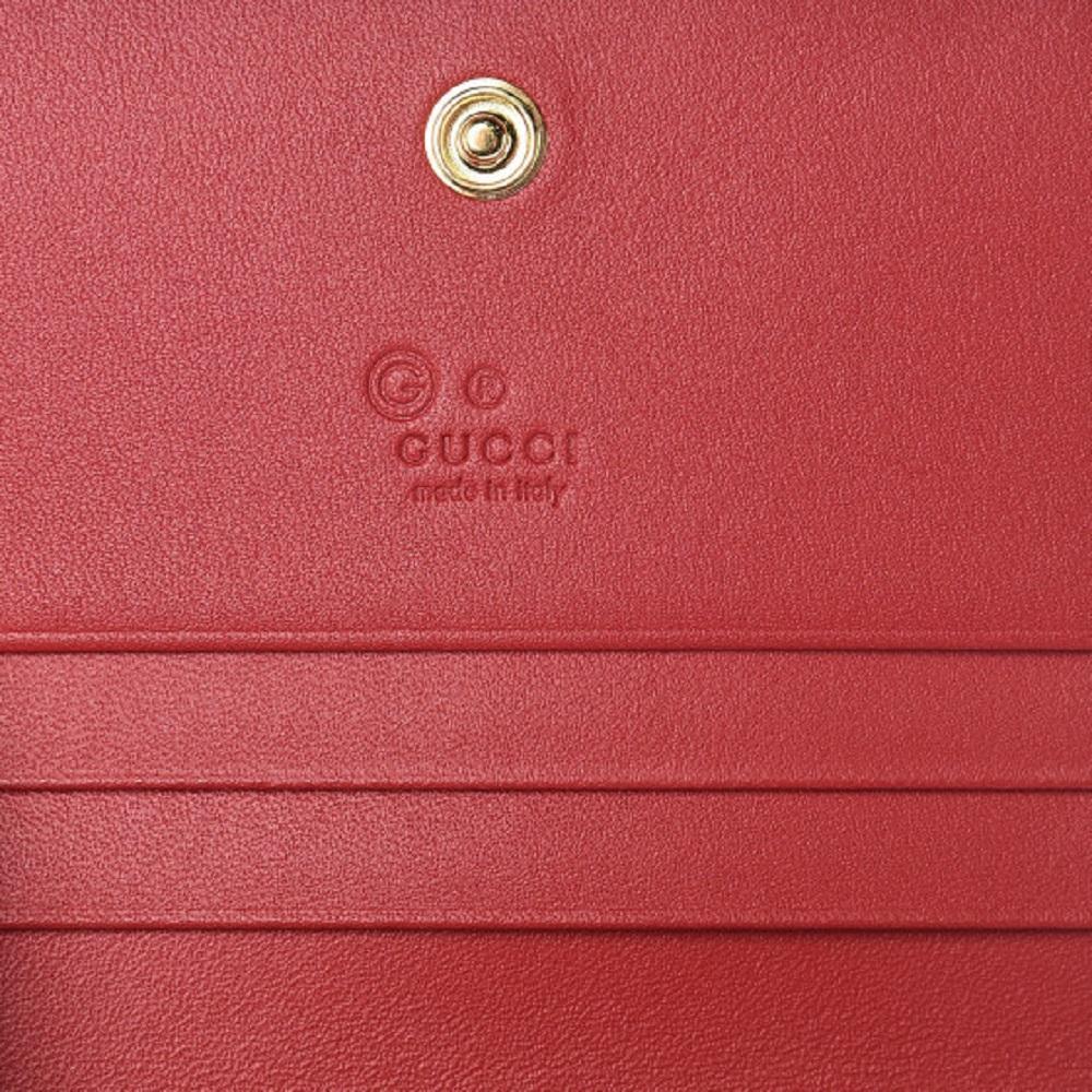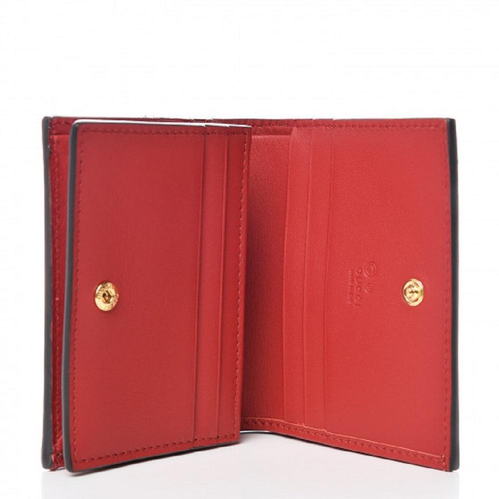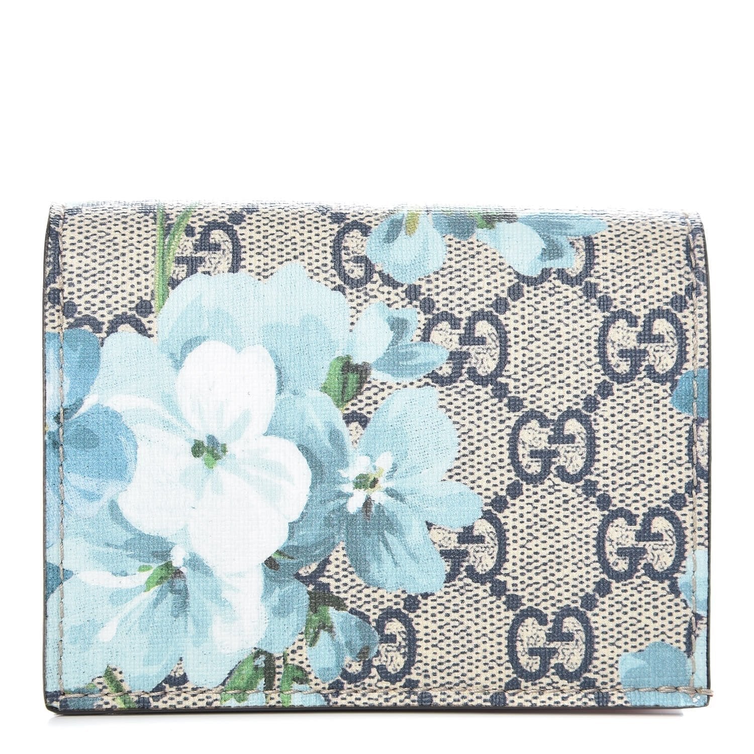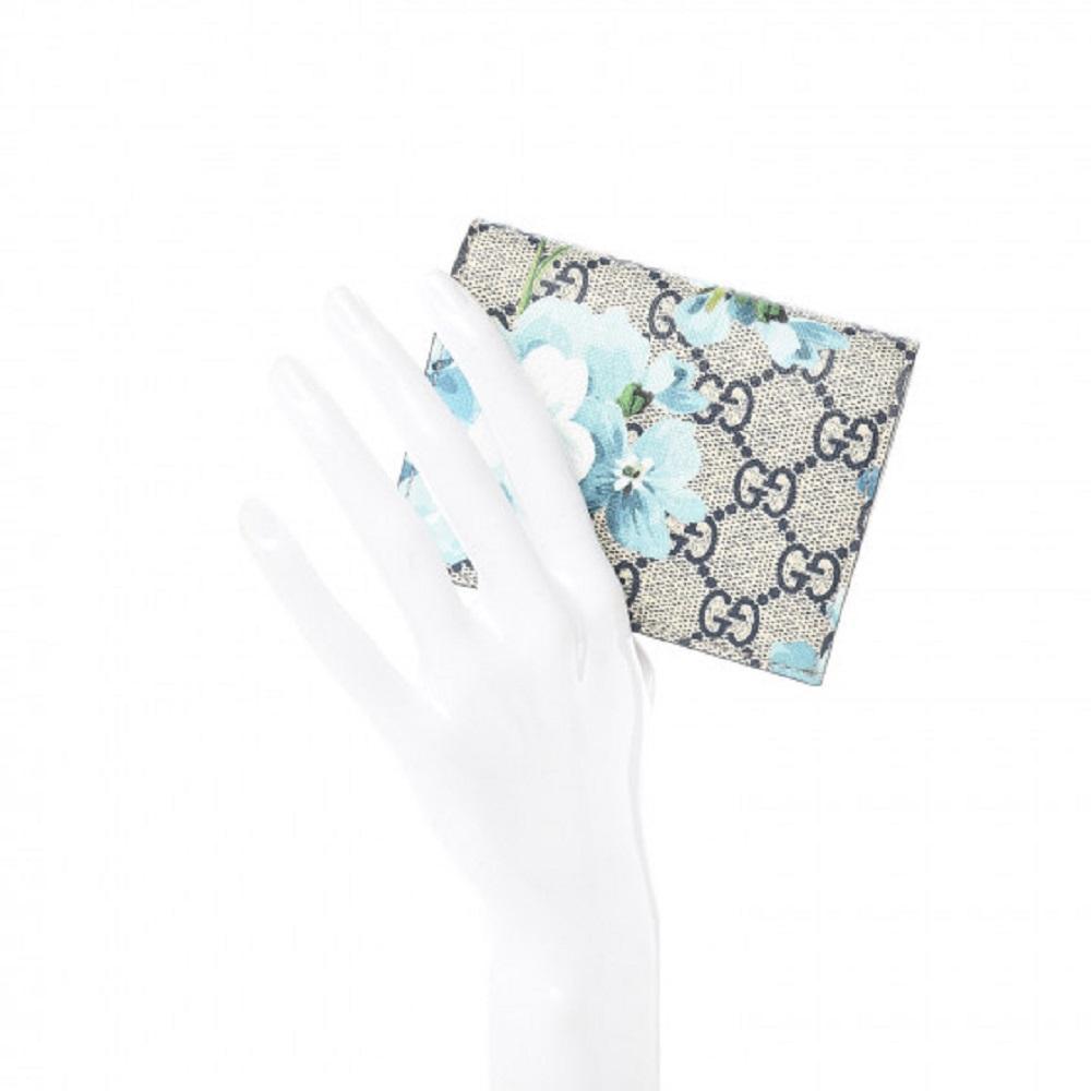 This petite, yet stylish case is crafted of blue floral printed coated canvas. The case features a beautiful print of various types of flowers throughout, in shades of blues and whites. This wallet opens to a compact red leather interior with six card slots, patch pocket, and a built in bill flap. This is a perfect card holder with a chic twist of style from Gucci!