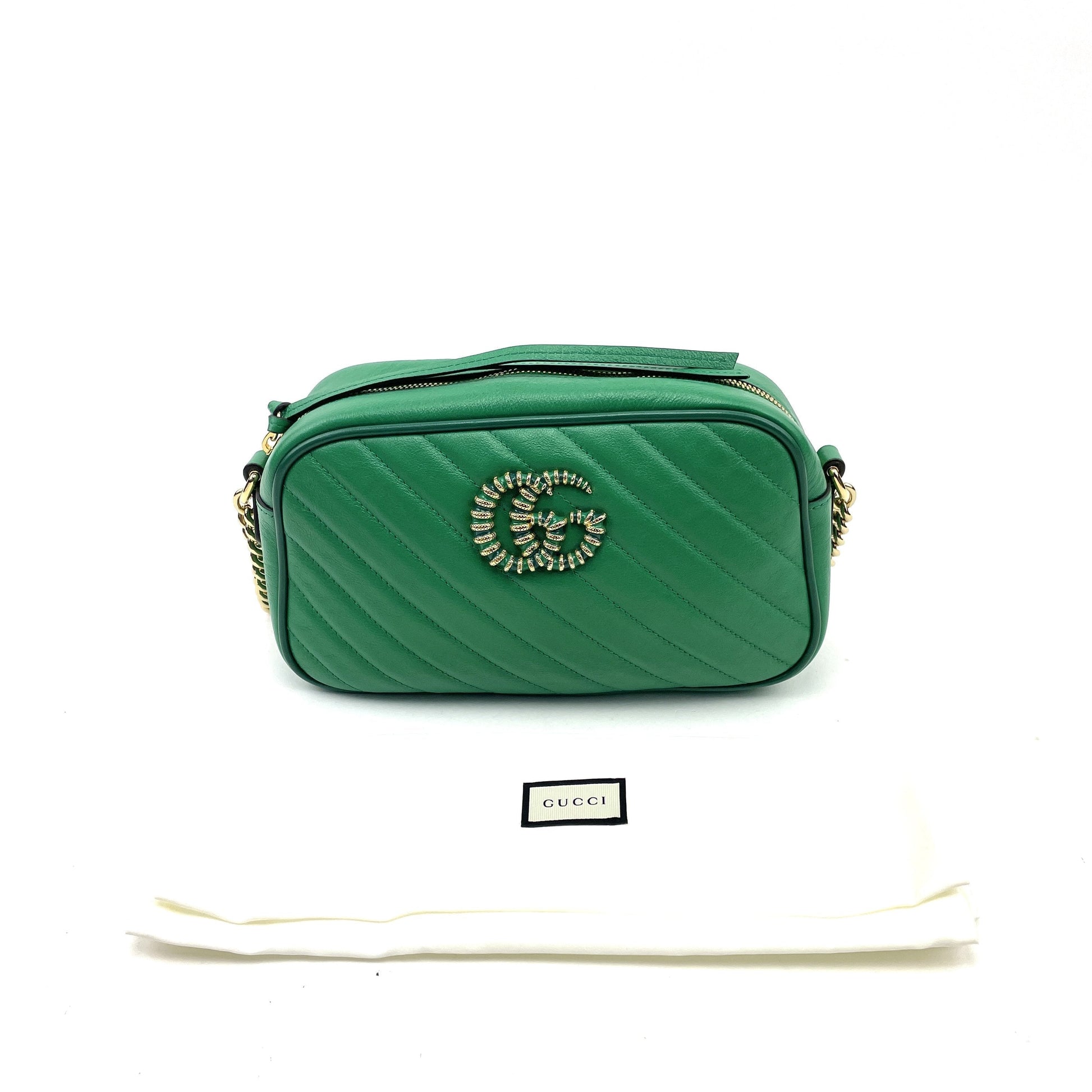 Gucci GG Marmont shoulder bag made of diagonal green matelassé leather and rectangular shape. Features zip closure, internal flat pocket and GG logo in green and gold. Gold-colored metallic finishes. Adjustable leather and chain shoulder strap. Includes dust cover.