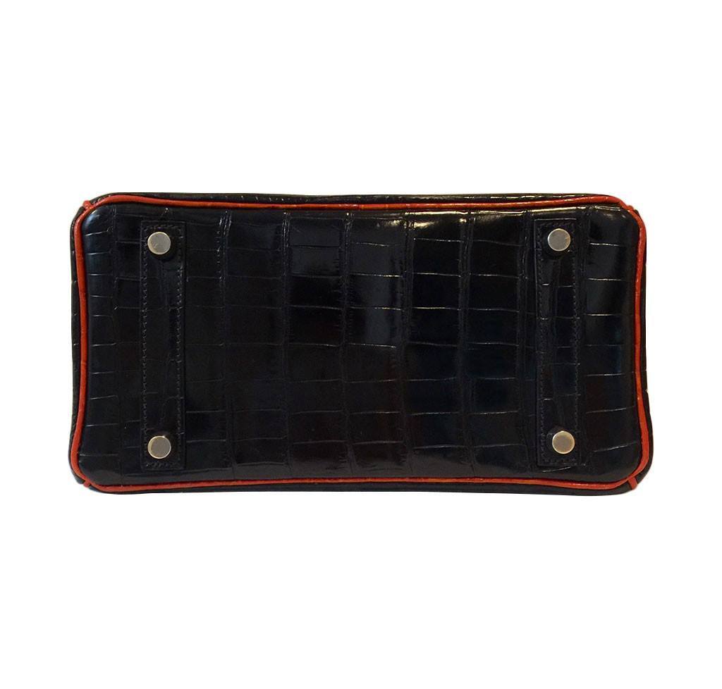 Extremely rare Hermès Birkin limited edition bi-color crocodile bag. Combination of black and Hermès signature orange on a two-tone crocodile exterior. The embossing features the dual-dot signature, which signifies Niloticus Crocodile from the Nile River. Palladium hardware completes the elegant appearance on one of the rarest Birkin bags we have ever featured on Baghunter. Please contact us for more details and availability.