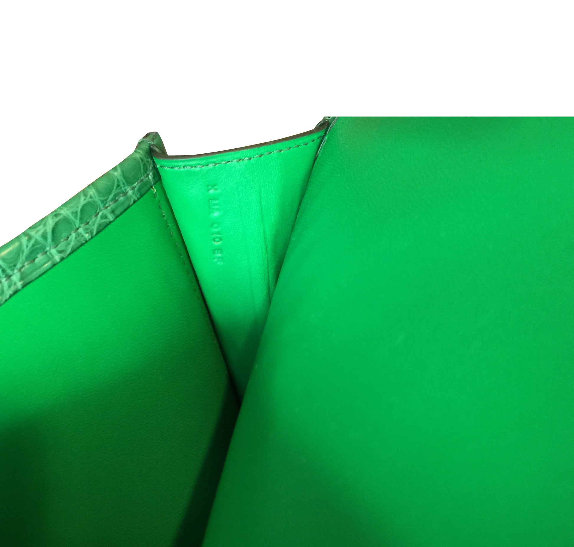 This extremely rare Hermès Jige Elan Clutch is crafted from exotic alligator skin throughout, including the signature Jige "H" closure. The bag boasts a striking cactus shade of green with a matte finish. A square signature stamp found next to the Hermès stamp is added to all alligator skin Hermès bags, while the "X" stamp inside the clutch indicates the year of manufacture as 2016. This pristine clutch has never been carried and comes with a CITES certificate.