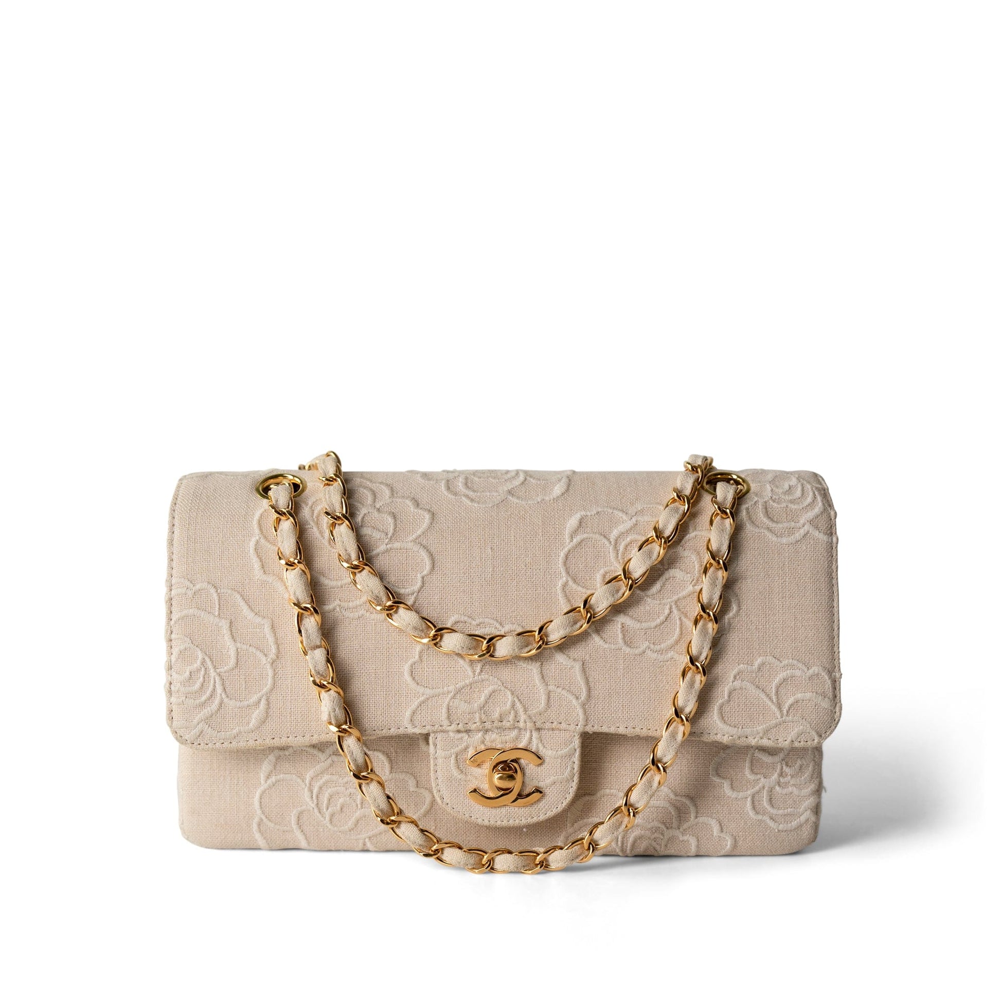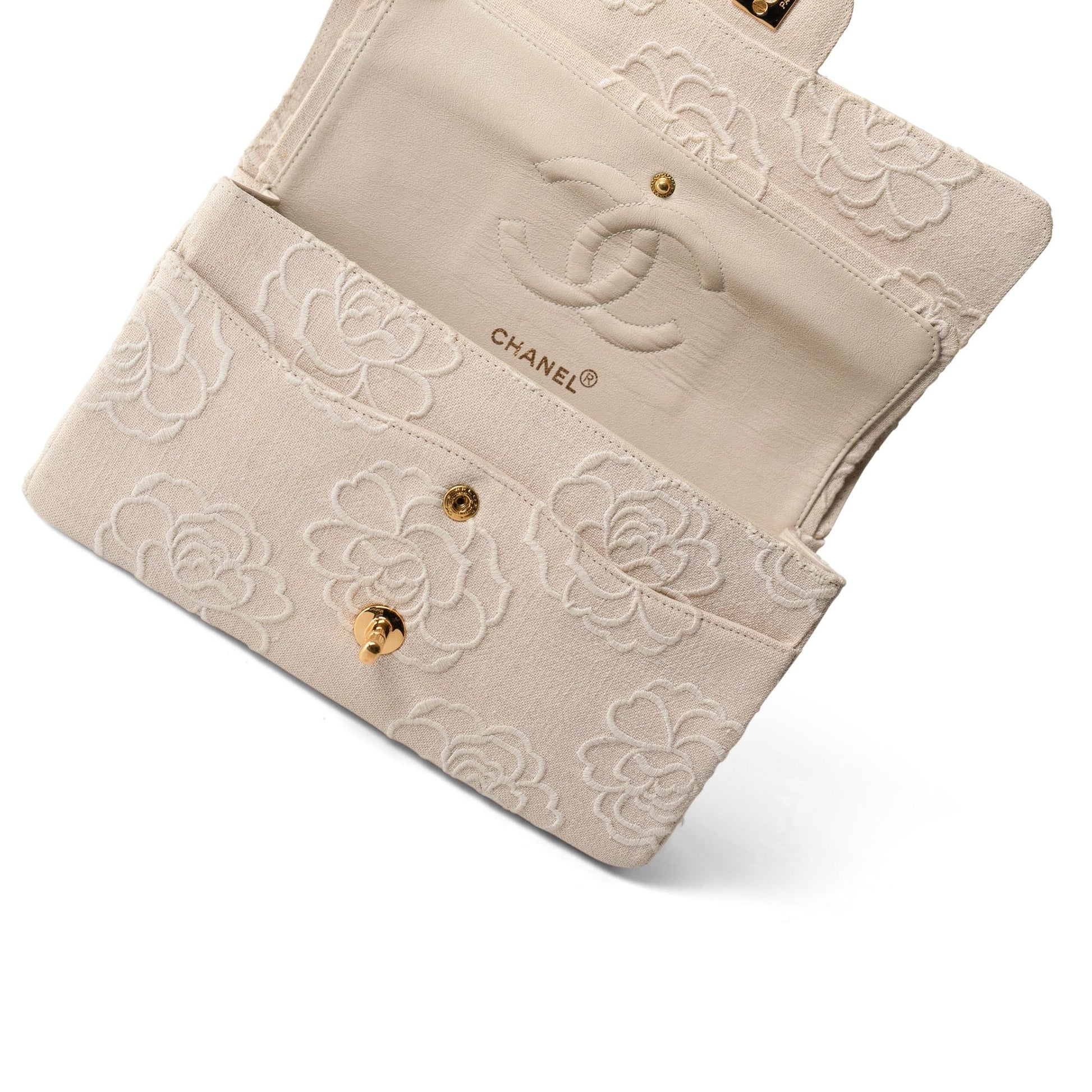 Ivory Canvas Camellia Classic Double Flap Gold Hardware Vintage