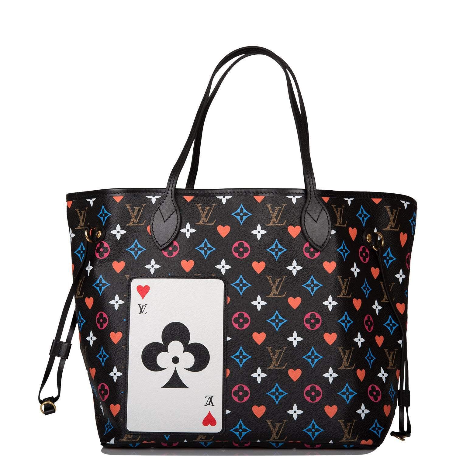 This limited edition Game On Neverfull MM tote is in black coated canvas with golden tone hardware and features a playing card inspired print, exterior slip pocket shaped as a playing card, black leather top strap handles, trim and side cinch cords with polished gold tone hardware and hidden top hook closure.