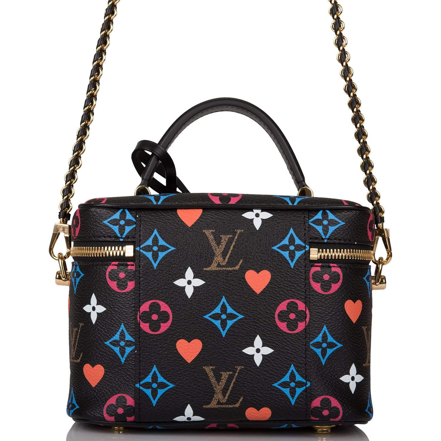 This Game On Vanity PM bag is of black coated canvas with golden brass hardware and features a print inspired by playing cards, black leather trim, a zip closure, a removable leather and chain strap, removable key clochette and top handle.