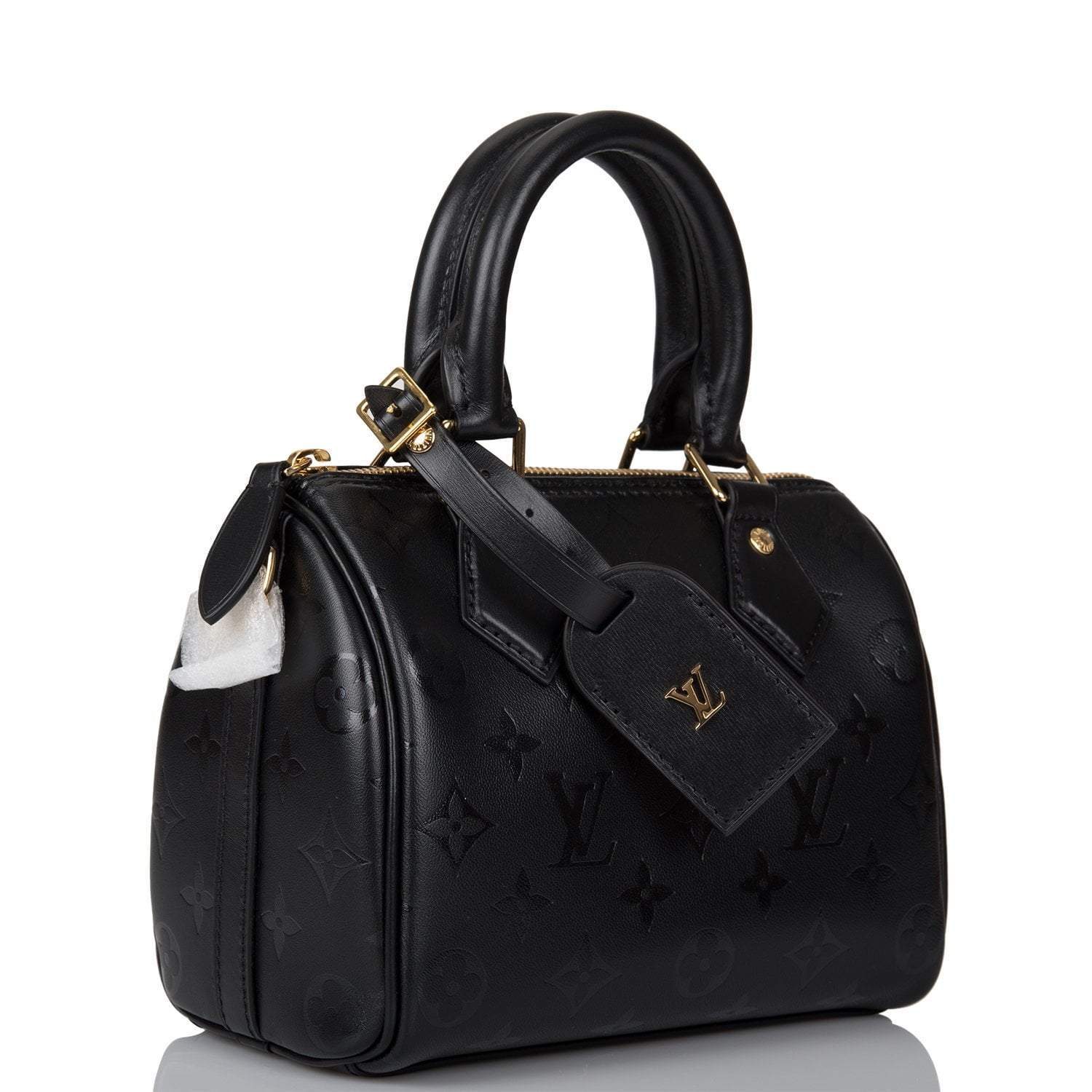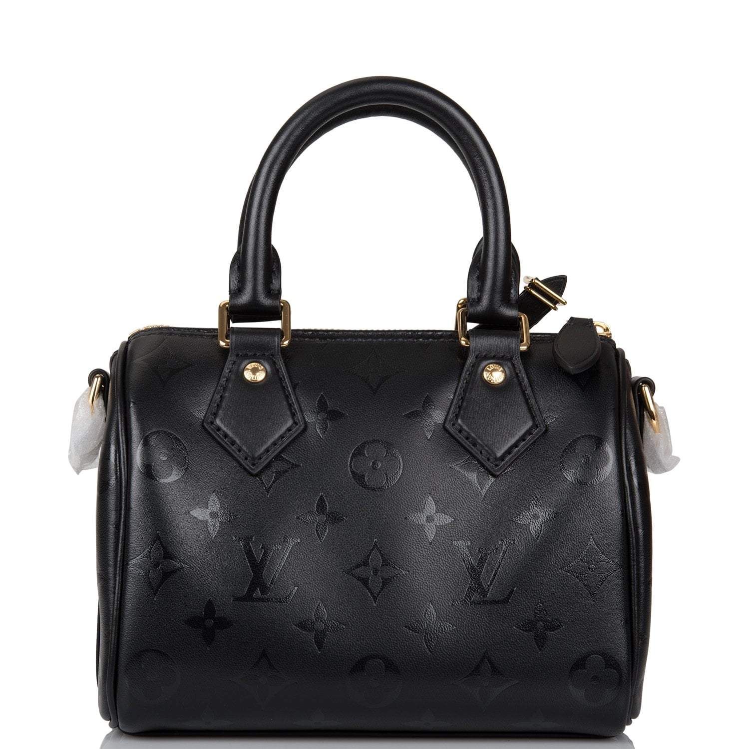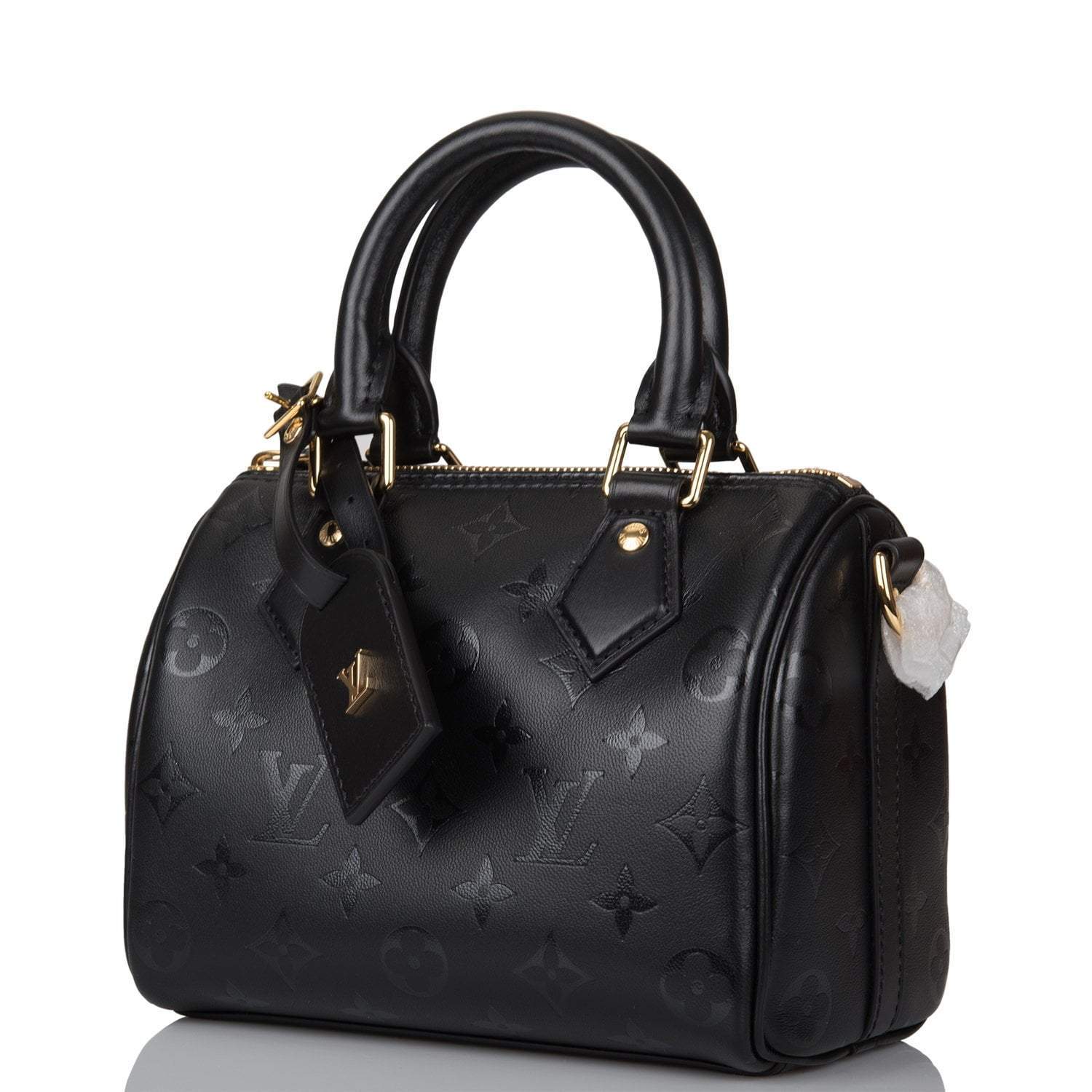 This limited edition Ink Speedy BB is of black leather with polished brass hardware and features a removable black luggage tag, black leather top handles, trim and removable chain strap with zip top closure.