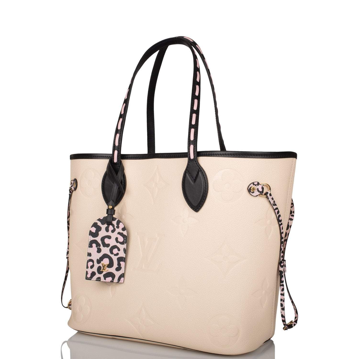 This limited edition "Wild At Heart" Neverfull MM tote in cream empreinte leather with golden tone hardware and features a removable leopard print pouch, black and white leather top strap handles, black trim and leopard side cinch cords with polished gold tone hardware and hidden top hook closure.