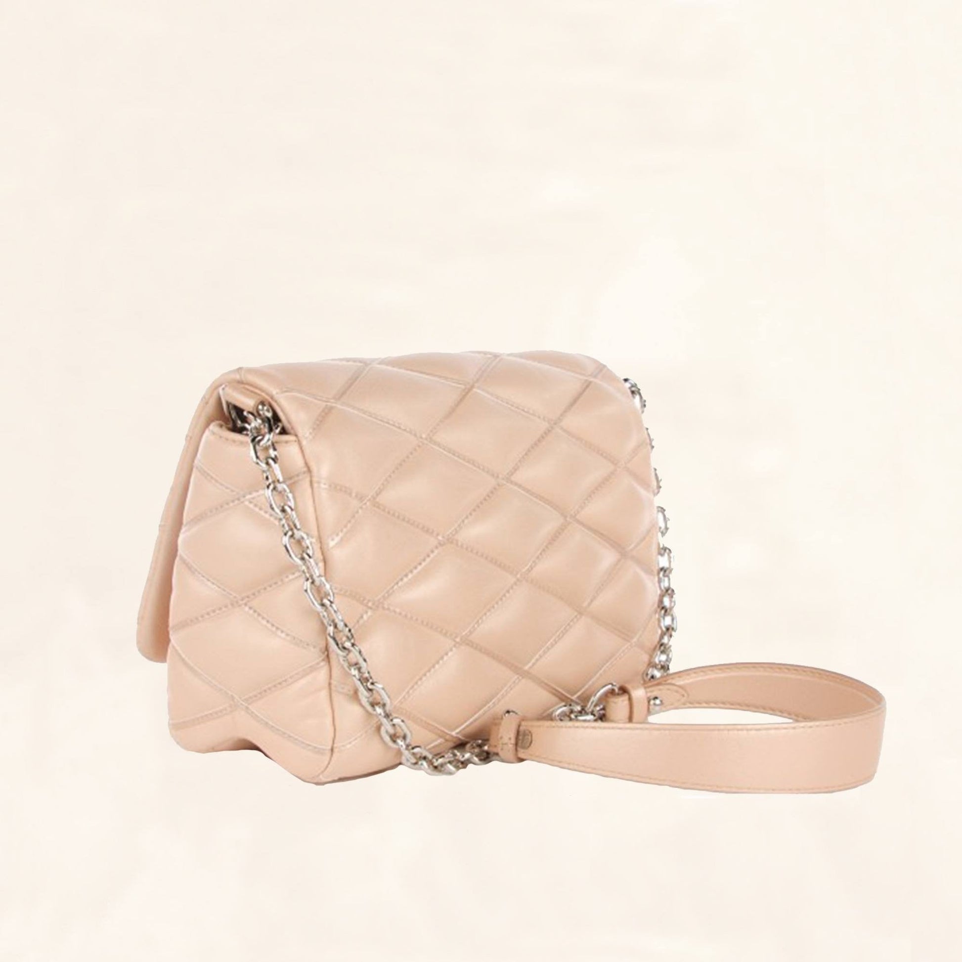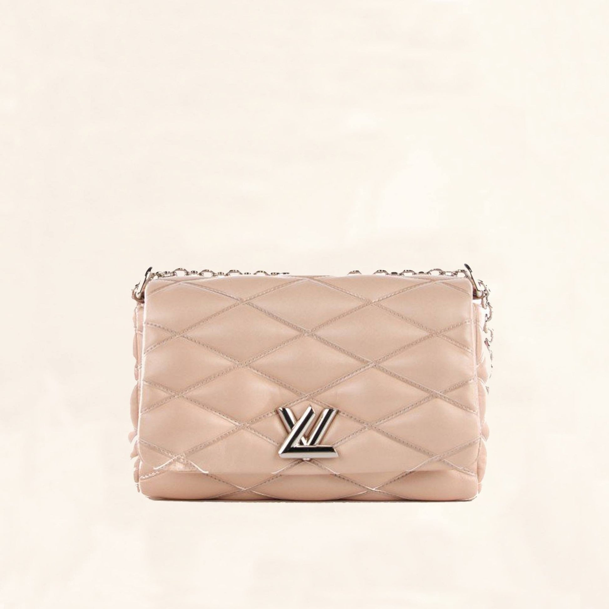 Characteristics: This cross-body shoulder bag is made of soft criss-cross embossed lambskin leather in beige with a silver sliding chain-link shoulder strap with a leather shoulder pad. The palladium silver LV twist lock opens the flap to a black sheepskin lining with a large pocket and a smaller pocket with a mirror.