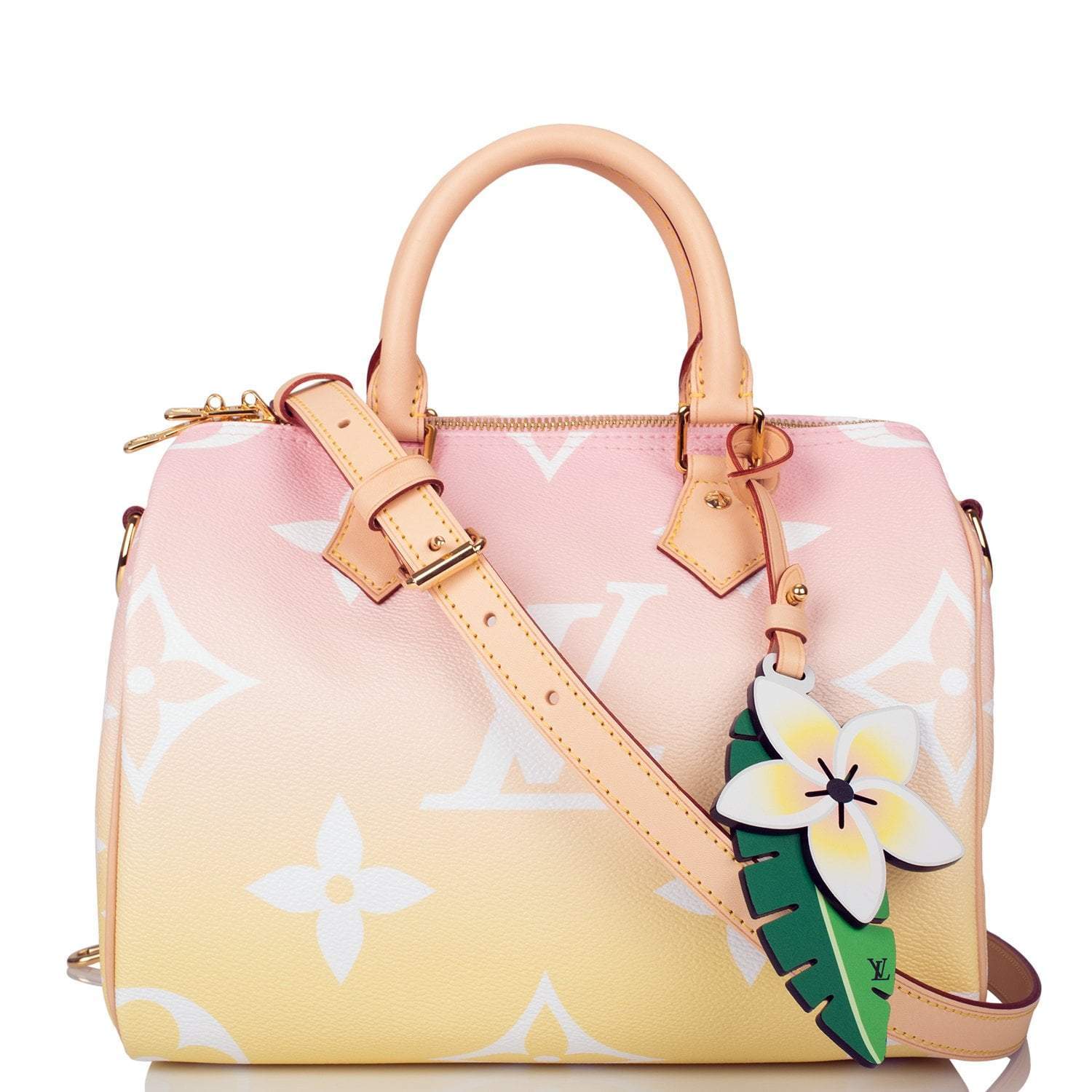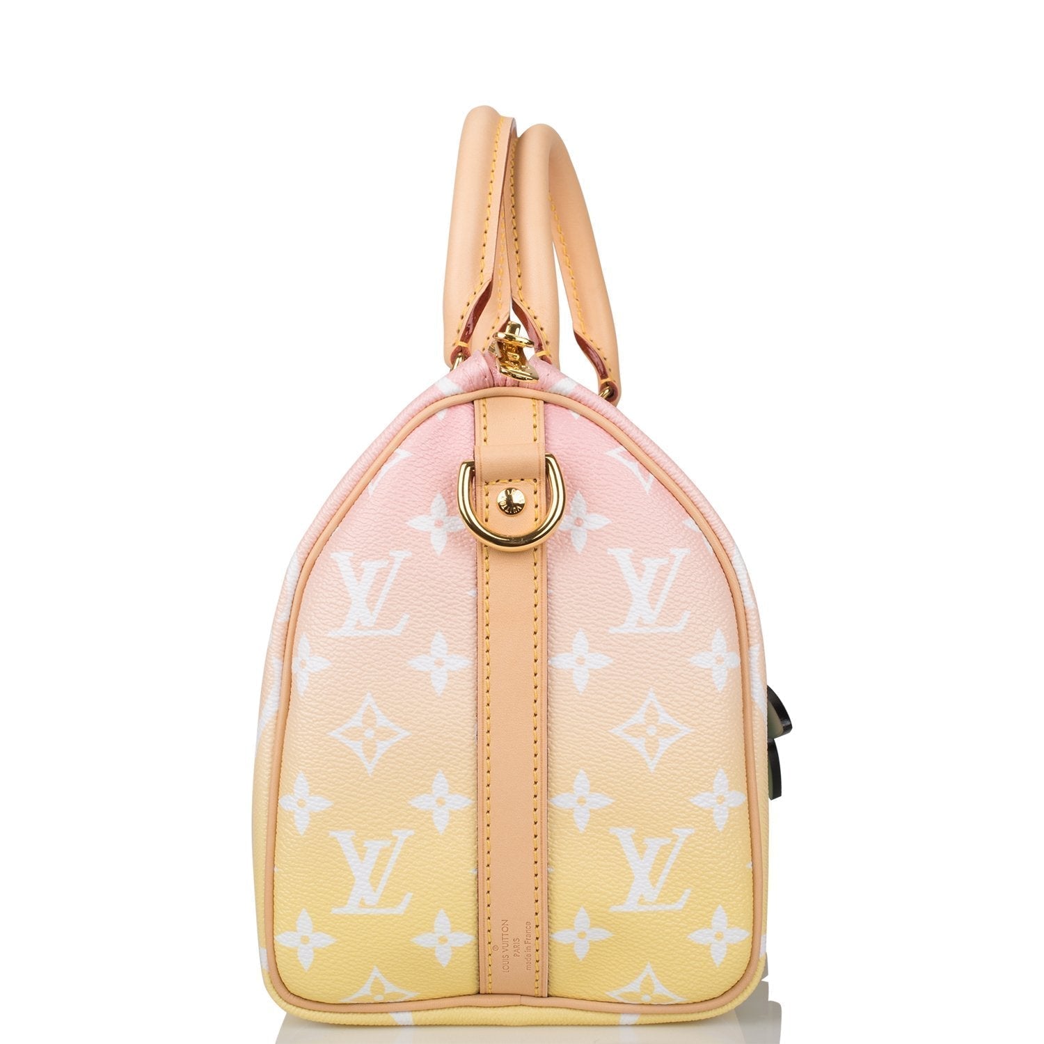 This limited edition By The Pool Speedy Bandouliere 25 is in light pink and yellow coated canvas with golden tone hardware and features a gradient print, vachetta leather top handles, trim and removable crossbody strap with polished gold tone hardware, removable lock, removable charm and zip top closure.
