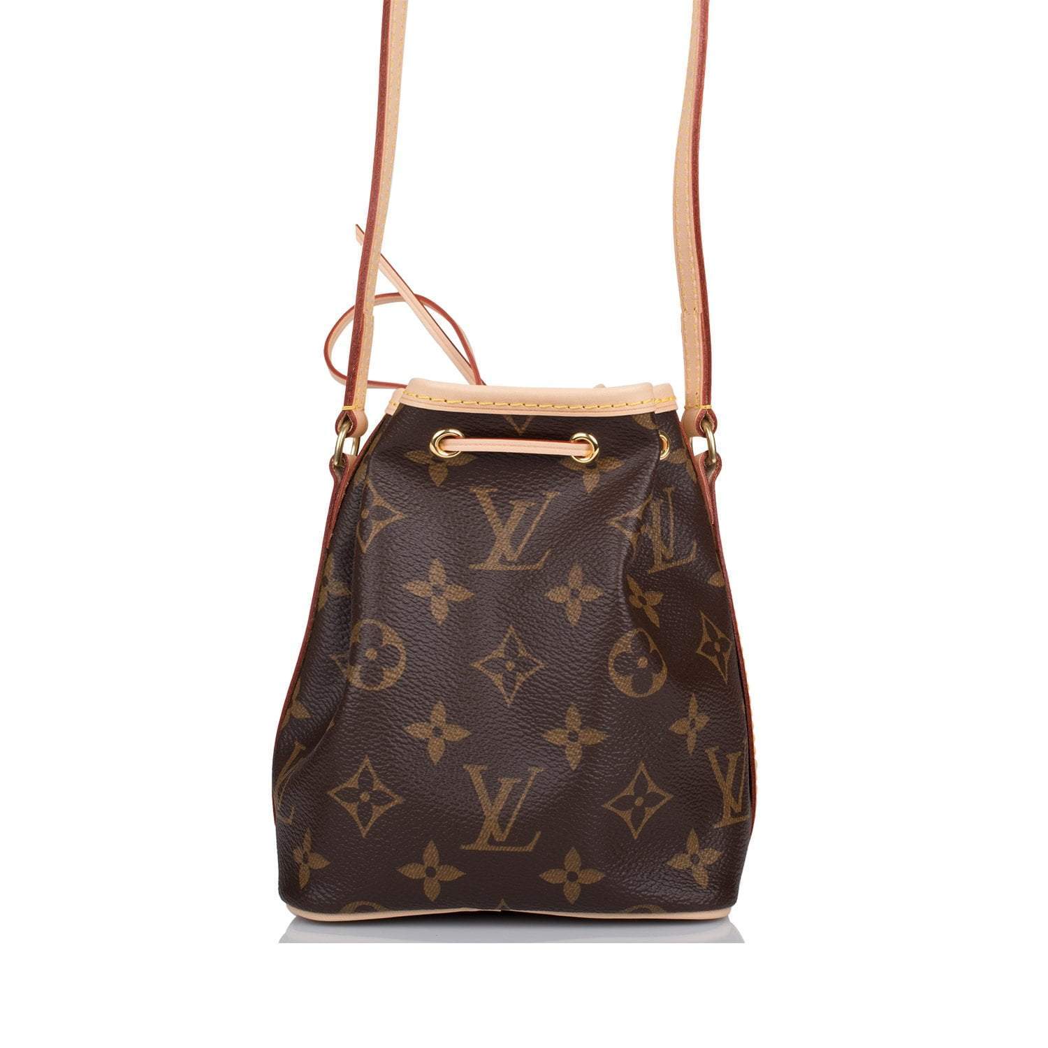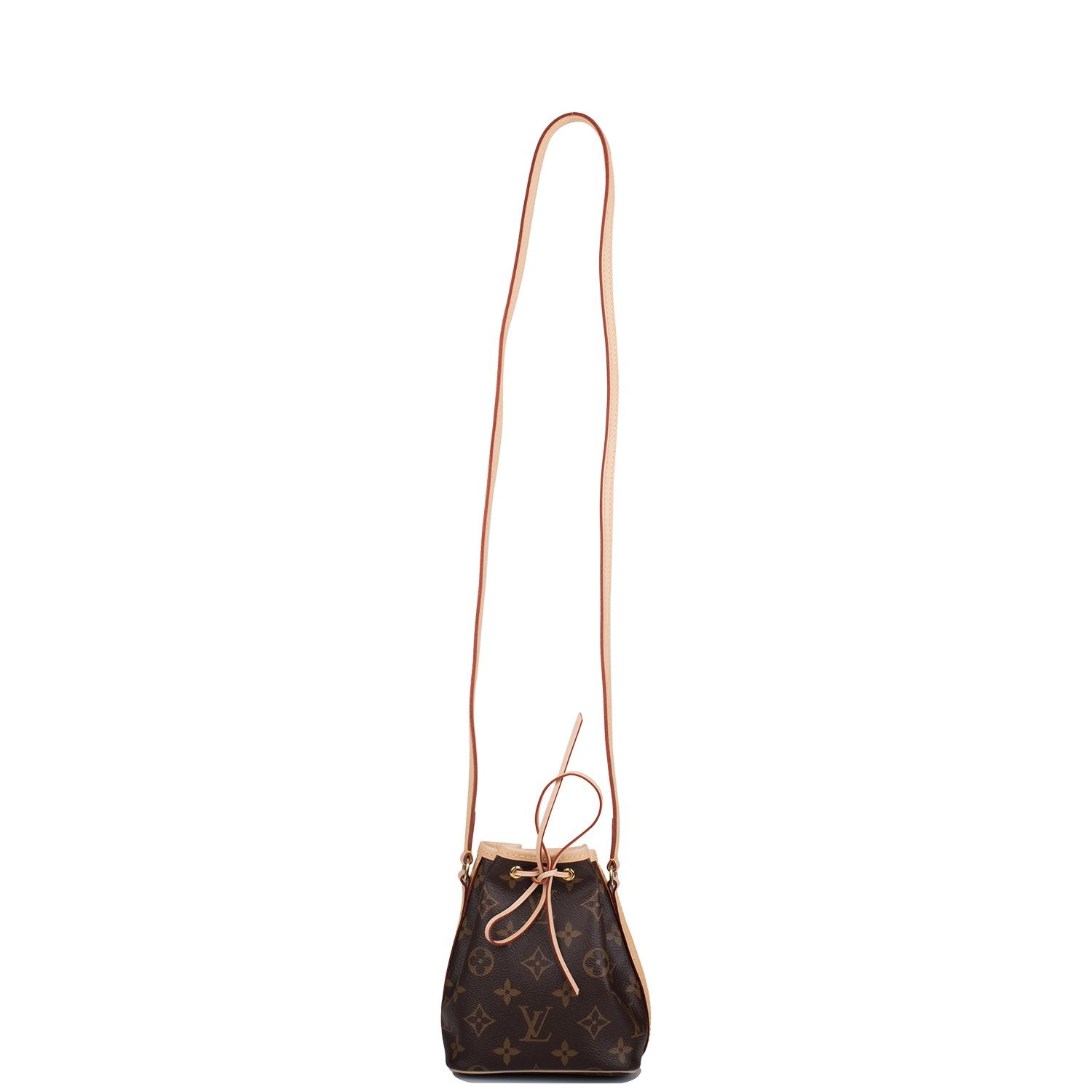 The Nano Noé in Monogram canvas is a miniature version of the famous NéoNoé, which was inspired by Gaston-Louis Vuitton's 1932 design for a bag holding five bottles of champagne. The lightweight Nano Noé holds essentials like a smartphone, wallet and keys. It can be worn on the shoulder or across the body.