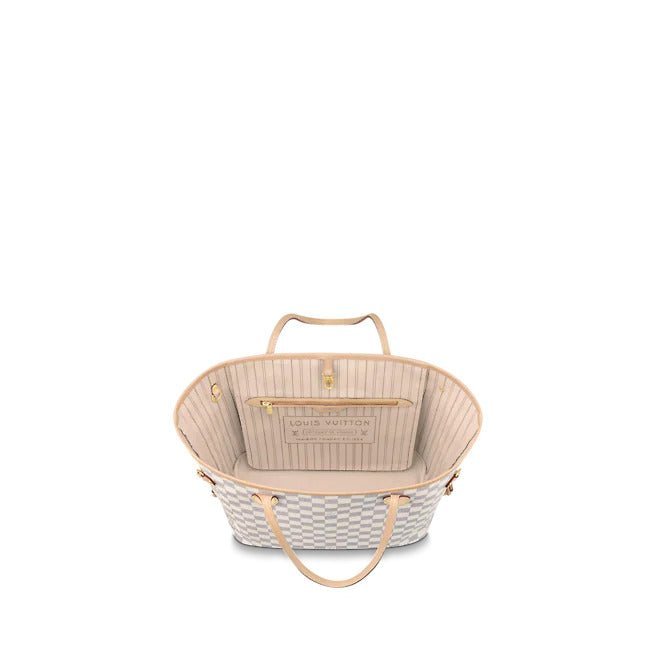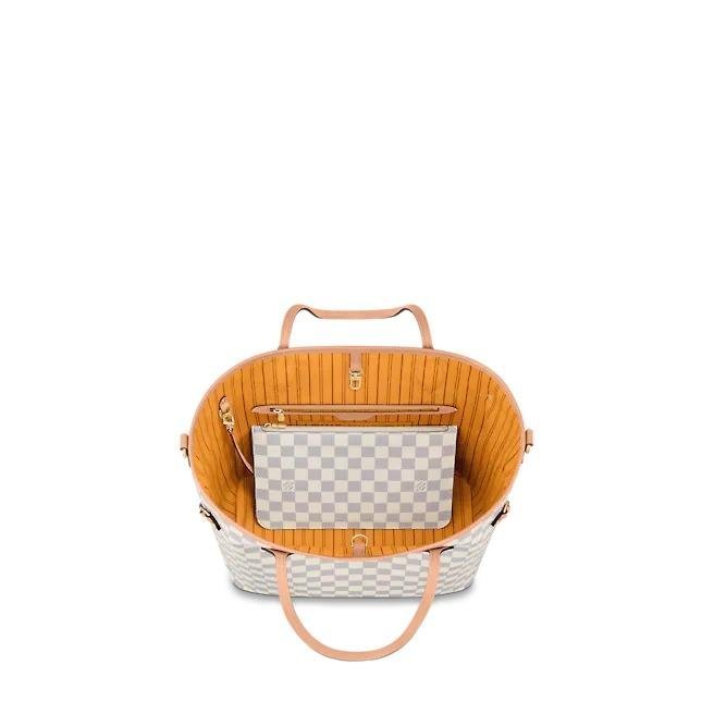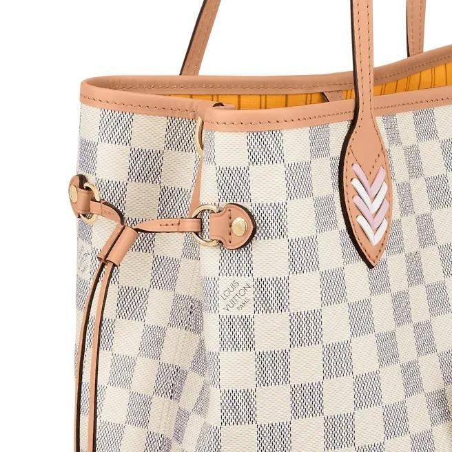 Product Created At: September 07, 2024. Its not an original product its mirroring to original.The Neverfull MM is made from Damier Azur canvas with a shoulder strap in two-color braided leather and colorful braided handle mounts. The leatherwork is braided entirely by hand. The bag’s side laces can be cinched to change its silhouette. A removable pouch inside can be used as a clutch or an extra pocket.