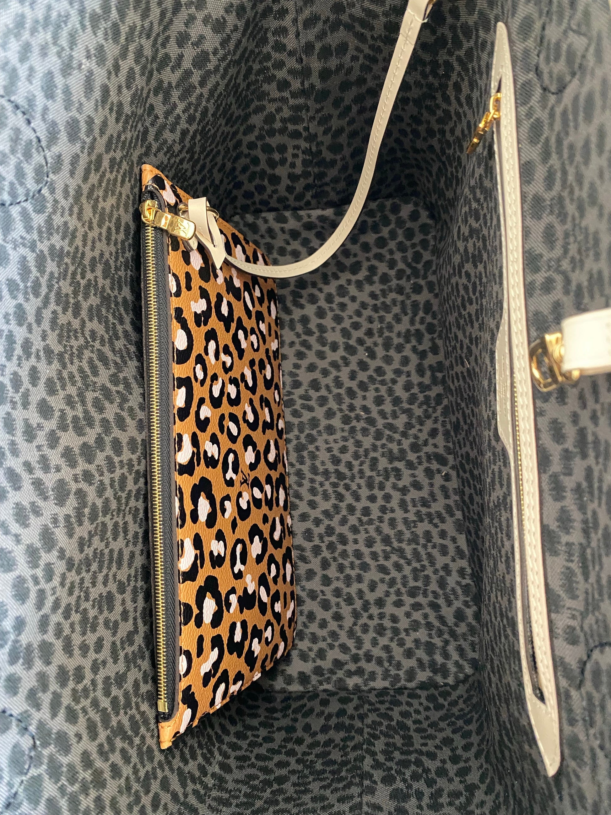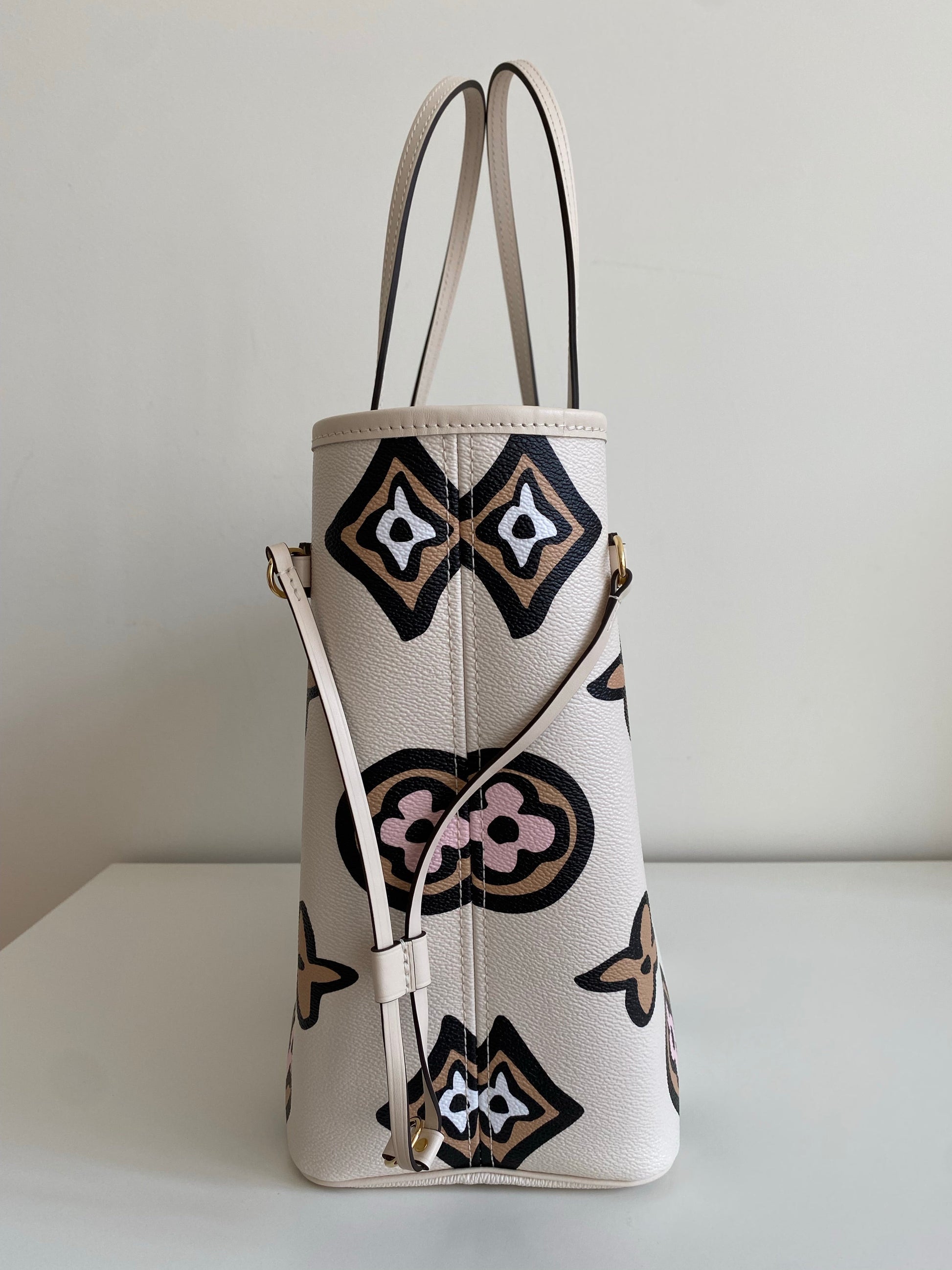 Characteristics: The Neverfull MM tote is arrayed this season in an exclusive Monogram print inspired by an archival design. Part of the Wild at Heart capsule, it has a boldly graphic, hand-painted look. This roomy carryall can be slipped over the shoulder or elbow and comes with a separate zipped pouch that can serve as a clutch or extra pocket.
