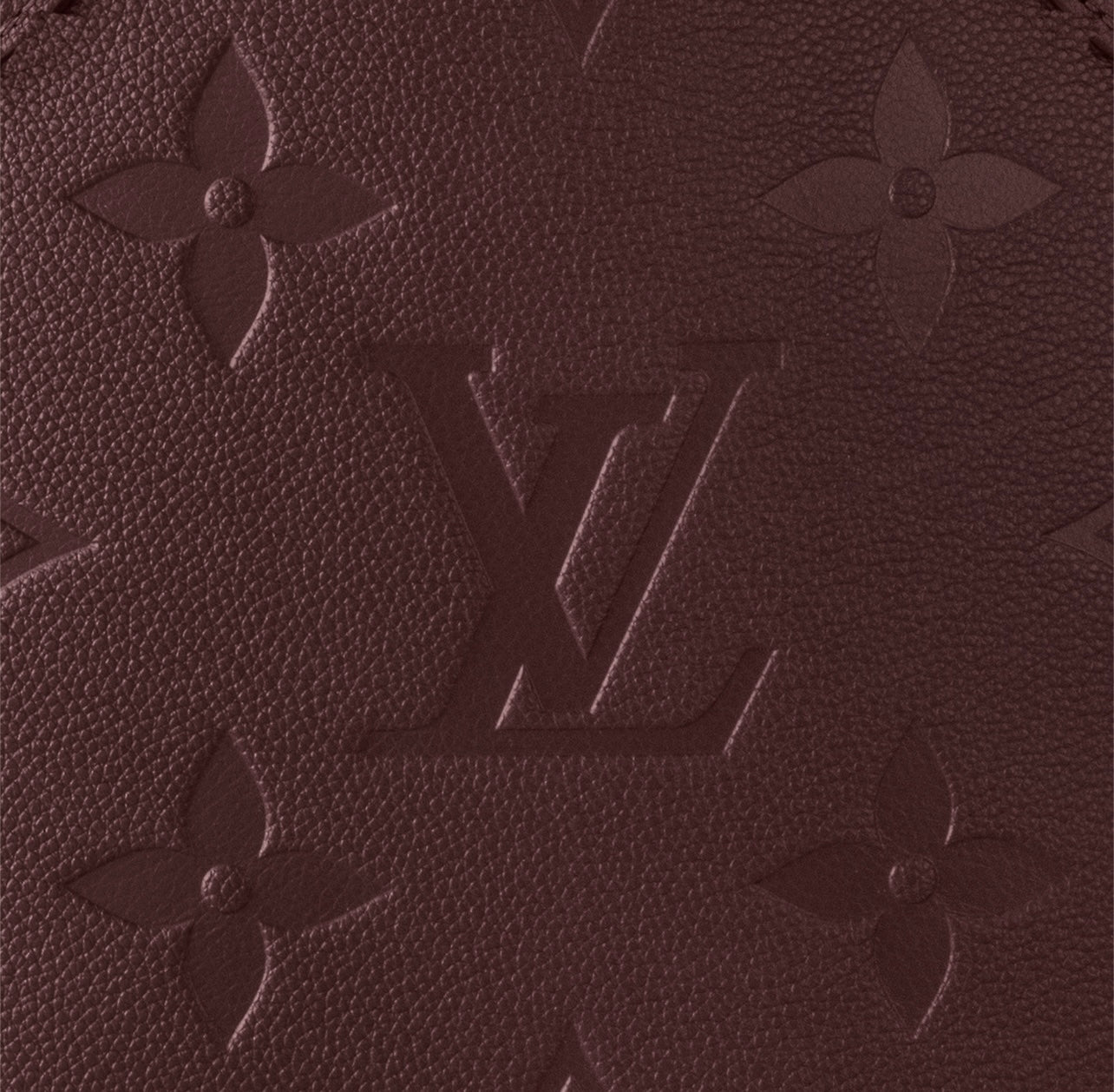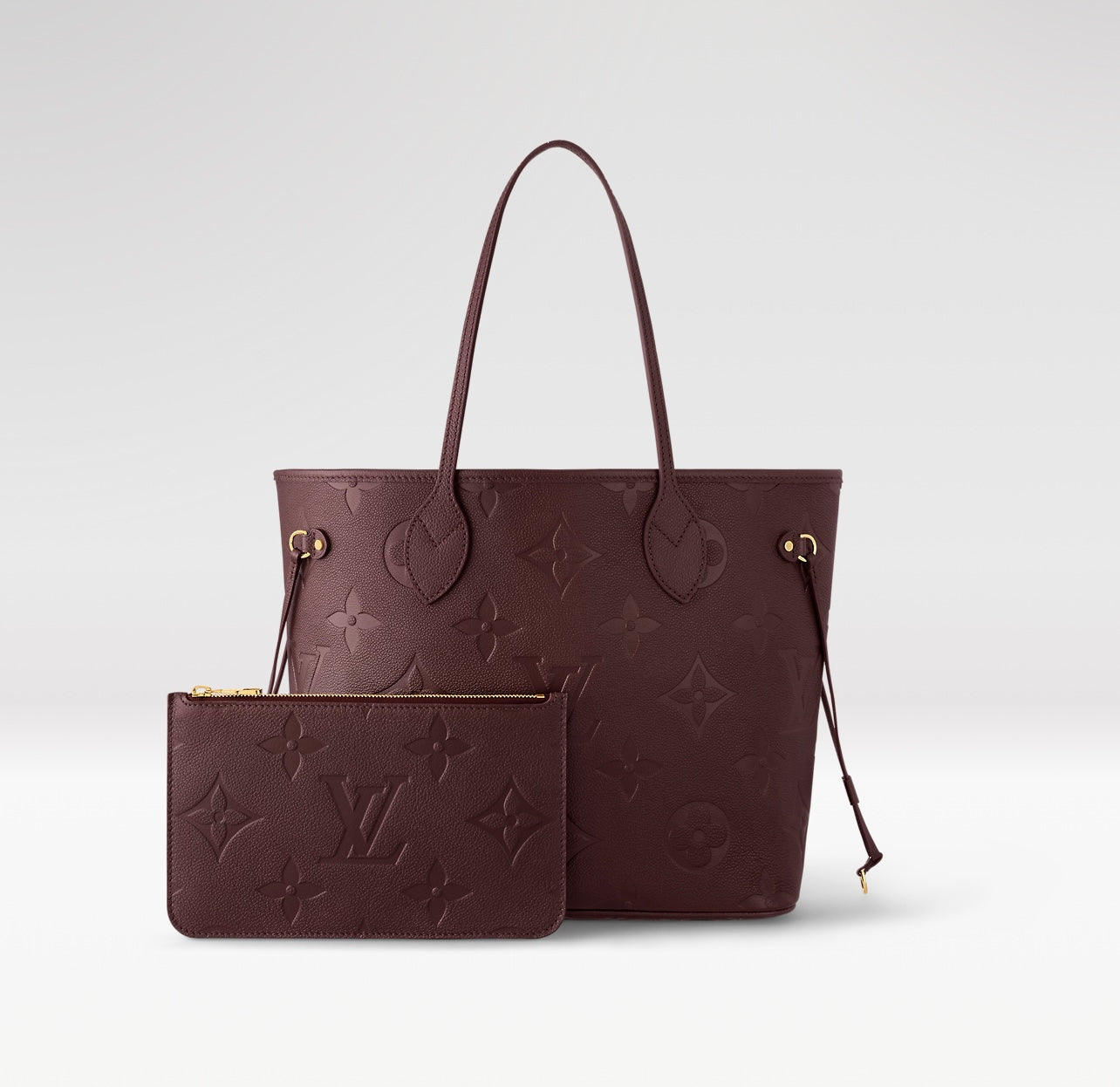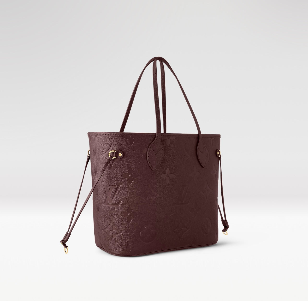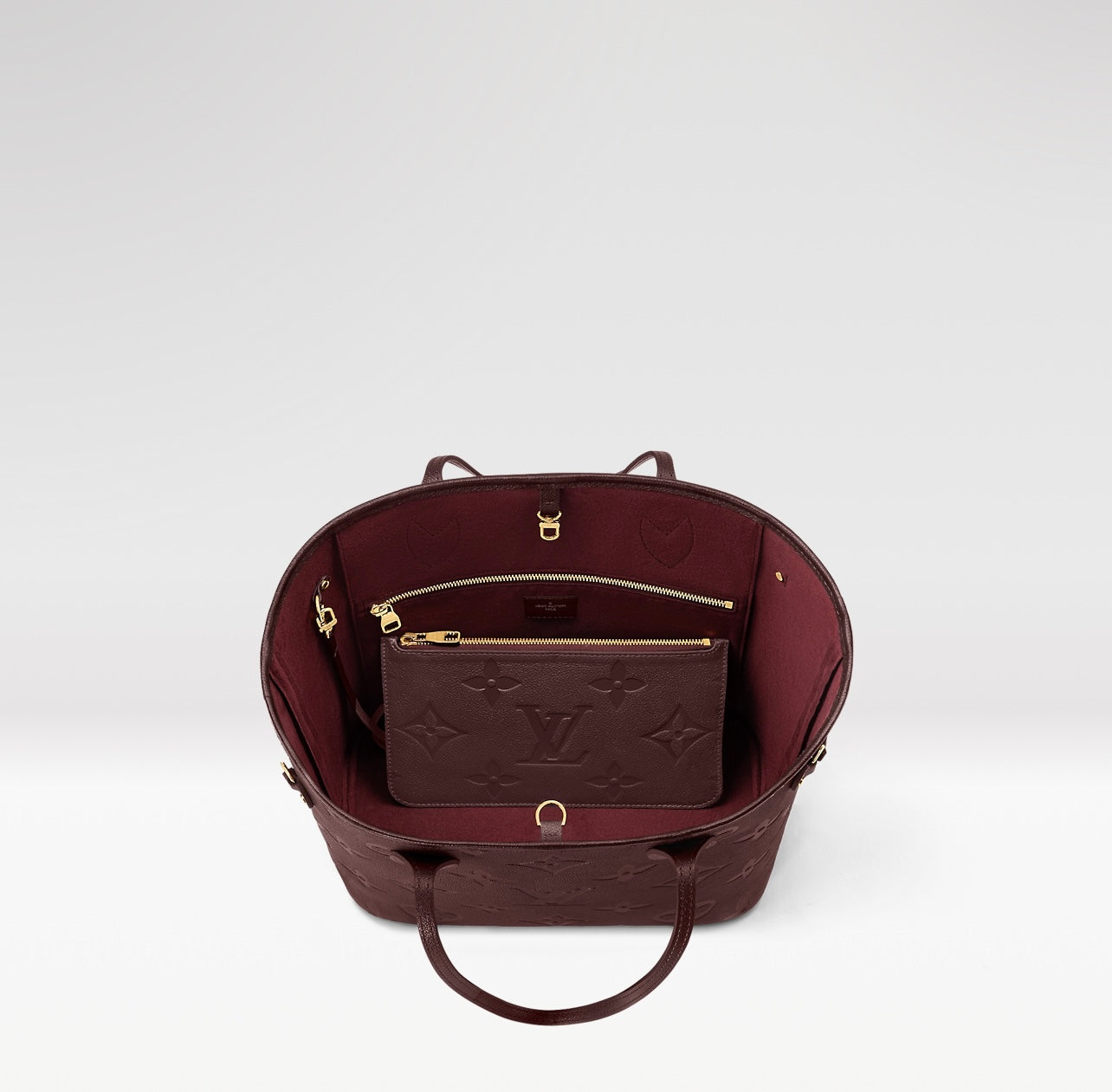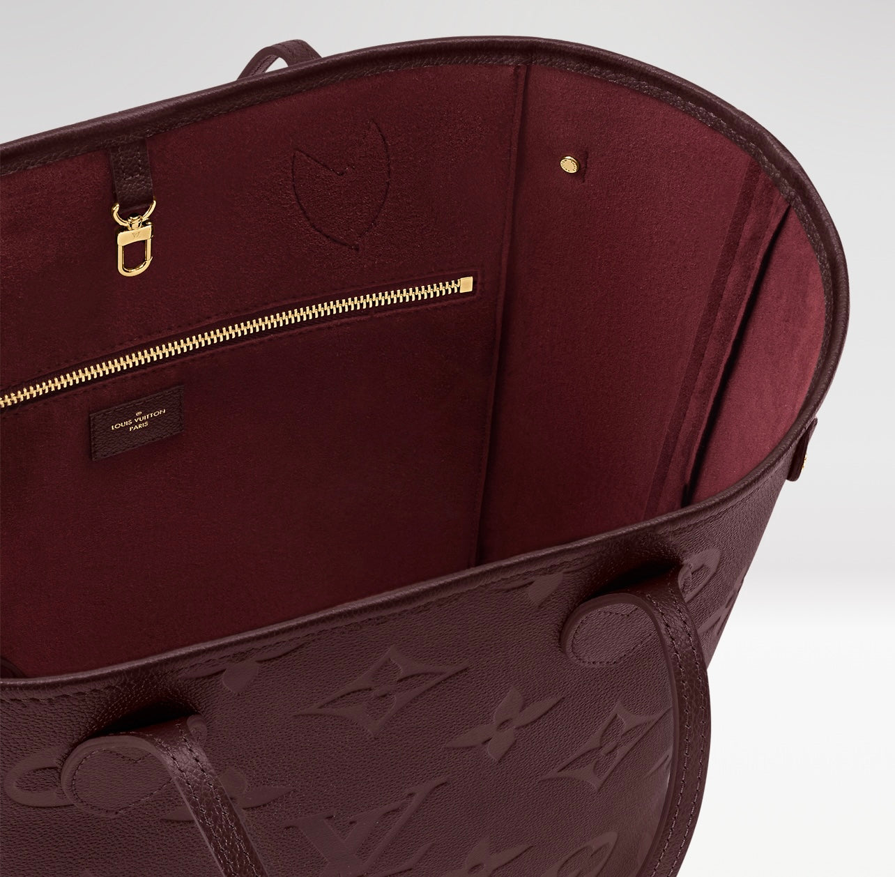 Characteristics: The essential Neverfull MM tote now comes in embossed Monogram Empreinte leather. Its generous dimensions make this bag ideal for everyday use while the long shoulder handles and supple leather mean it’s comfortable to carry. With the side laces cinched, this roomy carryall becomes a stylish city bag. It can be worn over the shoulder or on the elbow. The burgundy color on burgundy color neverfull is a sold out and highly sought after handbag that makes a great investment piece.
