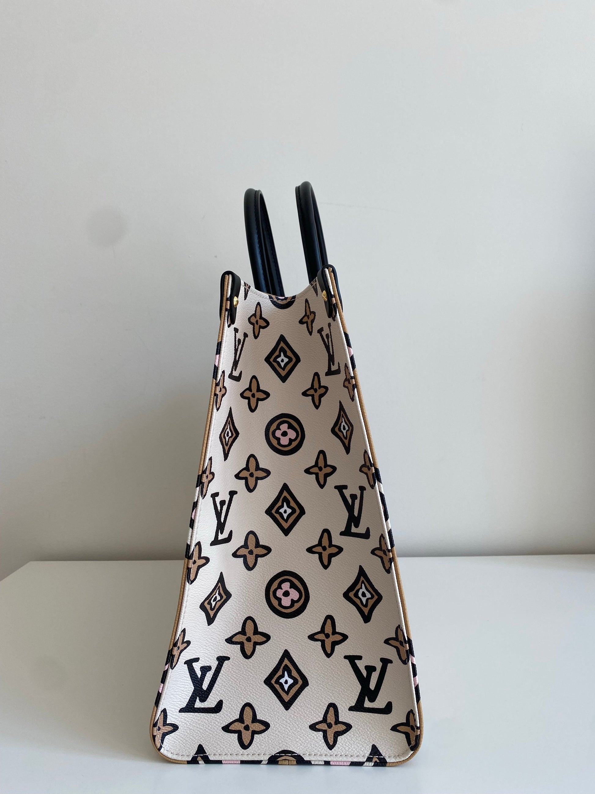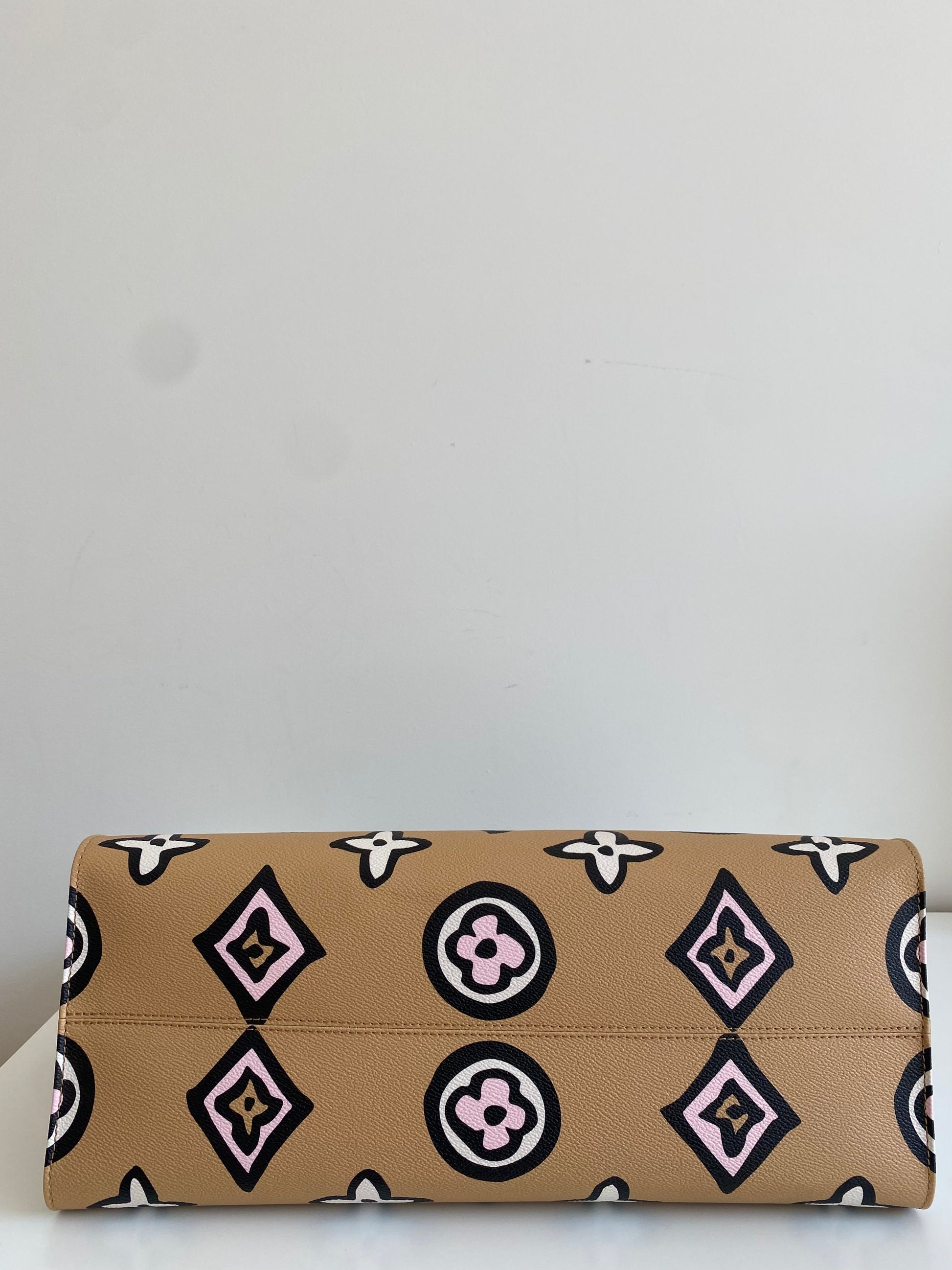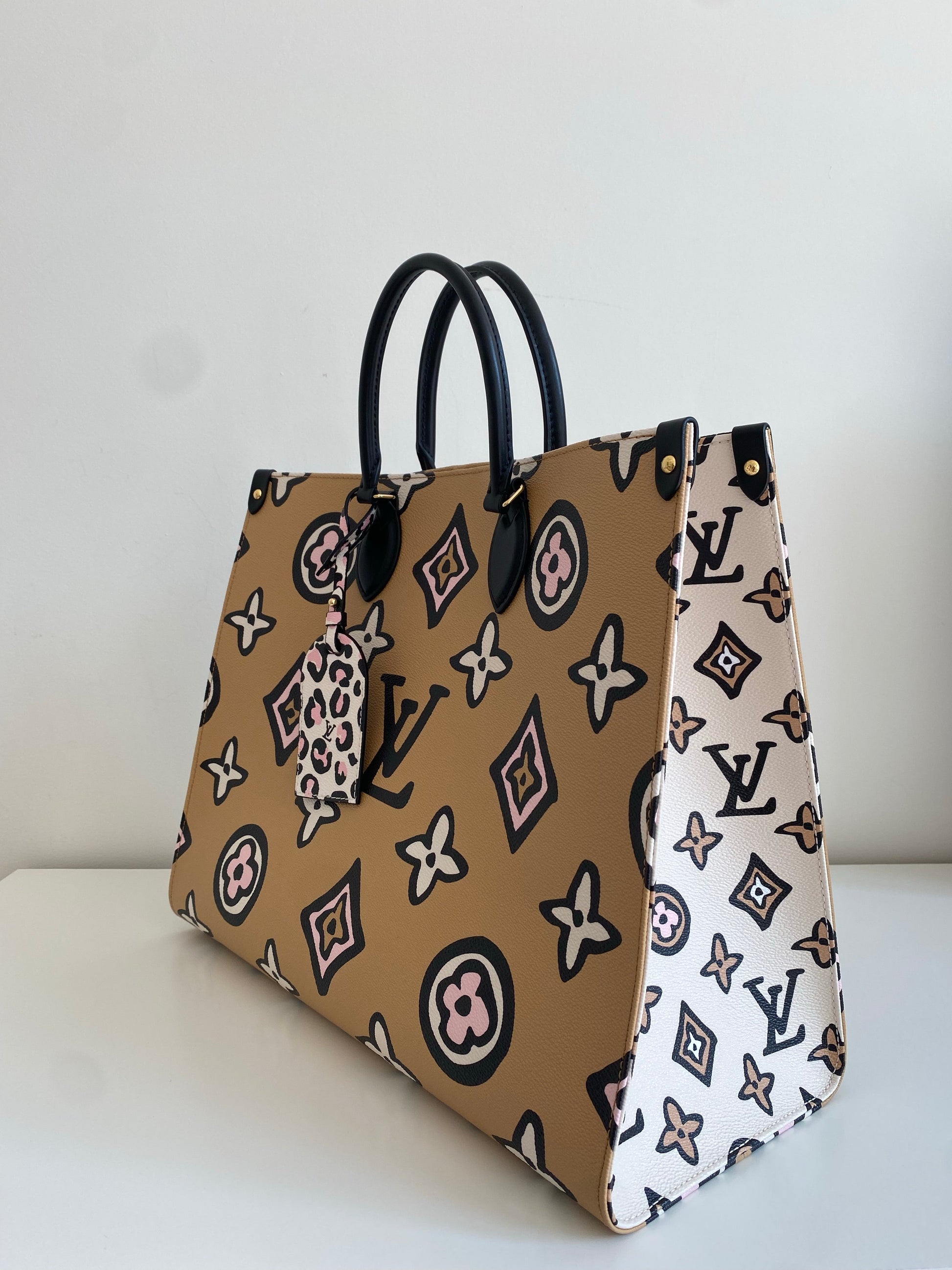 This Onthego GM carryall wears a graphic Monogram print this season, created especially for the Wild at Heart capsule. Inspired by an archival design, the pattern makes a striking fashion statement on this roomy tote, a stylish companion for business, shopping or travel. Long shoulder straps and twin Toron top handles provide several comfortable carry options.