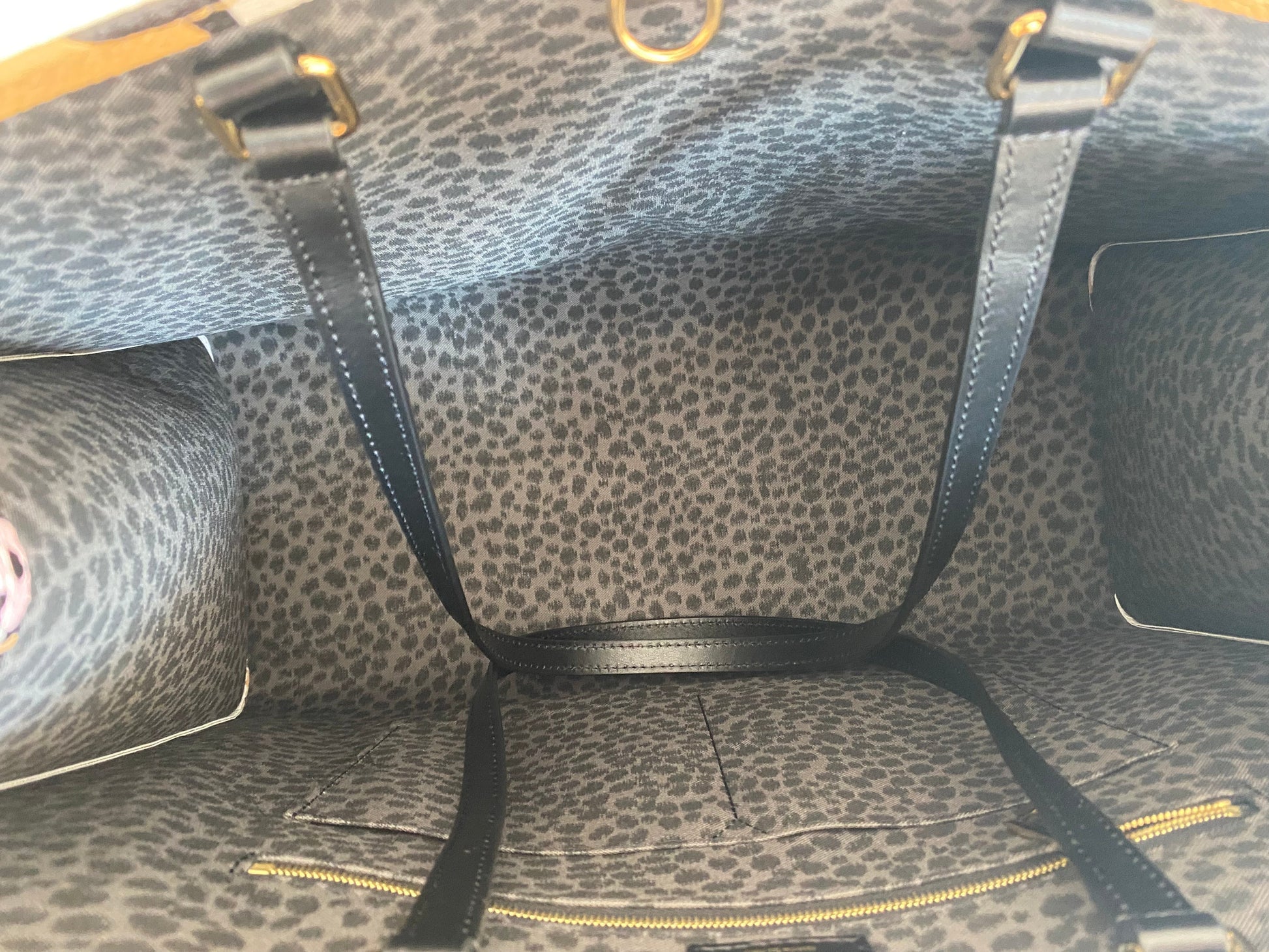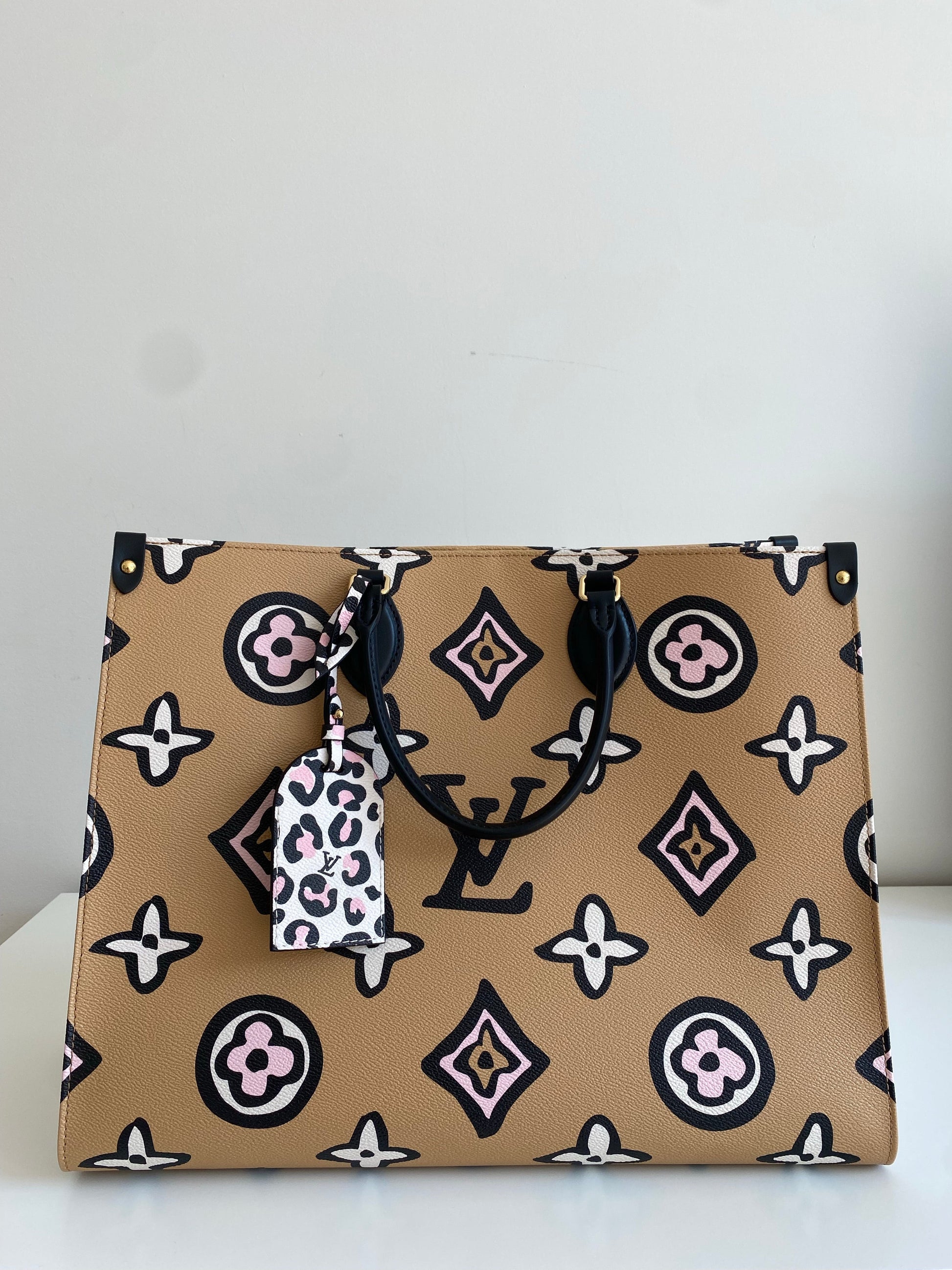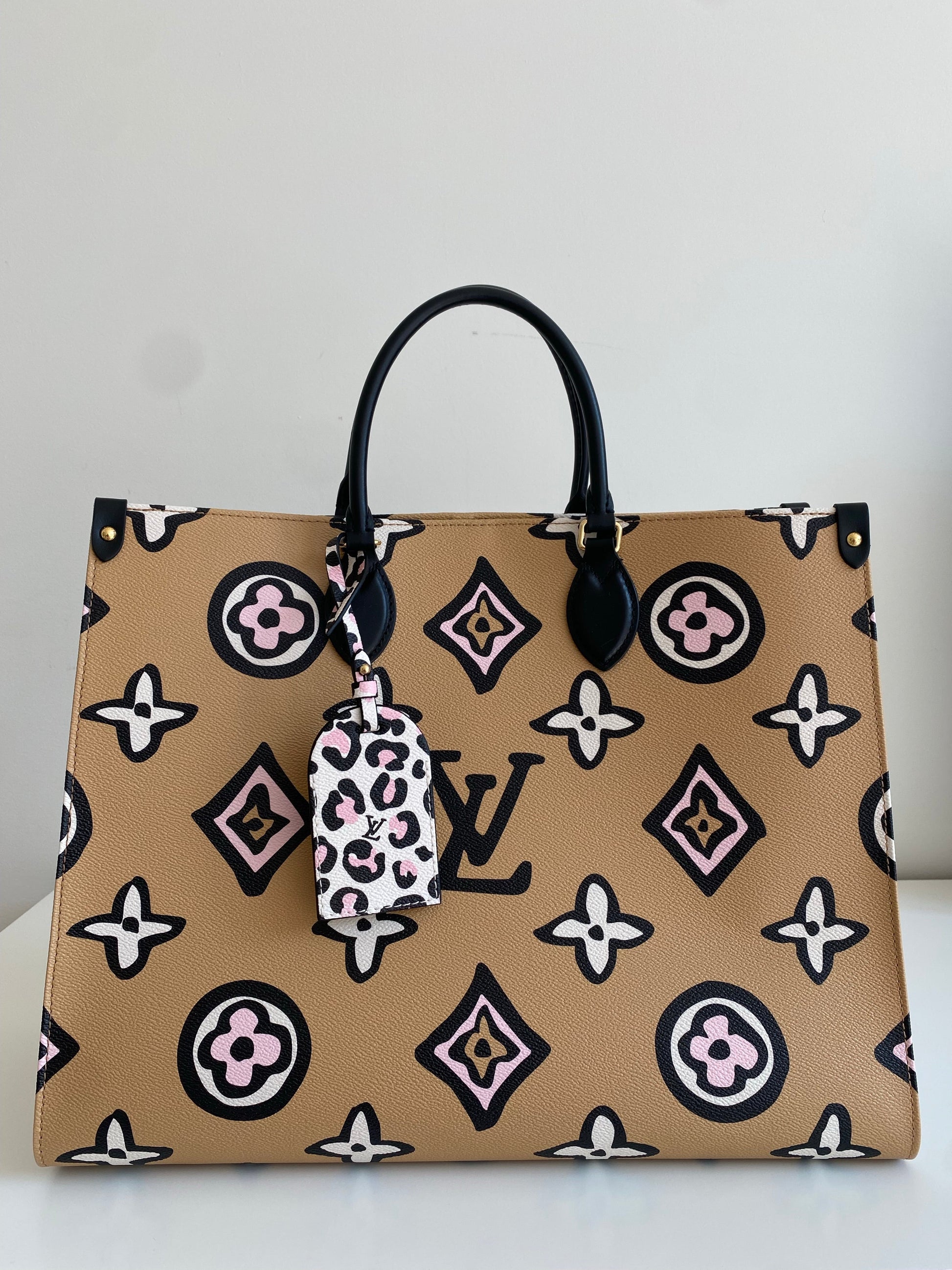 This Onthego GM carryall wears a graphic Monogram print this season, created especially for the Wild at Heart capsule. Inspired by an archival design, the pattern makes a striking fashion statement on this roomy tote, a stylish companion for business, shopping or travel. Long shoulder straps and twin Toron top handles provide several comfortable carry options.