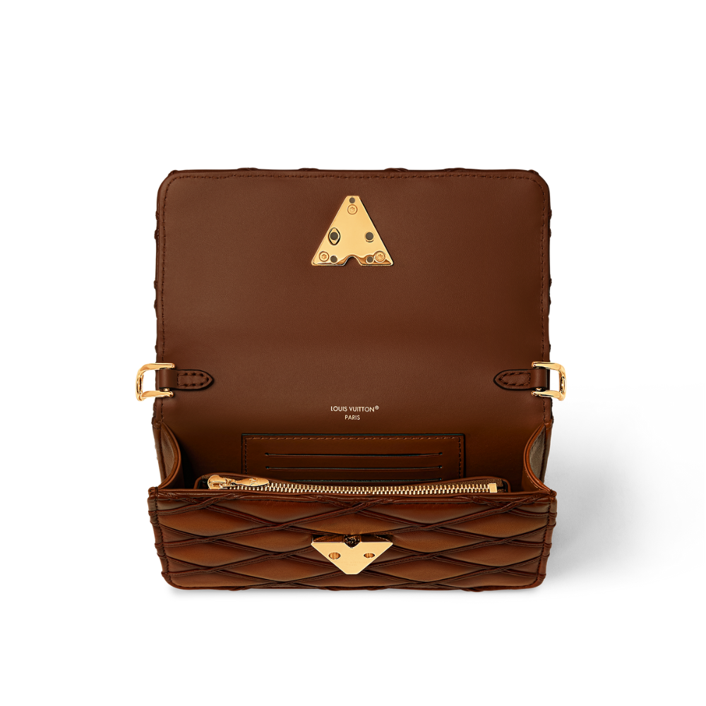 Introducing the new Wallet On Chain GO-14, designed as the perfect day-to-evening handbag. It is crafted from precious quilted lambskin leather and is elevated with signature details including an LV lock and an interlaced round sliding chain that offers multiple styling options. Remove the gold-tone enchappés to turn it into a chic pochette.