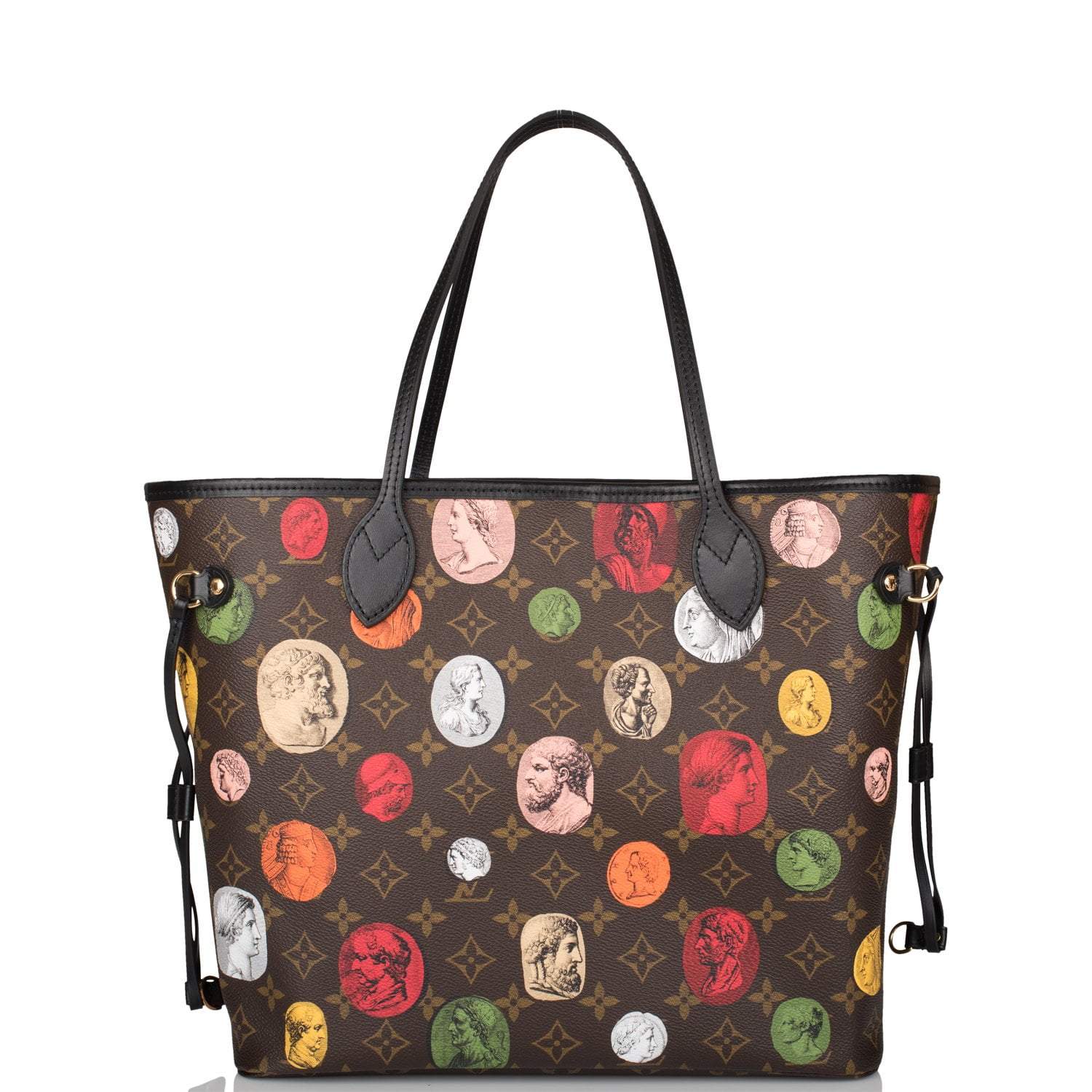 This limited edition Fornasetti Neverfull MM is of monogram coated canvas with polished brass hardware and features Greco-Roman printed motifs, black leather top strap handles, trim and side cinch cords with polished gold tone hardware and hidden top hook closure.