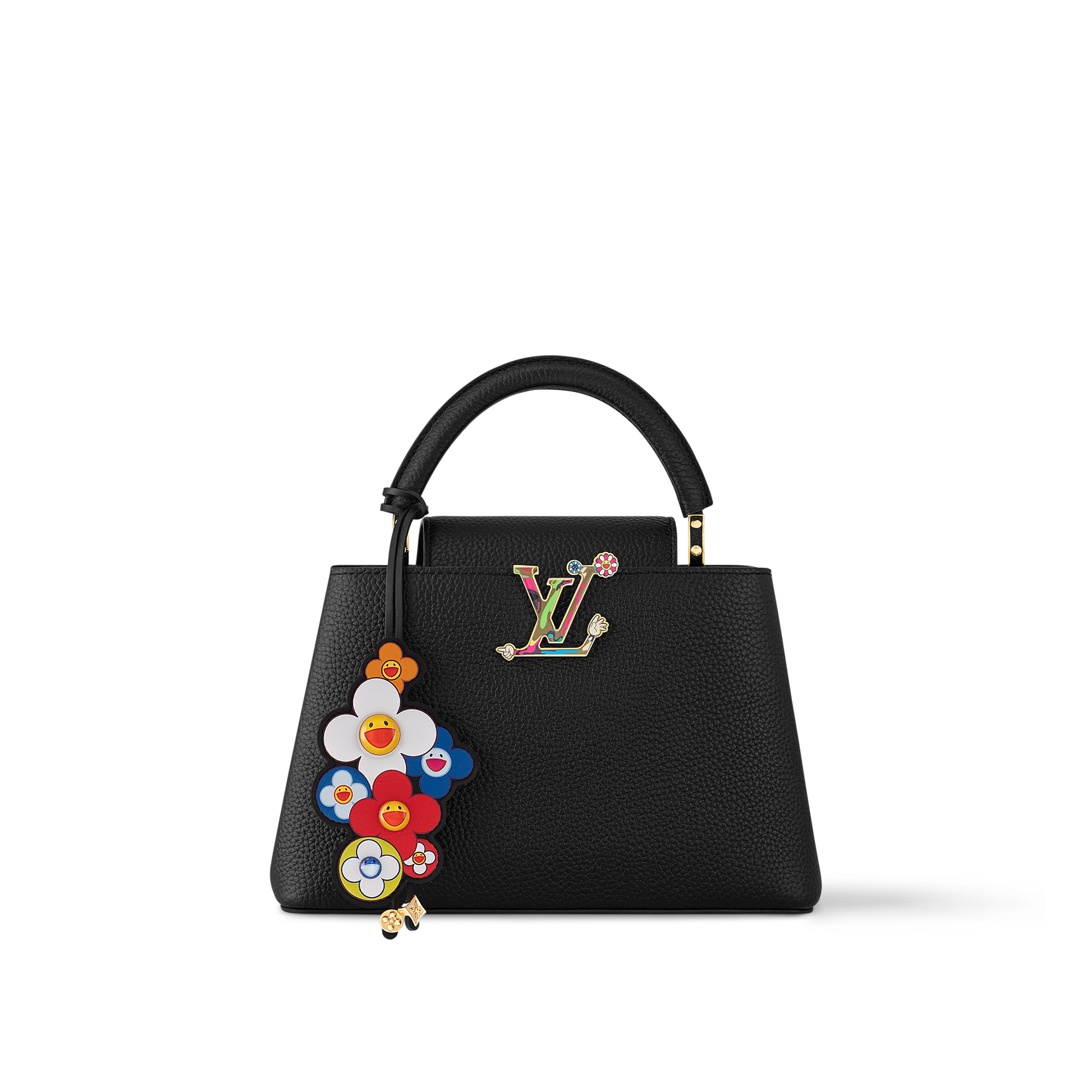 Bold signatures from the second edition of the Louis Vuitton x Murakami Collection elevate the House’s iconic Capucines BB bag into a playful statement. It exudes timeless House codes in Taurillon leather detailed with golden hardware, while the Japanese artist’s Superflat style reimagines the emblematic LV Initials on the front and a cluster of Monogram Flowers that feature as a bag charm.