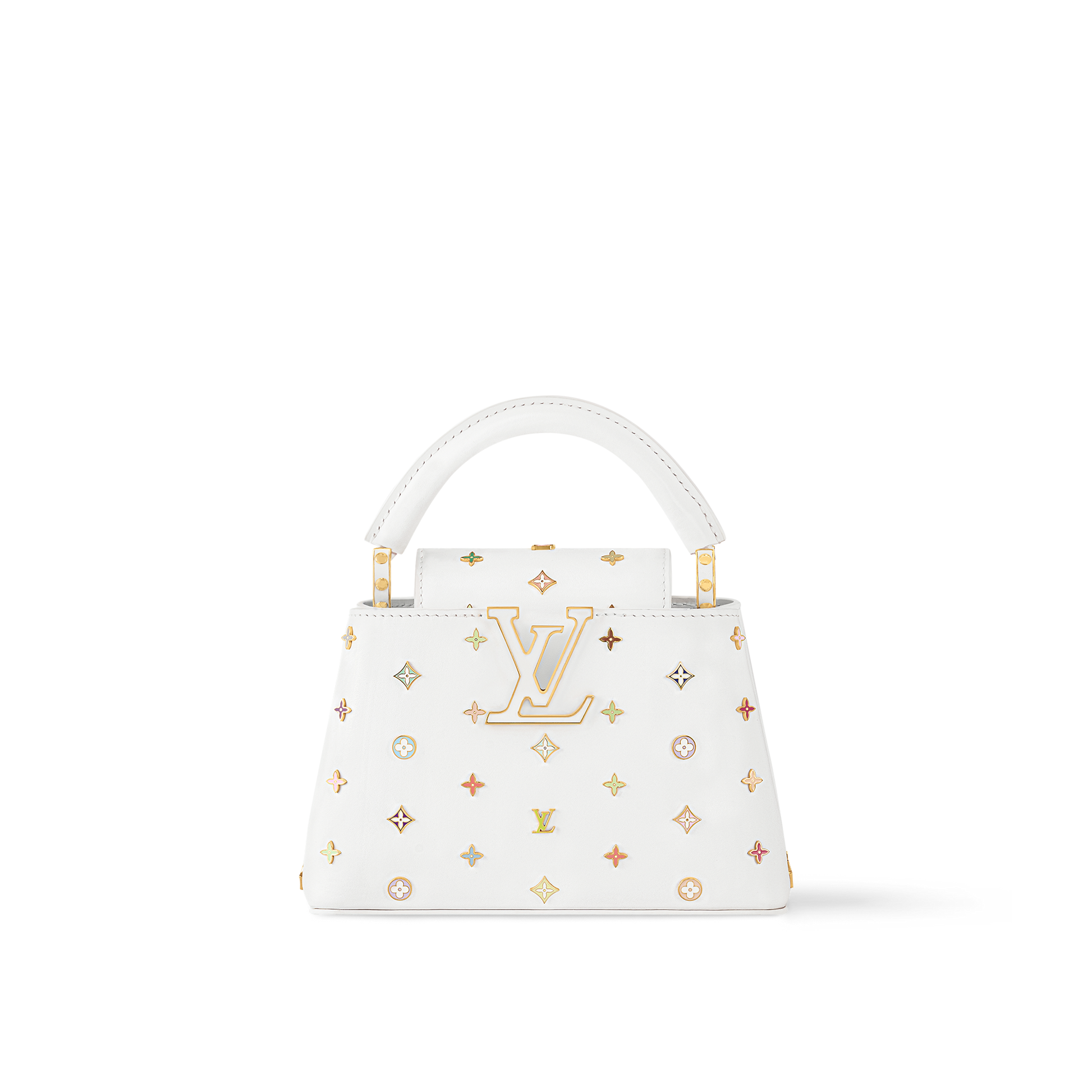 The joyful rainbow palette of Japanese artist Takashi Murakami uplifts this chic Capucines Mini bag with a fresh signature finish. It is crafted in playful proportions from Taurillon leather, which is embellished with a multicoloured Monogram motif in metallic studs, while the soft pink cowhide lining strikes a subtle contrast inside. A removable braided strap offers versatile carry options and the compartmented interior organises daily essentials such as a smartphone and a compact wallet.