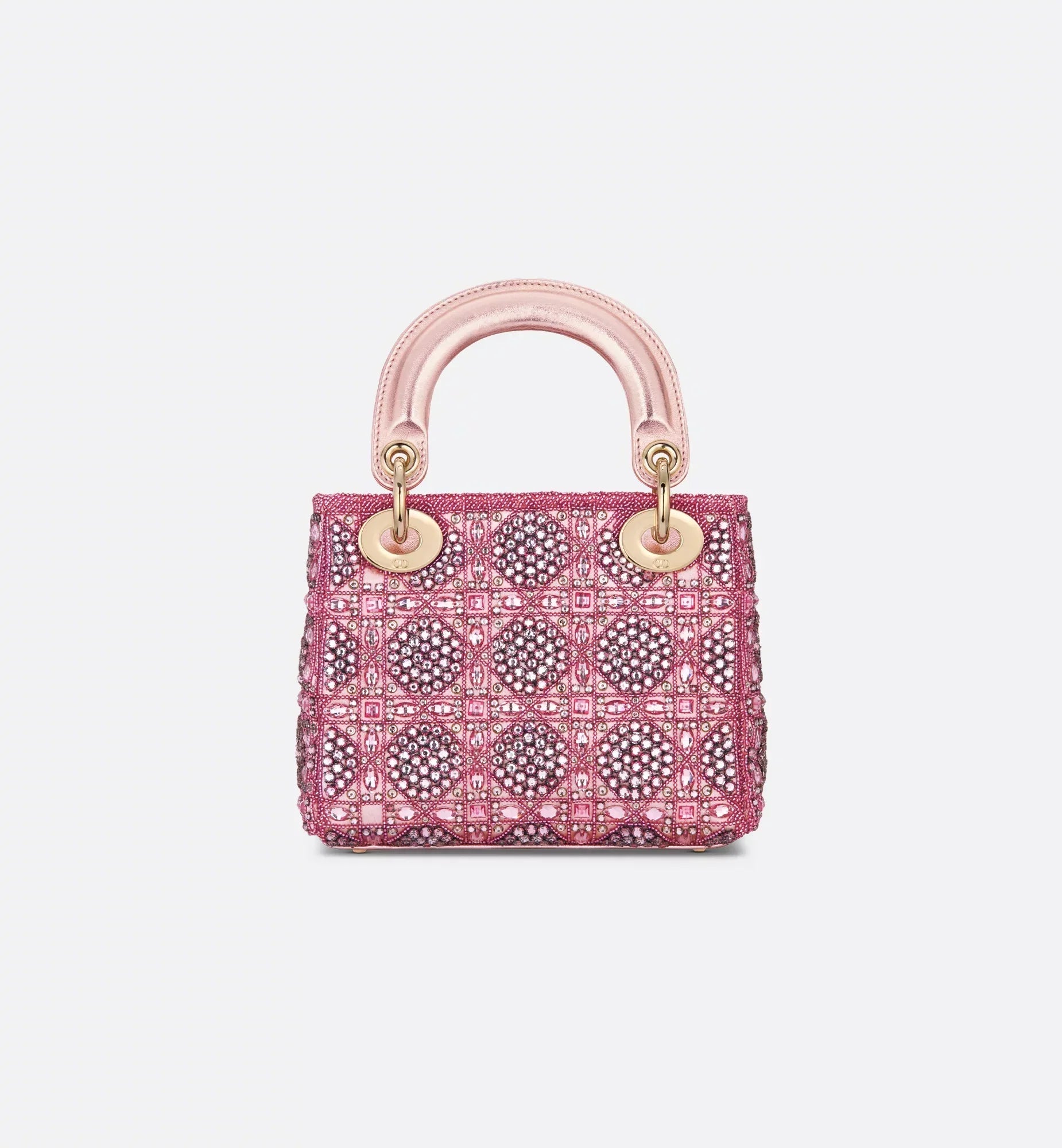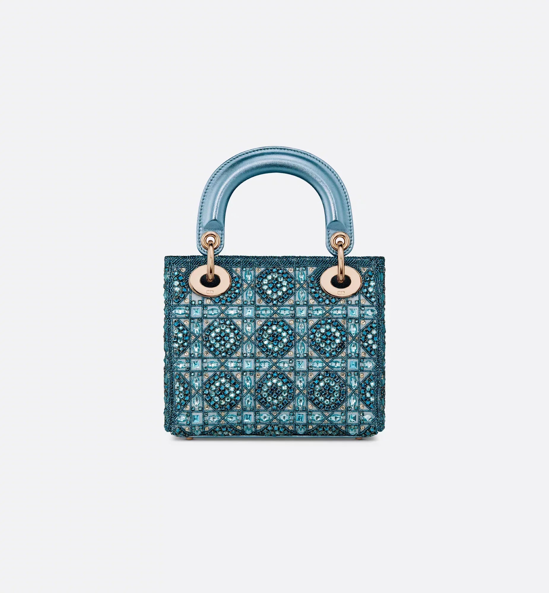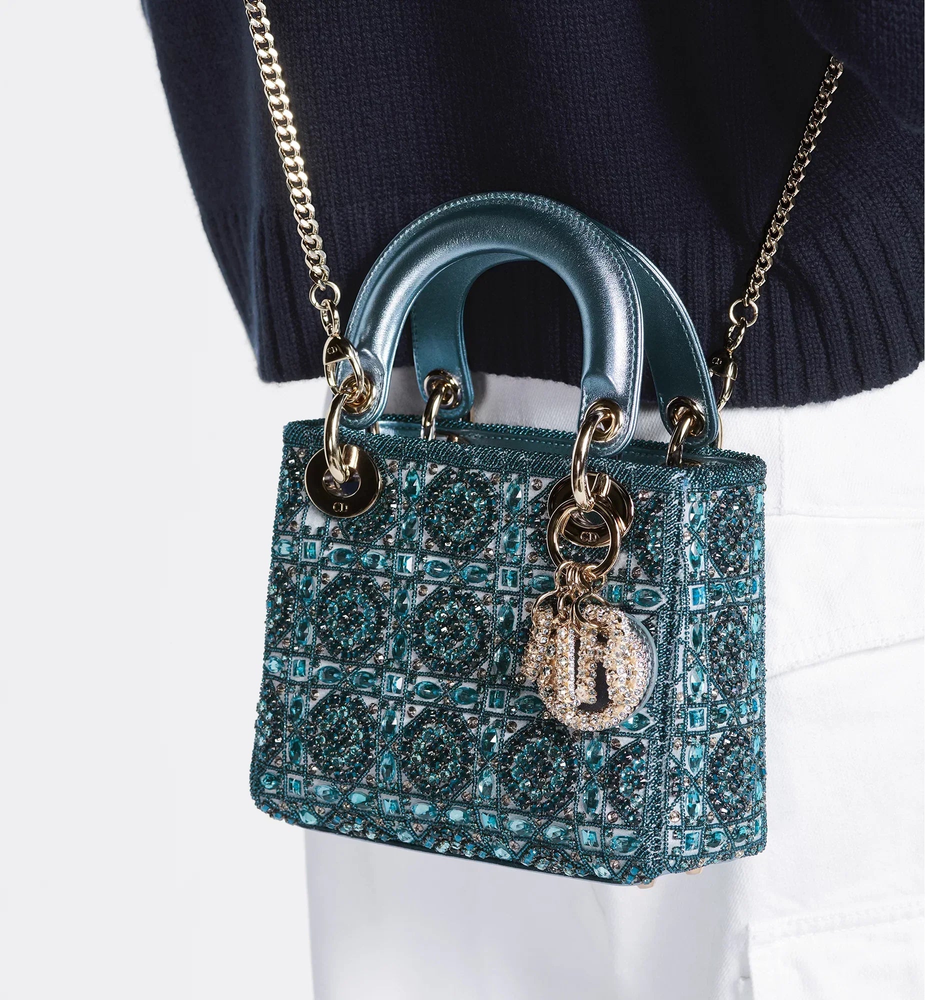 The Lady Dior bag epitomizes Dior's vision of elegance and beauty. Demonstrating the House's unique leather craftsmanship, the style is offered in Rose des Vents satin, embroidered with a multitude of beads in a hallmark Cannage design, while the top handles are crafted in tonal metallic lambskin. Pale gold-finish metal D.I.O.R. charms are adorned with white crystals, illuminating its silhouette. The miniature style, with its removable chain shoulder strap, can be carried by hand or worn crossbody and will be the ideal evening companion.