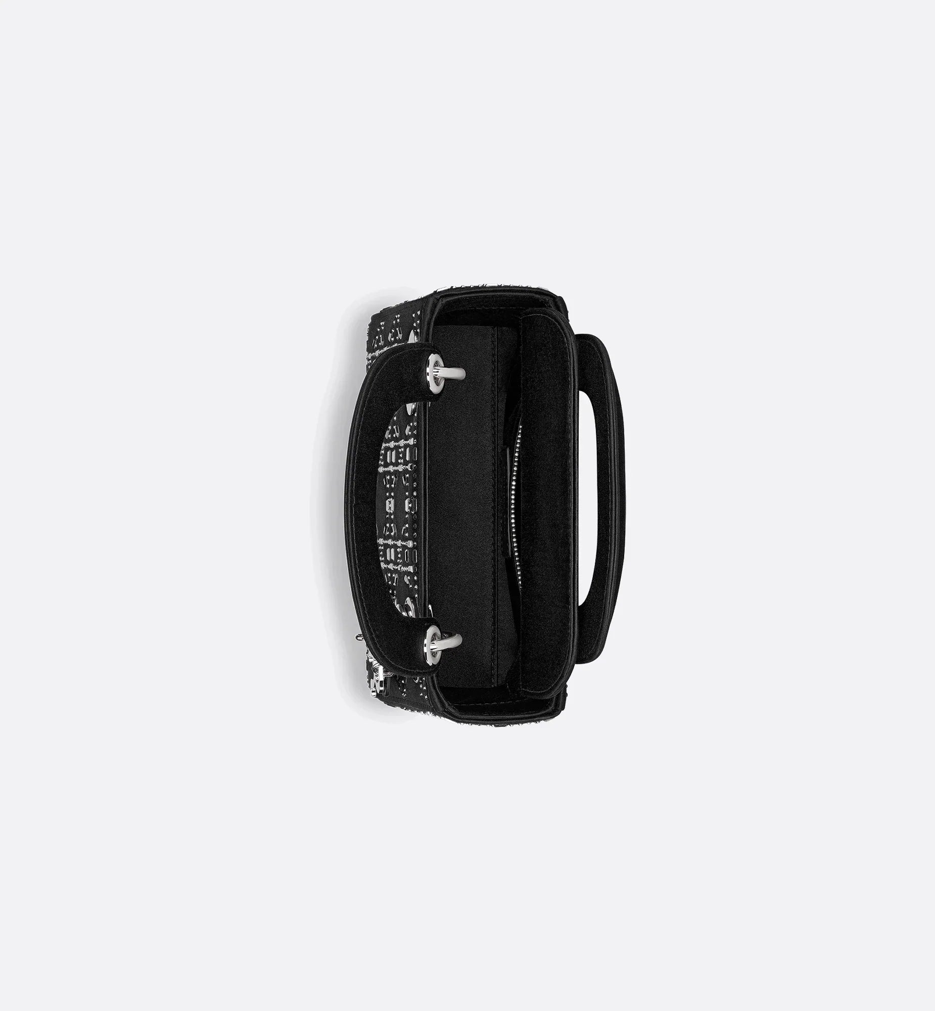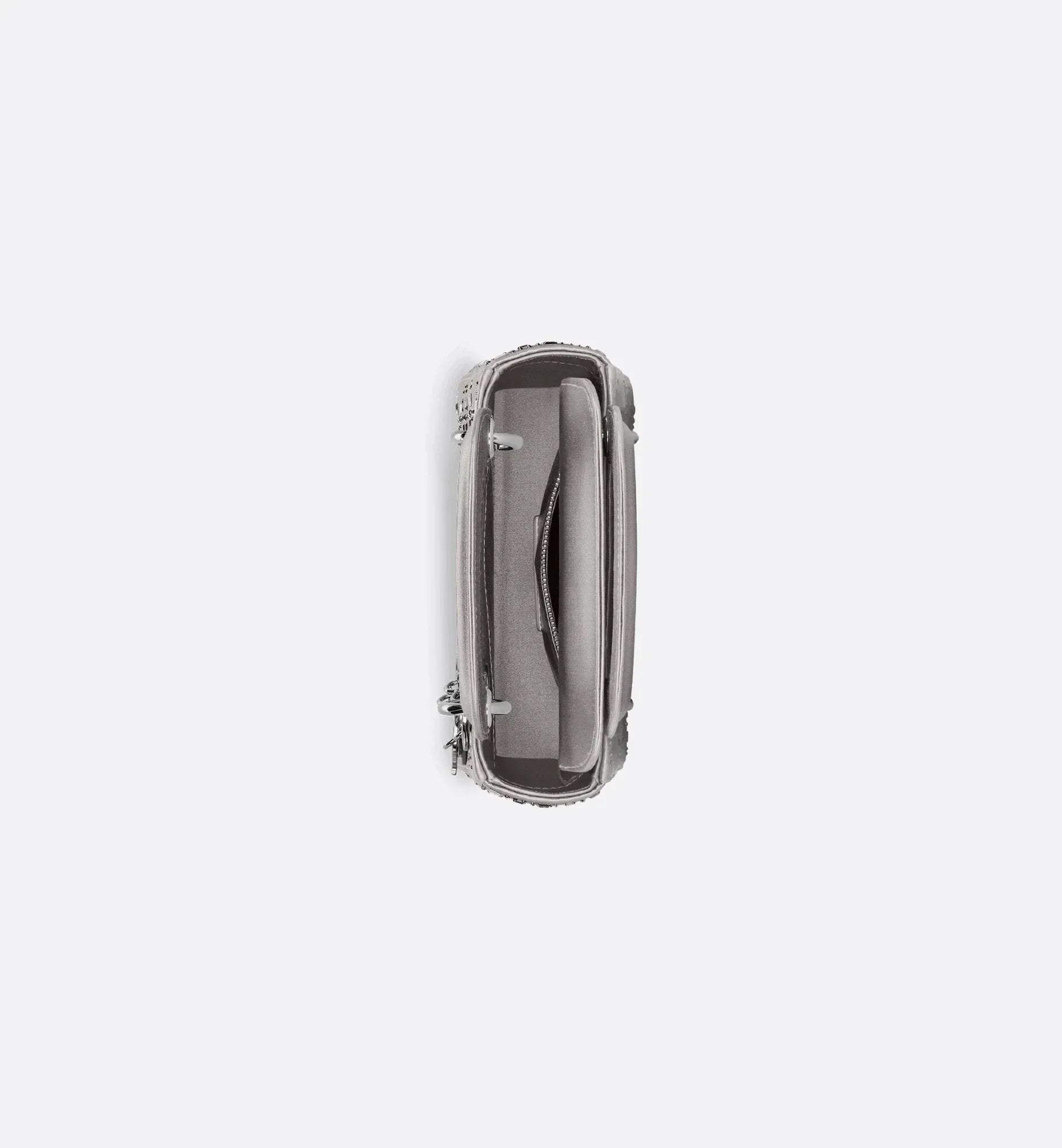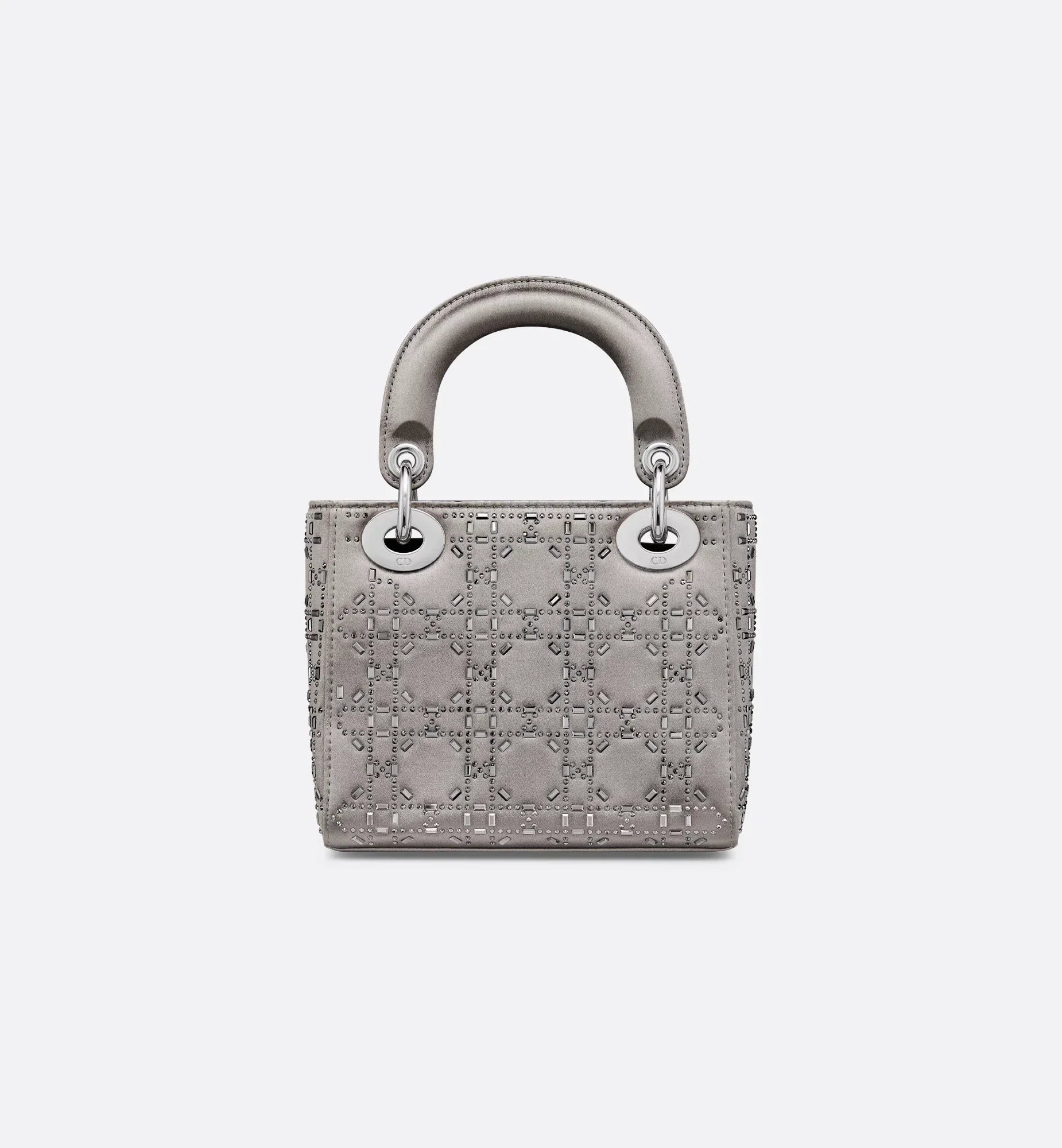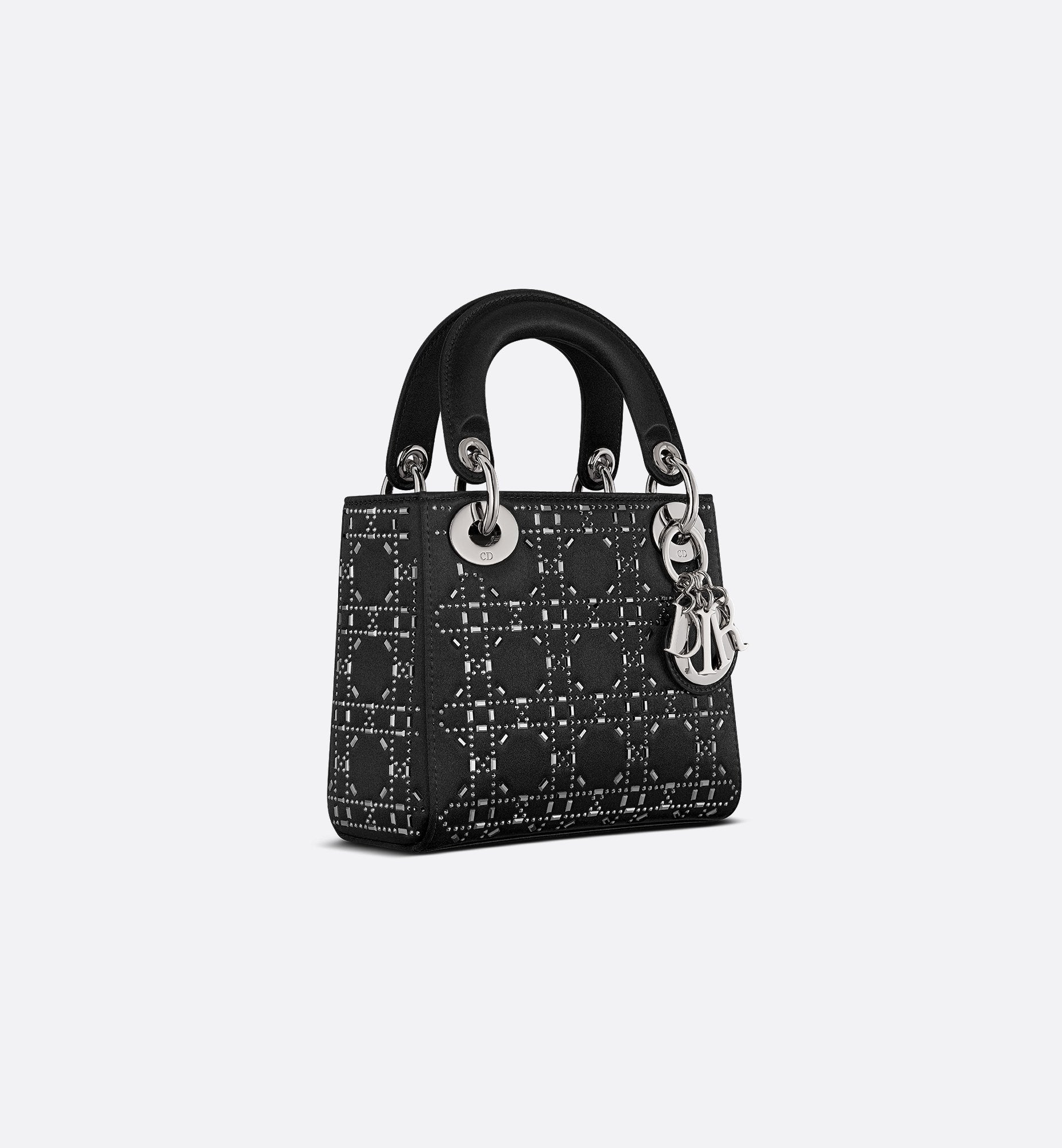 The Lady Dior bag epitomizes the House's vision of elegance and beauty. Sleek and refined, the creation is timeless. Crafted in black satin and covered with strass, the design will complement a sophisticated look. Palladium-finish metal signature D.I.O.R. charms embellish and illuminate its silhouette. Featuring a thin removable satin shoulder strap, the miniature Lady Dior bag can be carried by hand or worn crossbody as an ideal evening wear companion.