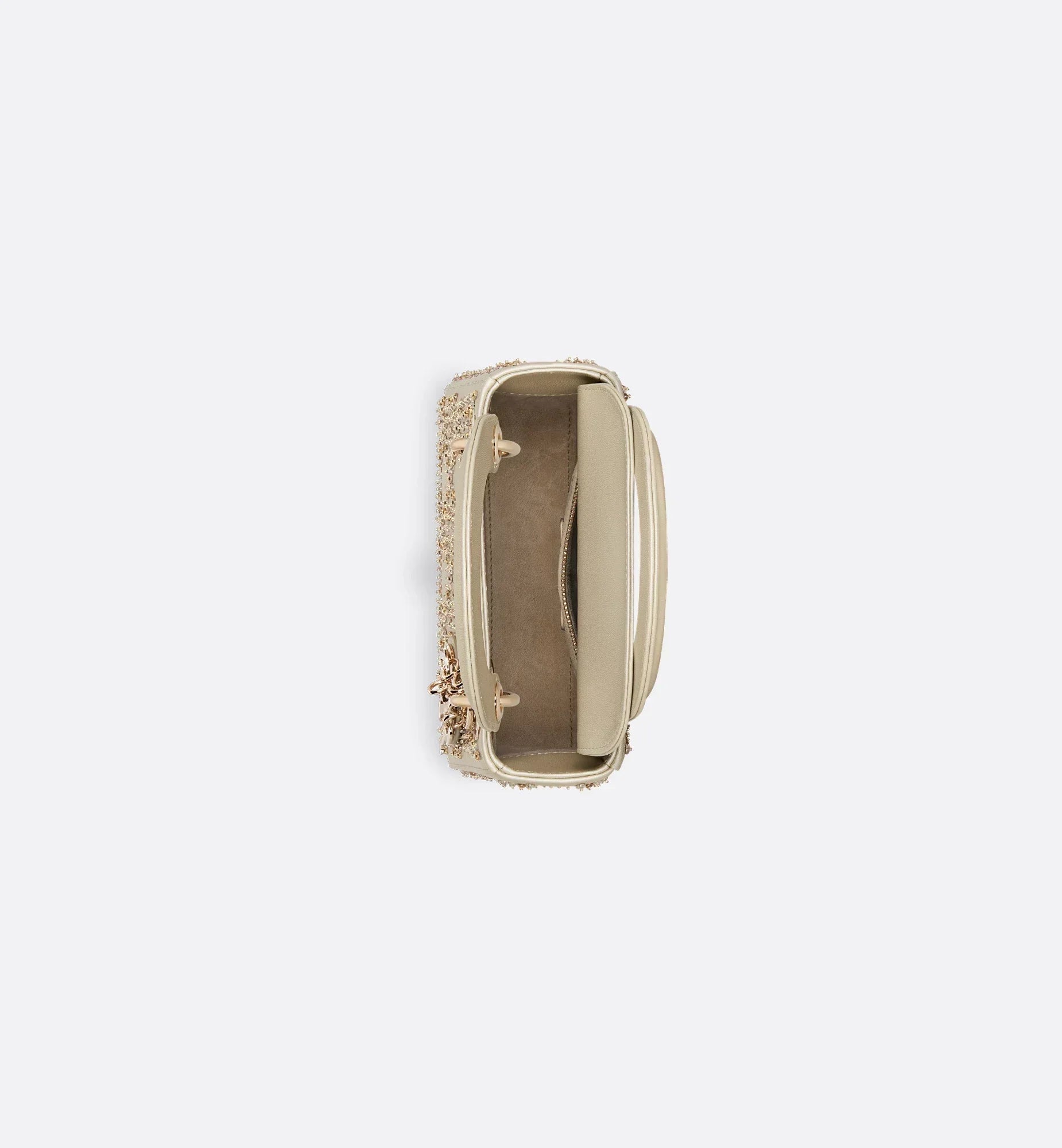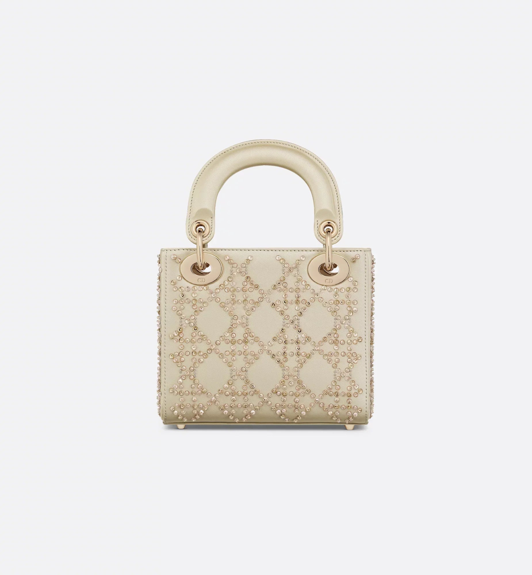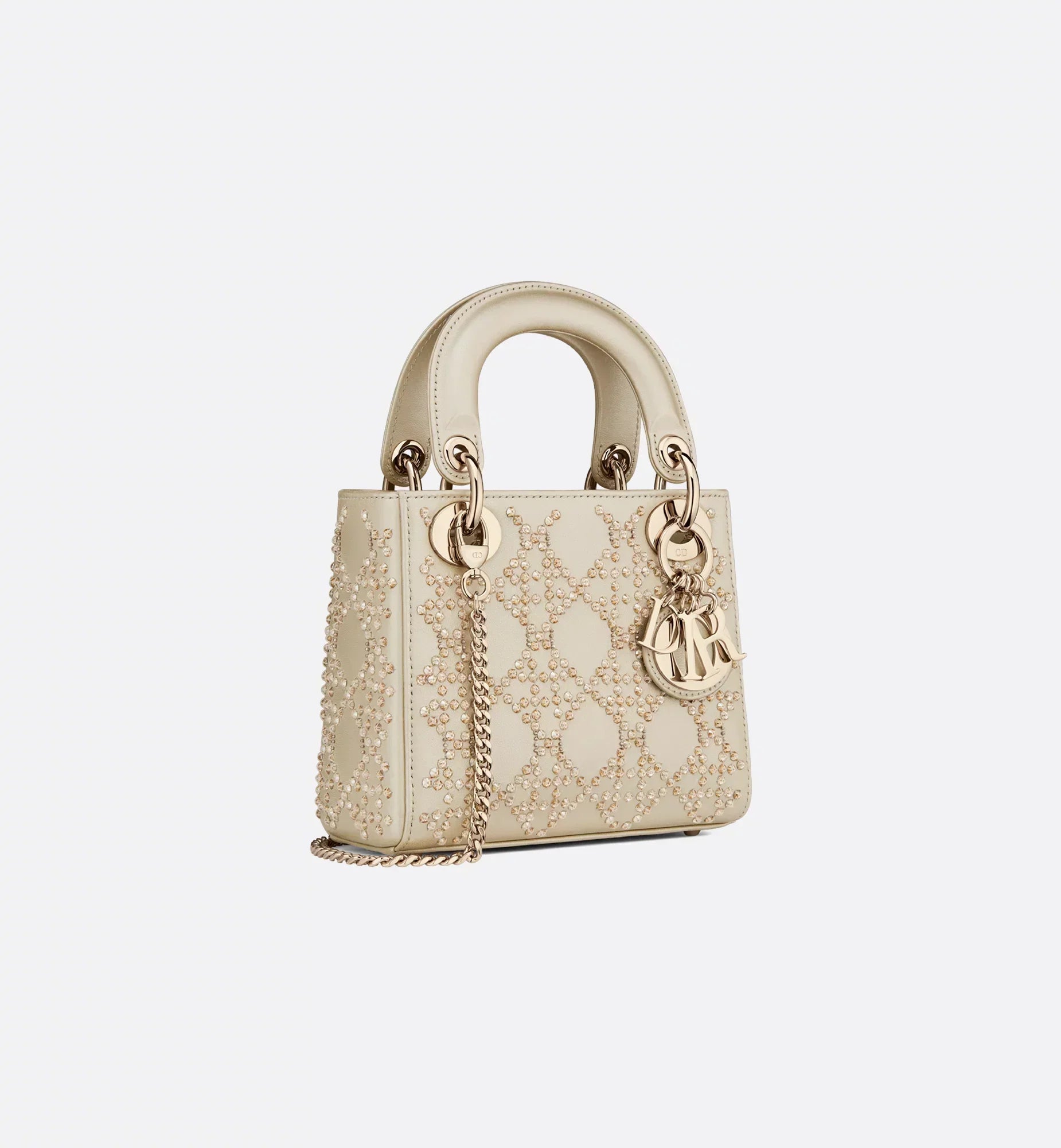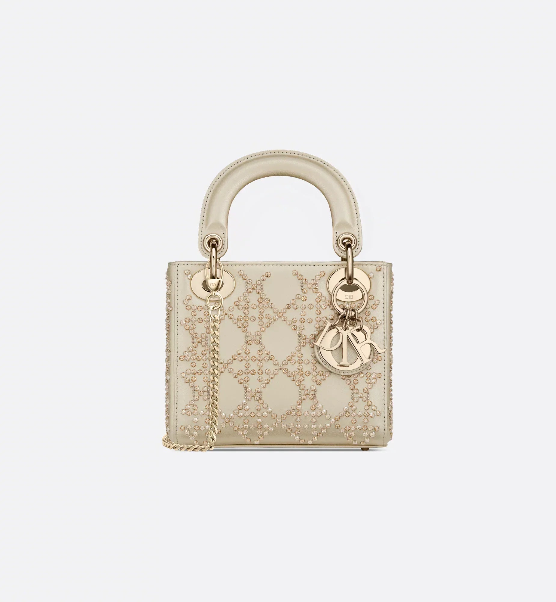 The Lady Dior bag embodies Dior's vision of elegance and beauty. Sleek and refined, the timeless yet modern style is rafted in platinum-tone metallic lambskin and embroidered with faceted beads that capture the light and create a Cannage motif, while the pale gold-finish metal D.I.O.R. charms further embellish its silhouette. The miniature style, an ideal evening wear companion, has a removable chain shoulder strap.