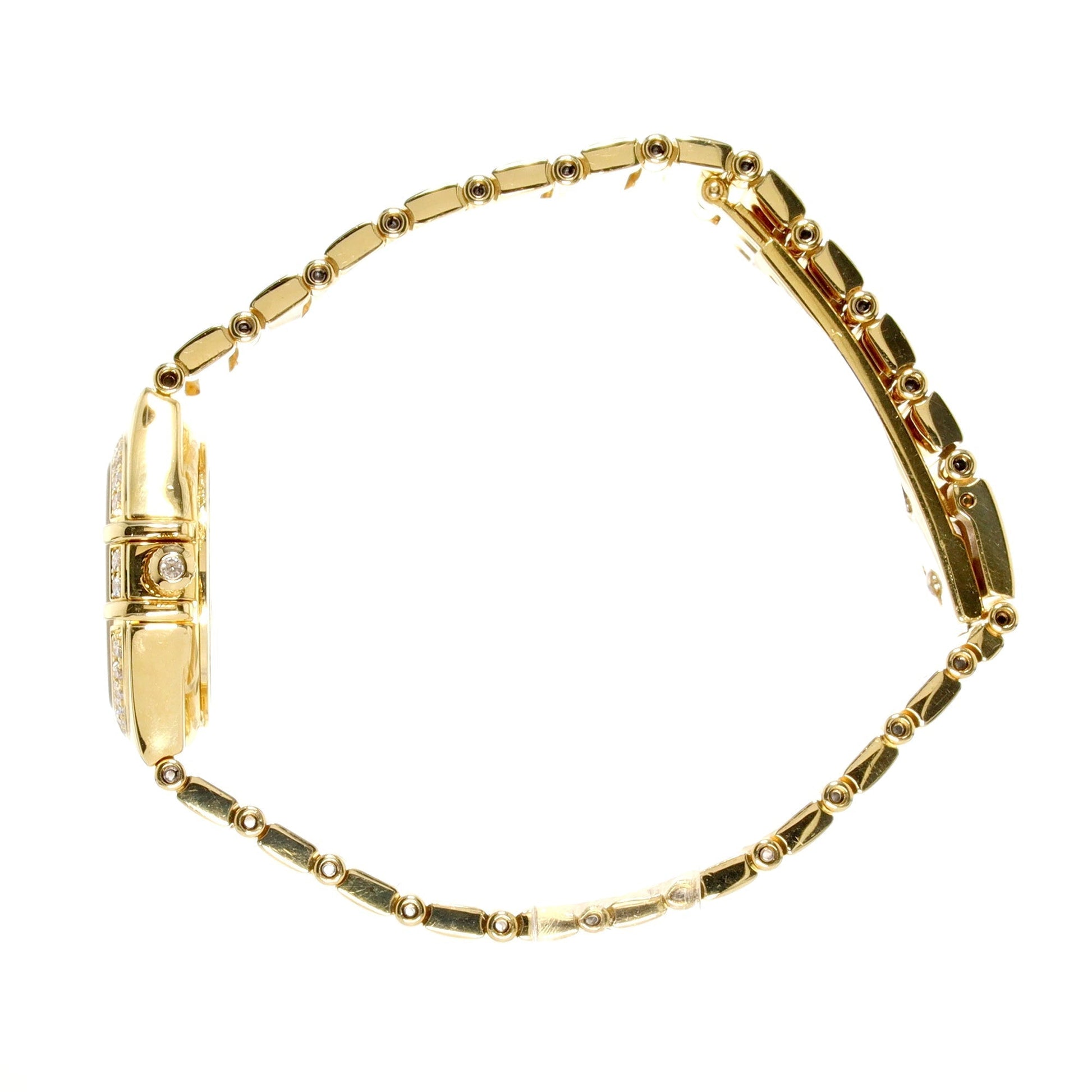 The white Mother of Pearl Dial features polished gold hands and pyramid hour markers, with a central disk of gold with pavé diamonds.