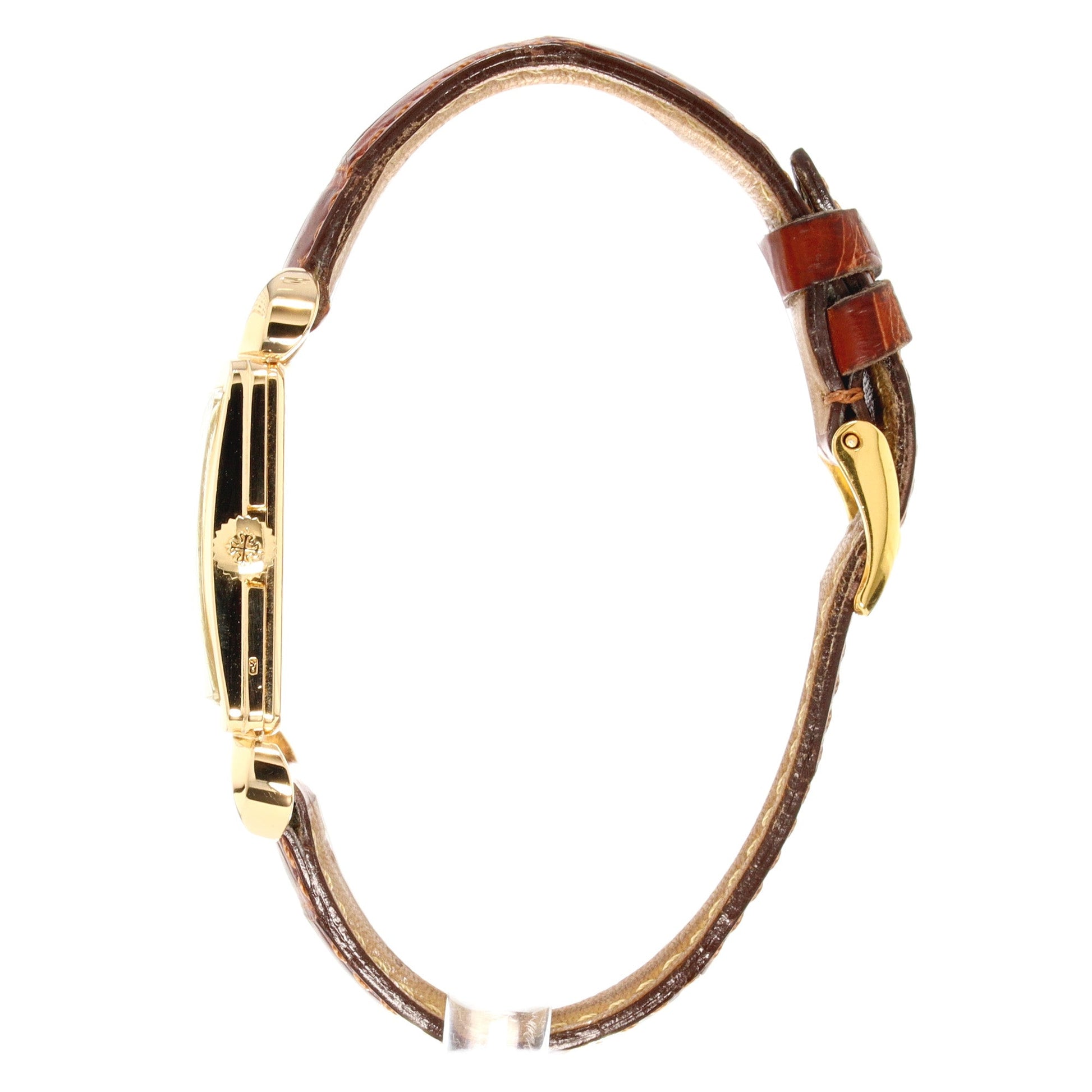 The brown alligator dial is equipped with a gold tang buckle.