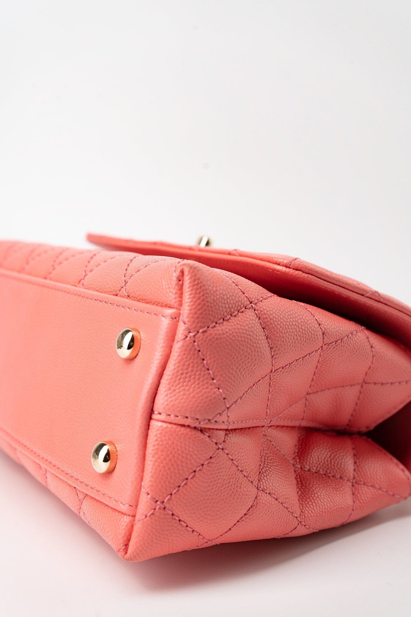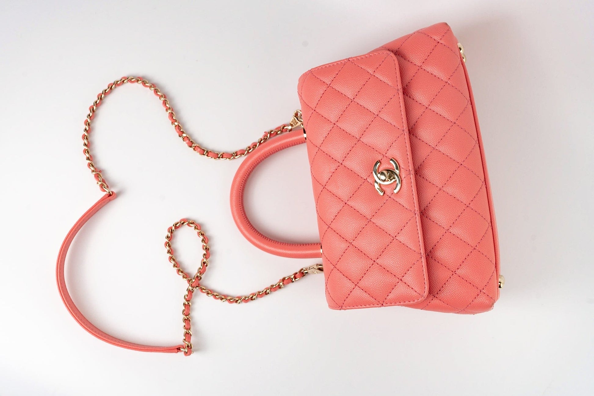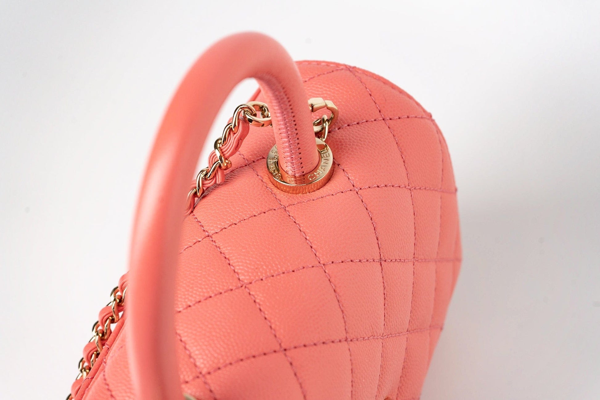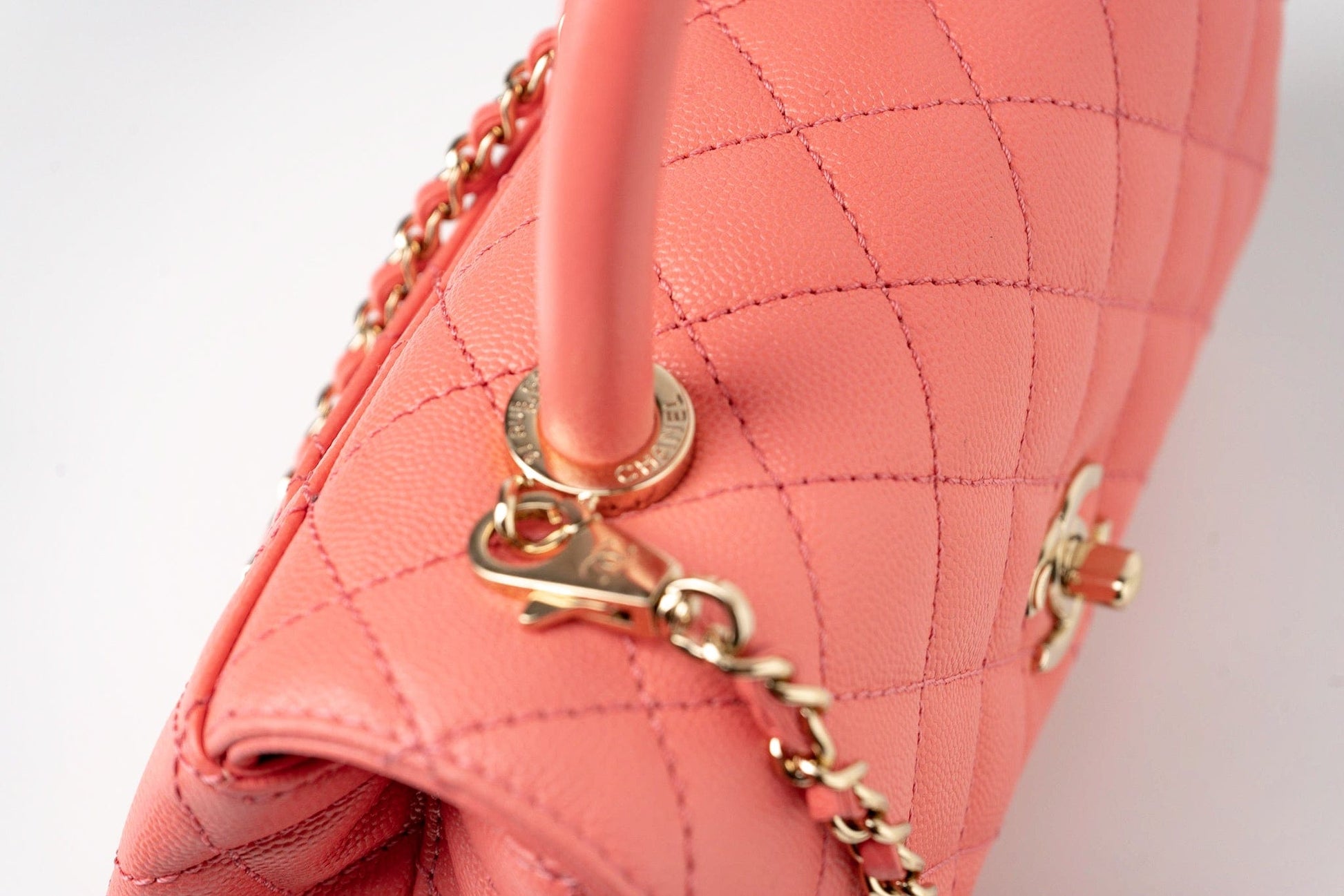Treat yourself to luxury with this iconic Pink Caviar Quilted Coco Handle Small bag. Crafted from ultra-vibrant, quilted coco leather and featuring light gold hardware, it's an authentic Chanel bag in a practical size perfect for everyday use. Enjoy a luxurious feel with functional style.