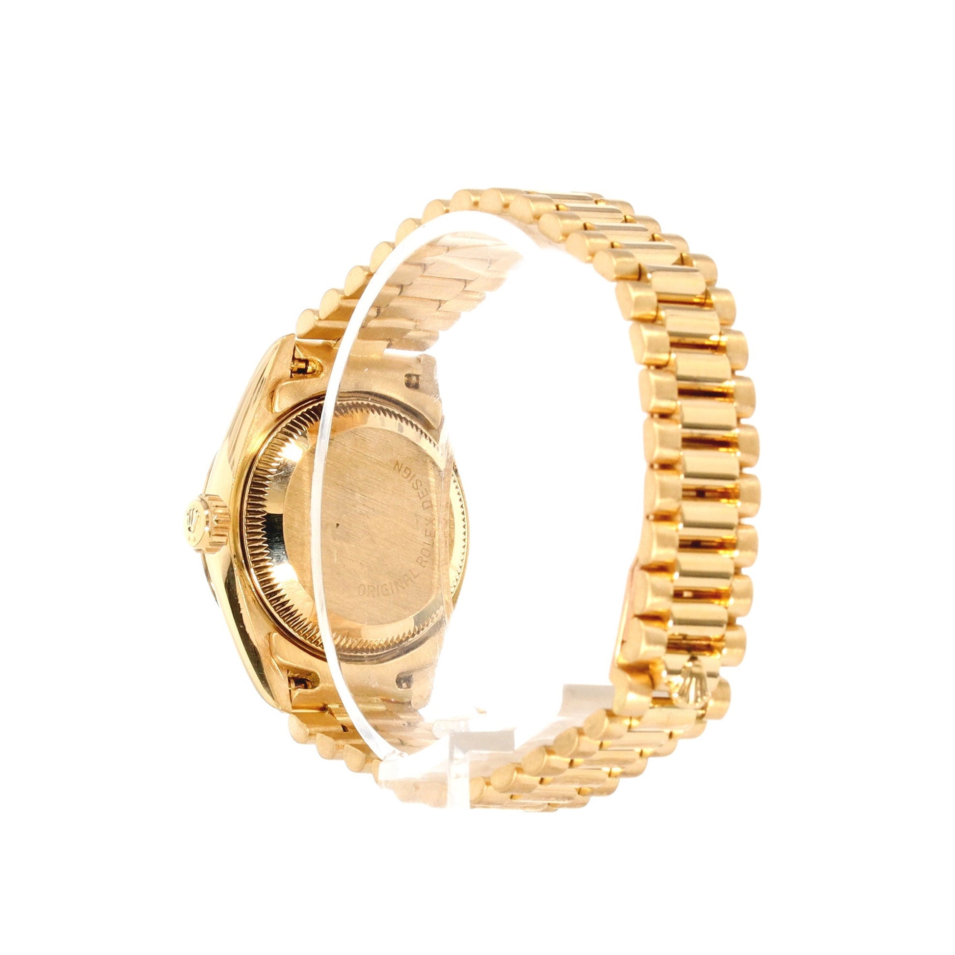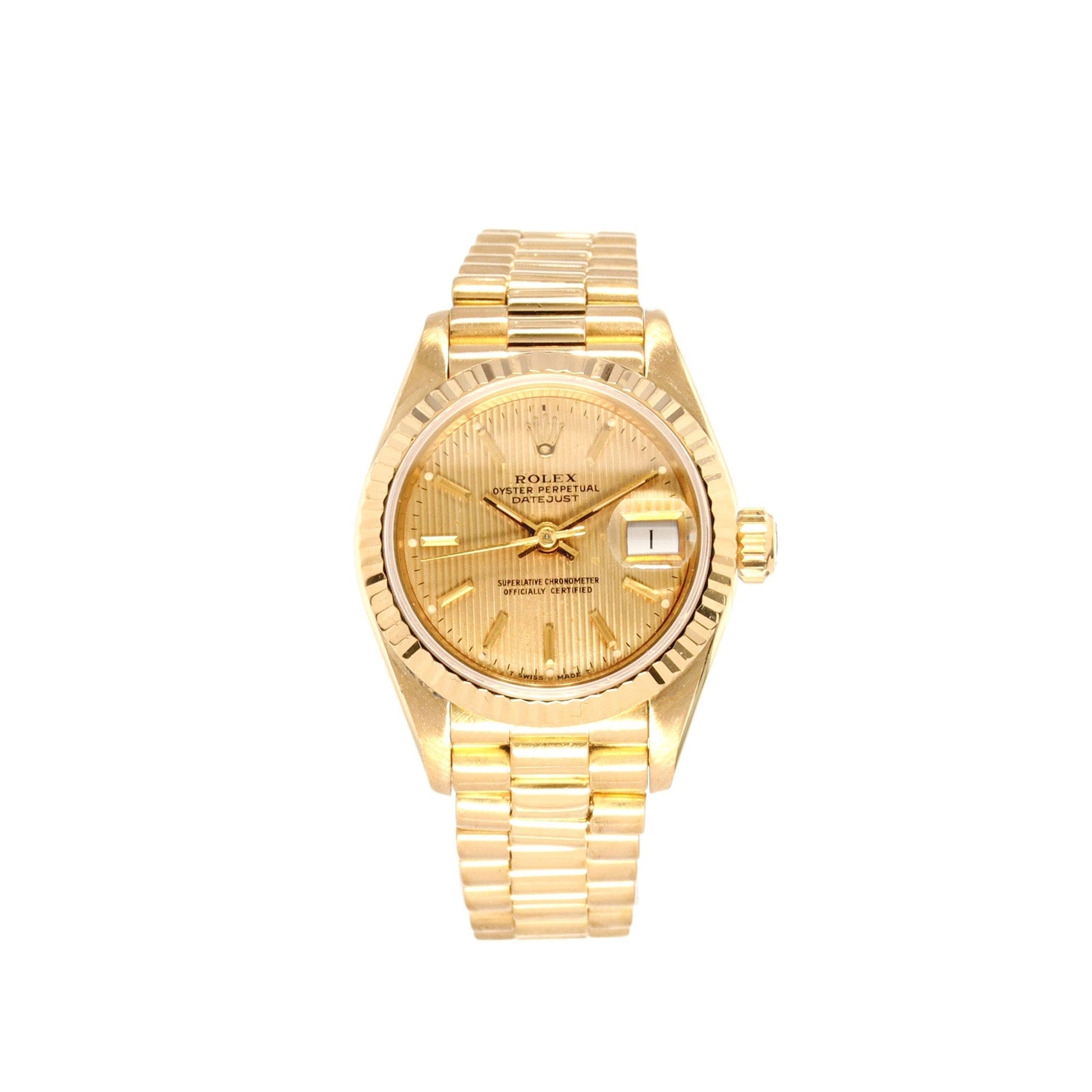 Rolex Datejust 26mm (ref. 69178, c. 1990) in 18k yellow gold with a Fluted bezel, Tapestry Dial and President bracelet.