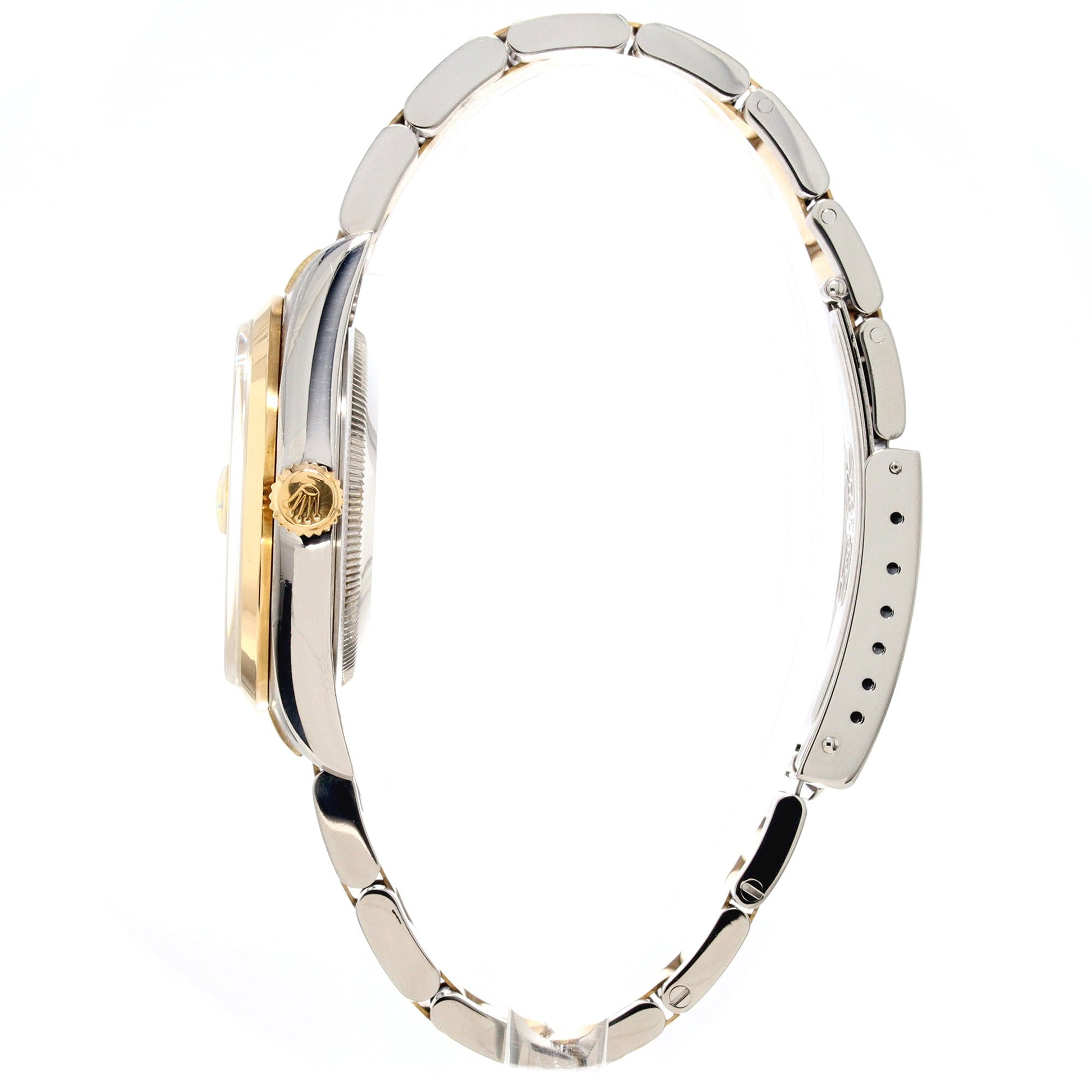 The Oyster Bracelet features polished gold center links and brushed and polished steel outer links, with a steel folding clasp.