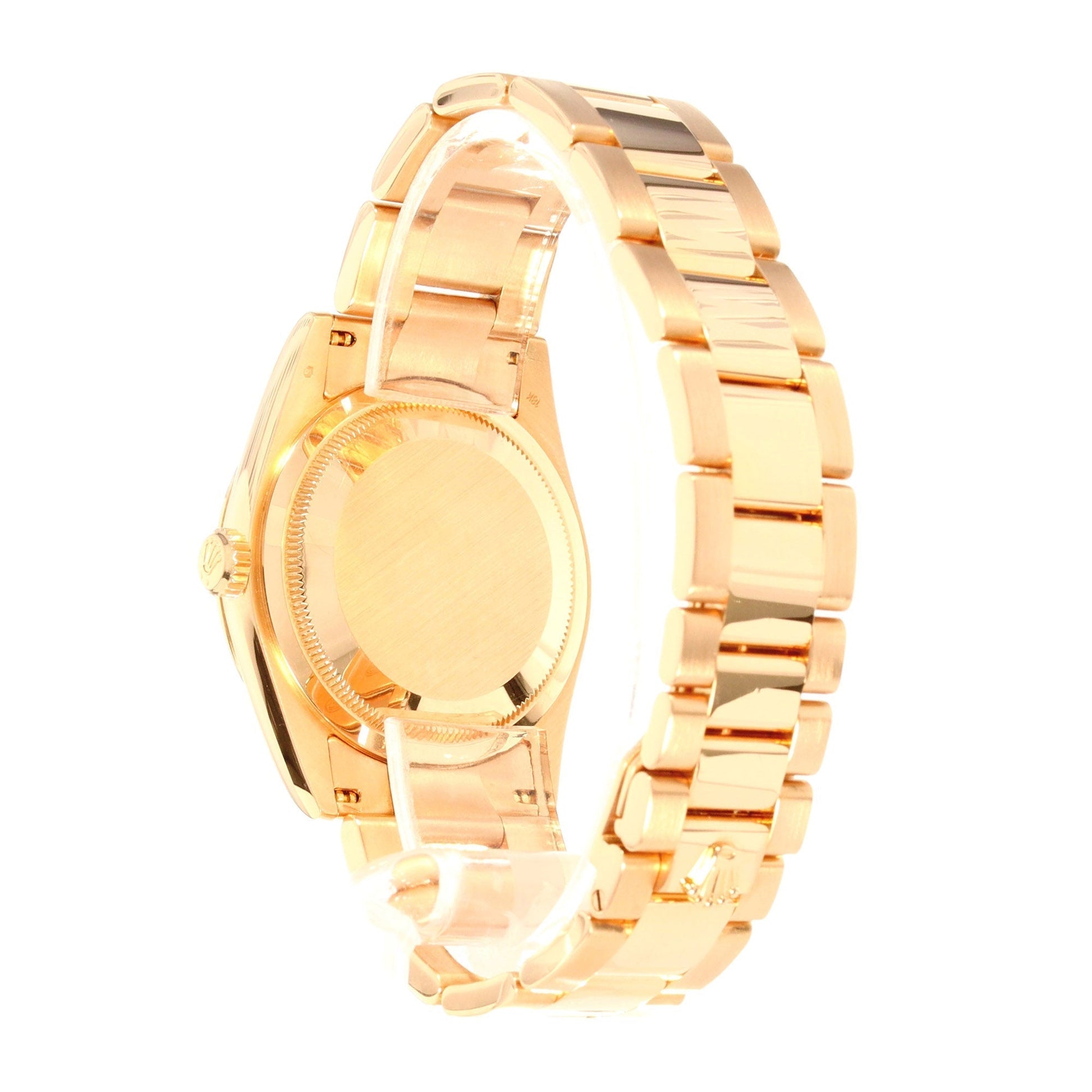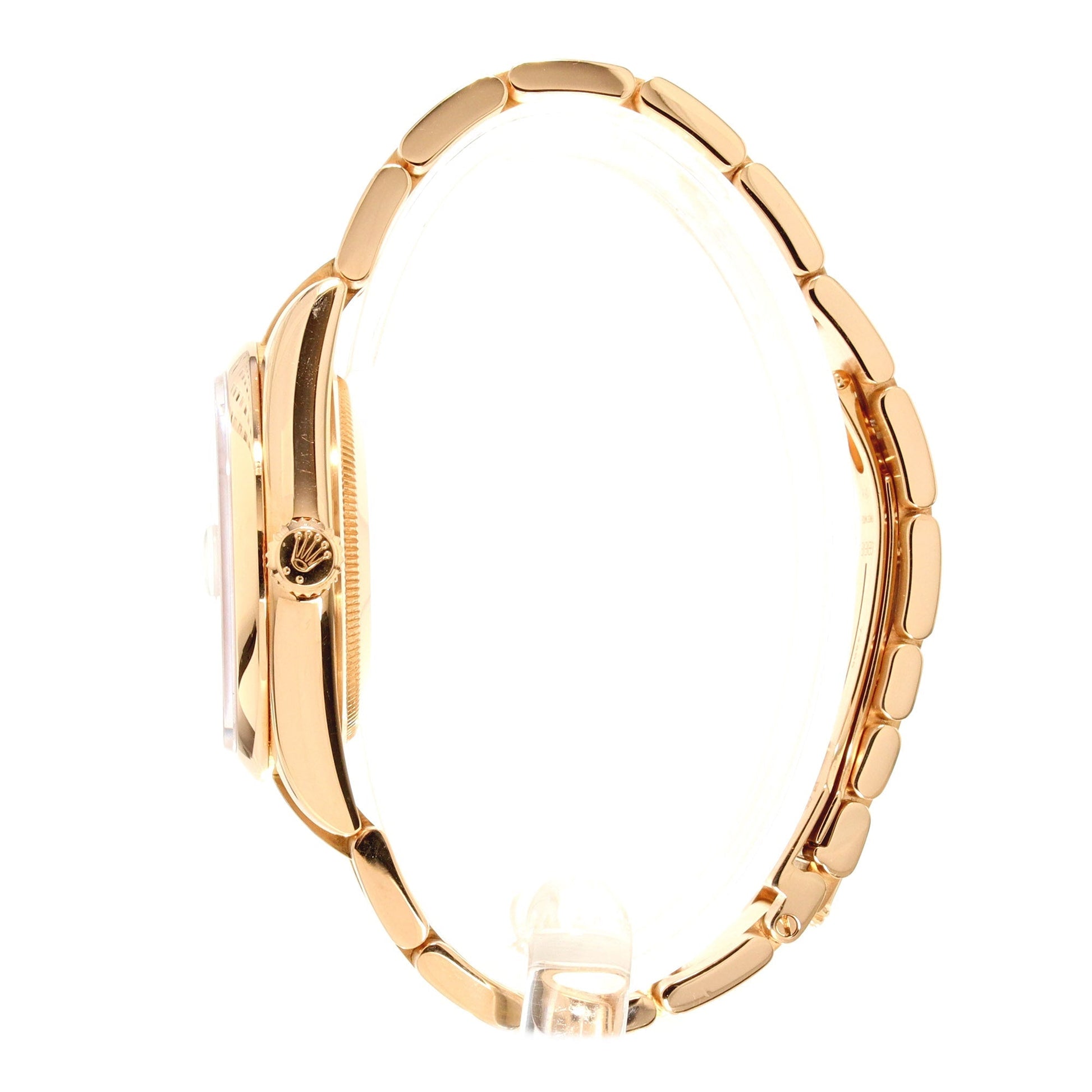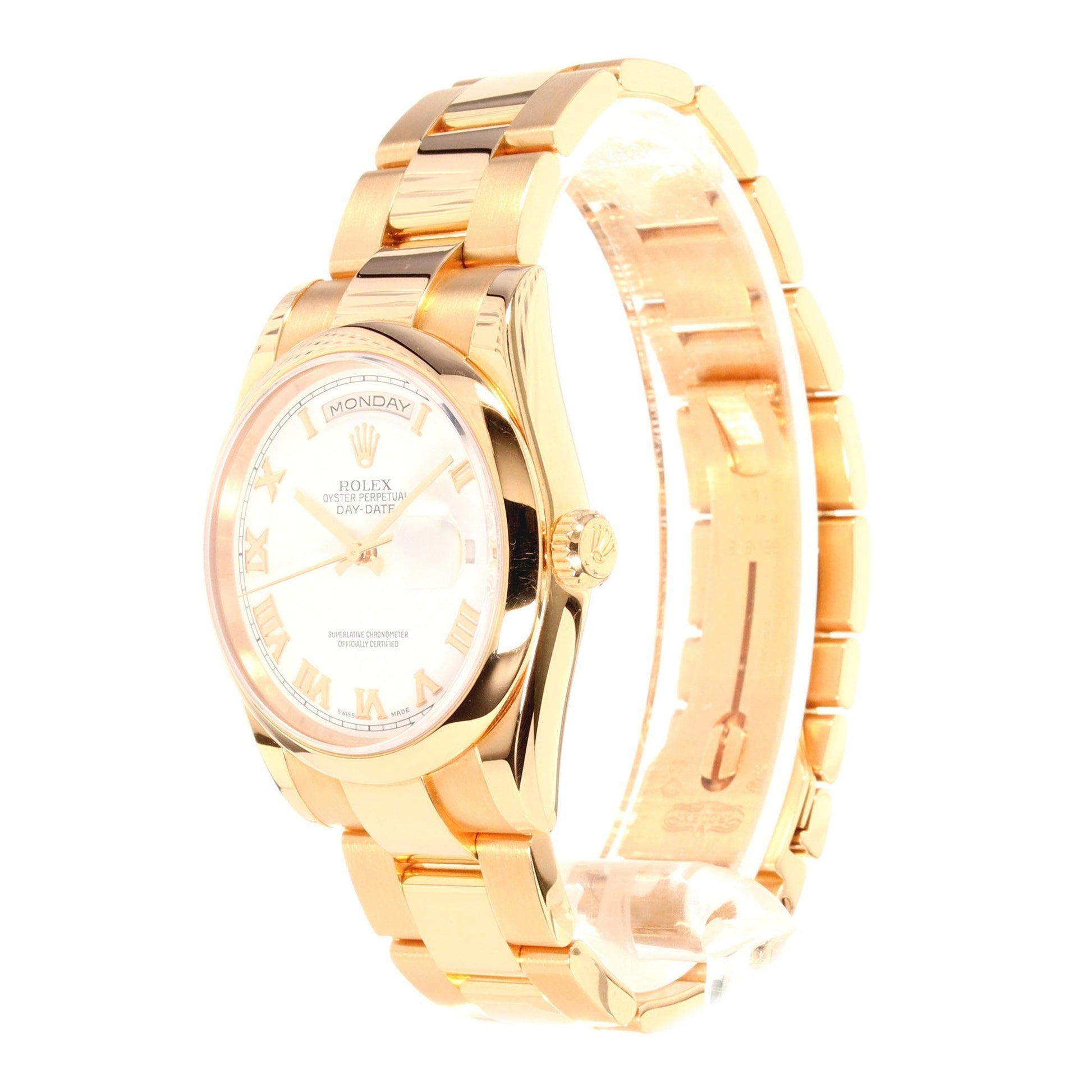Rolex Day-Date 36mm (ref. 118205) in 18kt Rose Gold with a domed bezel, White Dial with Roman Numerals, on a gold Oyster Bracelet with a hidden clasp.